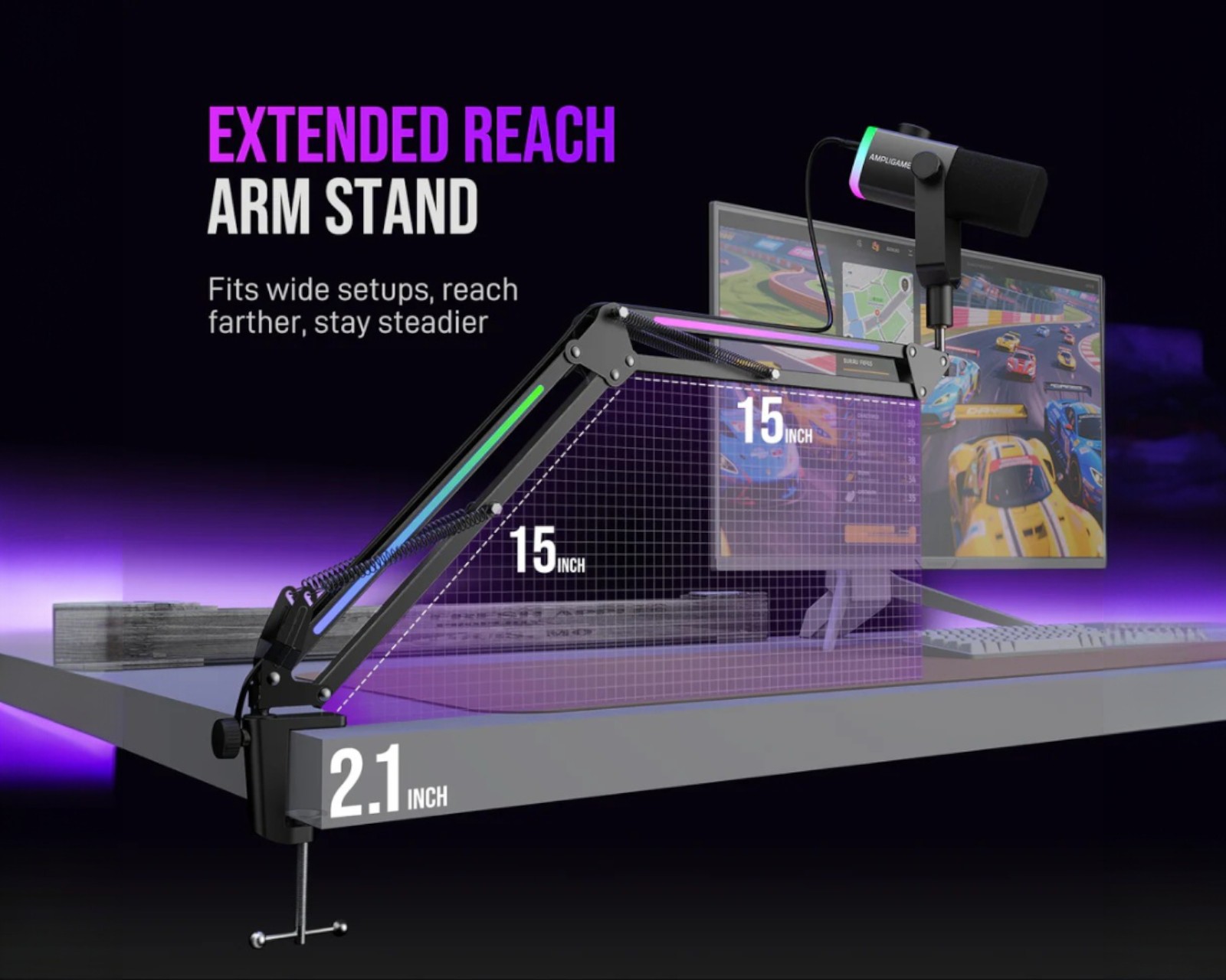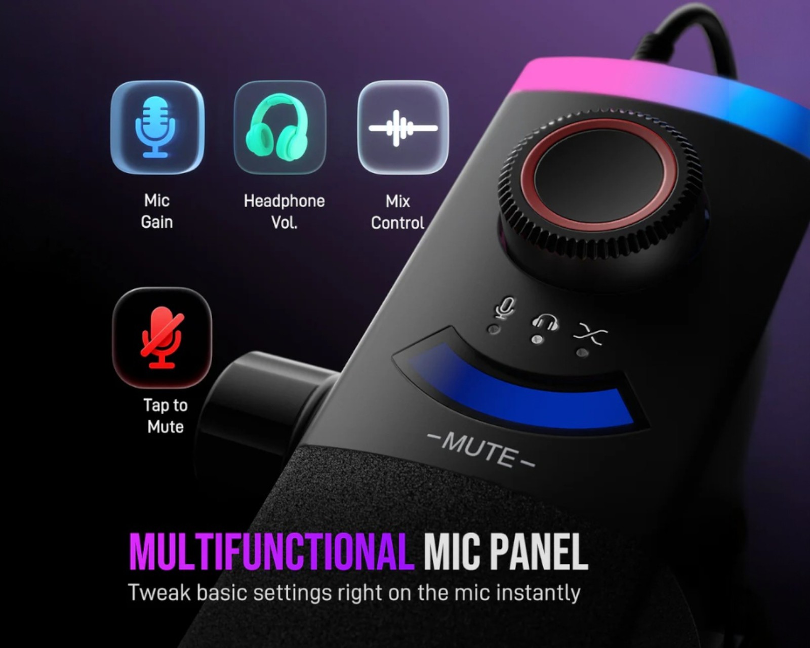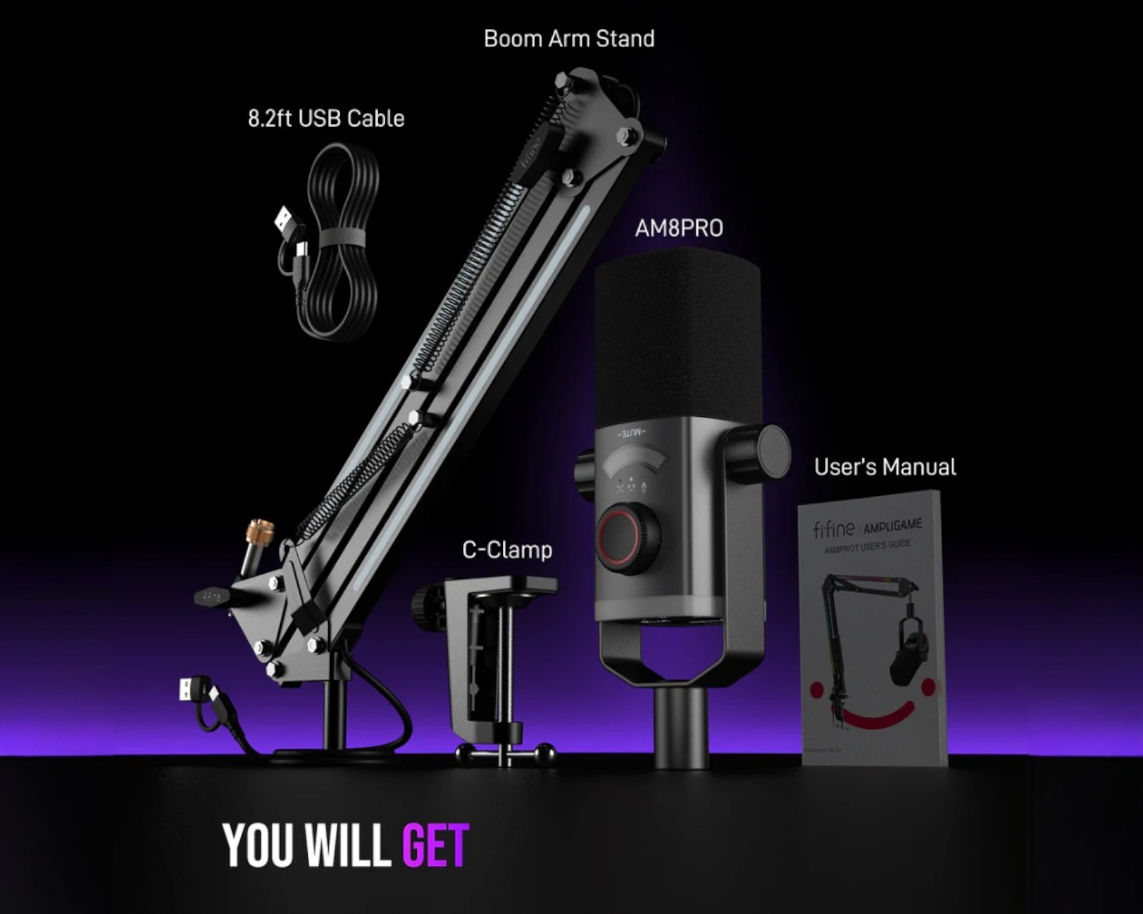 AmpliGame AM8PROT is a dynamic microphone from Fifine designed for content creators and streamers. The microphone features a uni-directional polar pattern that focuses on voice pickup, minimizing background noise. The frequency response ranges from 50Hz to 16kHz and it has a sensitivity of -50±3dB. The microphone is equipped with an RGB feature that includes three different modes and eight single-color light effects. It connects easily to computers via USB Type-C, enabling Plug&Play use. Additionally, a boom arm and a windscreen are included to enhance sound quality and user-friendliness. It is ideal for podcasts, livestreaming, and voice recording.The construction of the microphone includes a sturdy boom arm that allows flexible mounting options and a stable base to minimize vibrations. The included USB C to USB cable measures 6.5 feet (2 meters), providing sufficient length for various setups. With a maximum sound pressure level of 120dB (at 1kHz ≤1% T.H.D), it is capable of handling loud sound sources without distortion. The microphone delivers real-time monitoring and has a signal-to-noise ratio of ≥80dBA, ensuring clear and professional audio recording.