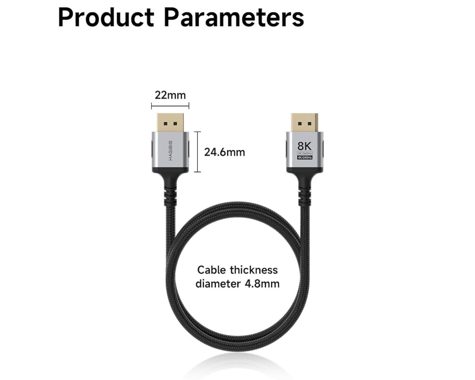 Hagibis 8K DisplayPort cable is a high-performance cable that supports resolutions up to 8K (7680x4320) at 60Hz and 4K at 240Hz. It is designed for gamers and users seeking a stable and high-quality image transfer. The cable's transfer speed reaches up to 32.4 Gbps and it offers support for Dynamic HDR, making the color levels more realistic and clear.The cable is constructed with a flexible, braided design which makes it durable and resistant to bending. With a core of 34AWG tinned oxygen-free copper and aluminum and graphite shielding, the cable can withstand signal interference and ensure stable image quality. It is compatible with most graphics cards and monitors with DisplayPort, maximizing performance without using extenders or adapters that may negatively affect the signal.