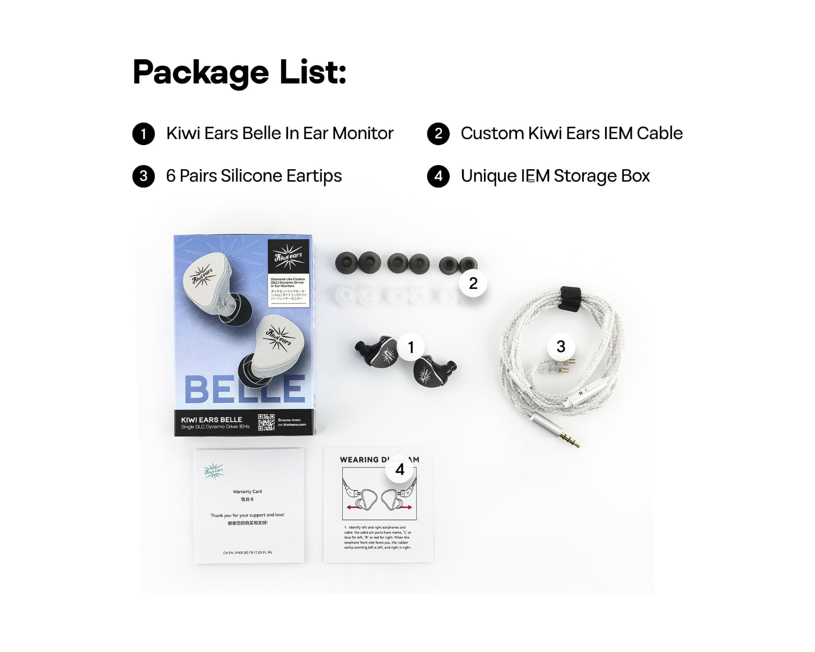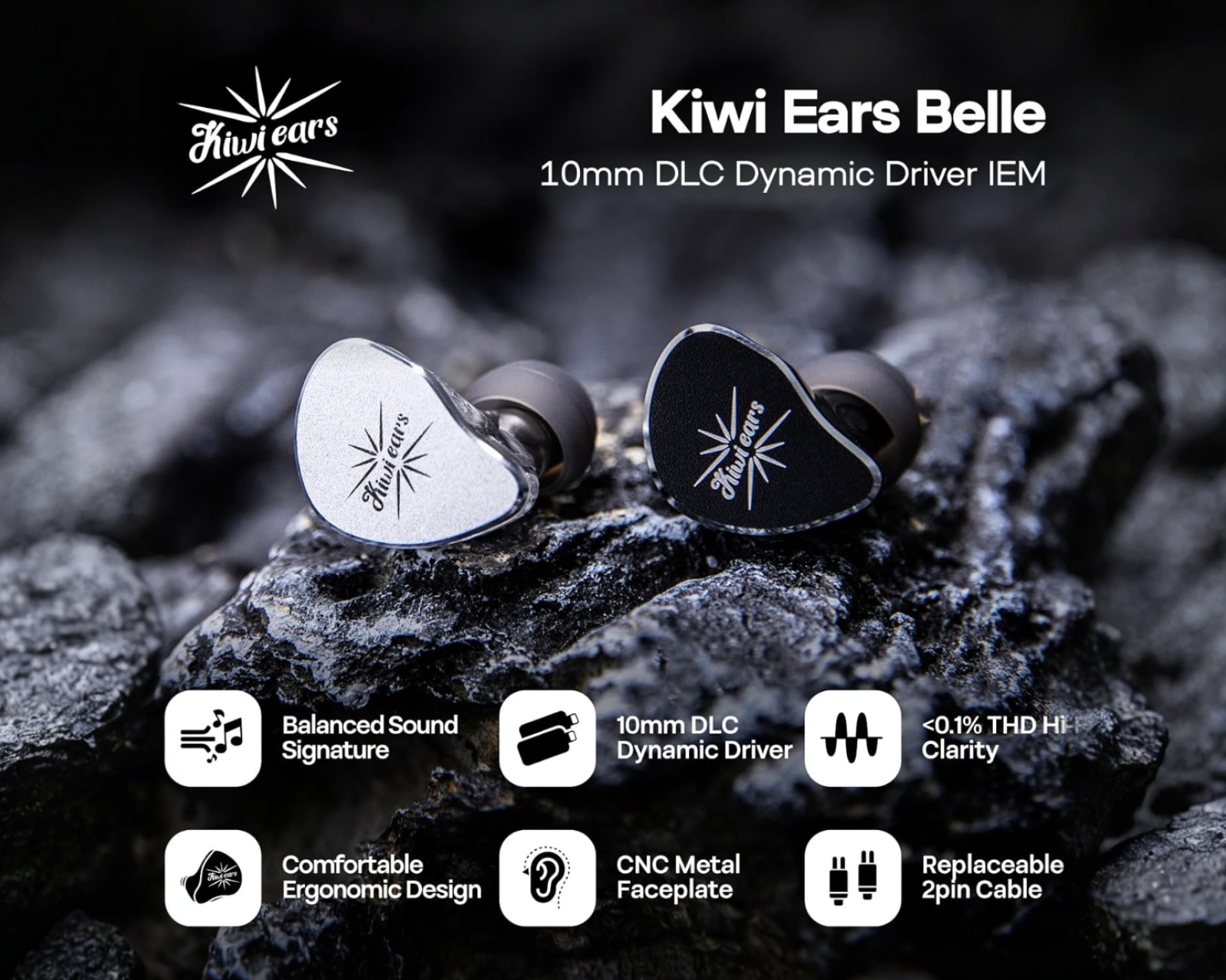 Kiwi Ears Belle is a professional in-ear monitor (IEM) that combines a 10 mm DLC dynamic driver with an appealing design and high sound quality. With an impedance of 32 Ohms and a balanced tonal signature, Belle is designed to provide an engaging listening experience, whether it’s for music production, gaming, or live performances. It is a versatile headphone that handles various music genres with deep bass and clear midrange, making it ideal for both audiophiles and professional users.Built with CNC-machined metal faceplates, Belle offers a premium feel and durability. The latest generation of Kiwi Ears Diamond-Like Carbon (DLC) diaphragm contributes to a snappier and more responsive sound reproduction, with a total harmonic distortion (THD) of less than 0.1% at 1 kHz. Cable options include Type C and 3.5 mm, providing flexibility depending on device usage. The silver-plated cable maximizes signal transmission and the ability to reproduce high-frequency details, delivering a superior sound experience. Belle is intended for those seeking the best sound while on the go and during live performances.