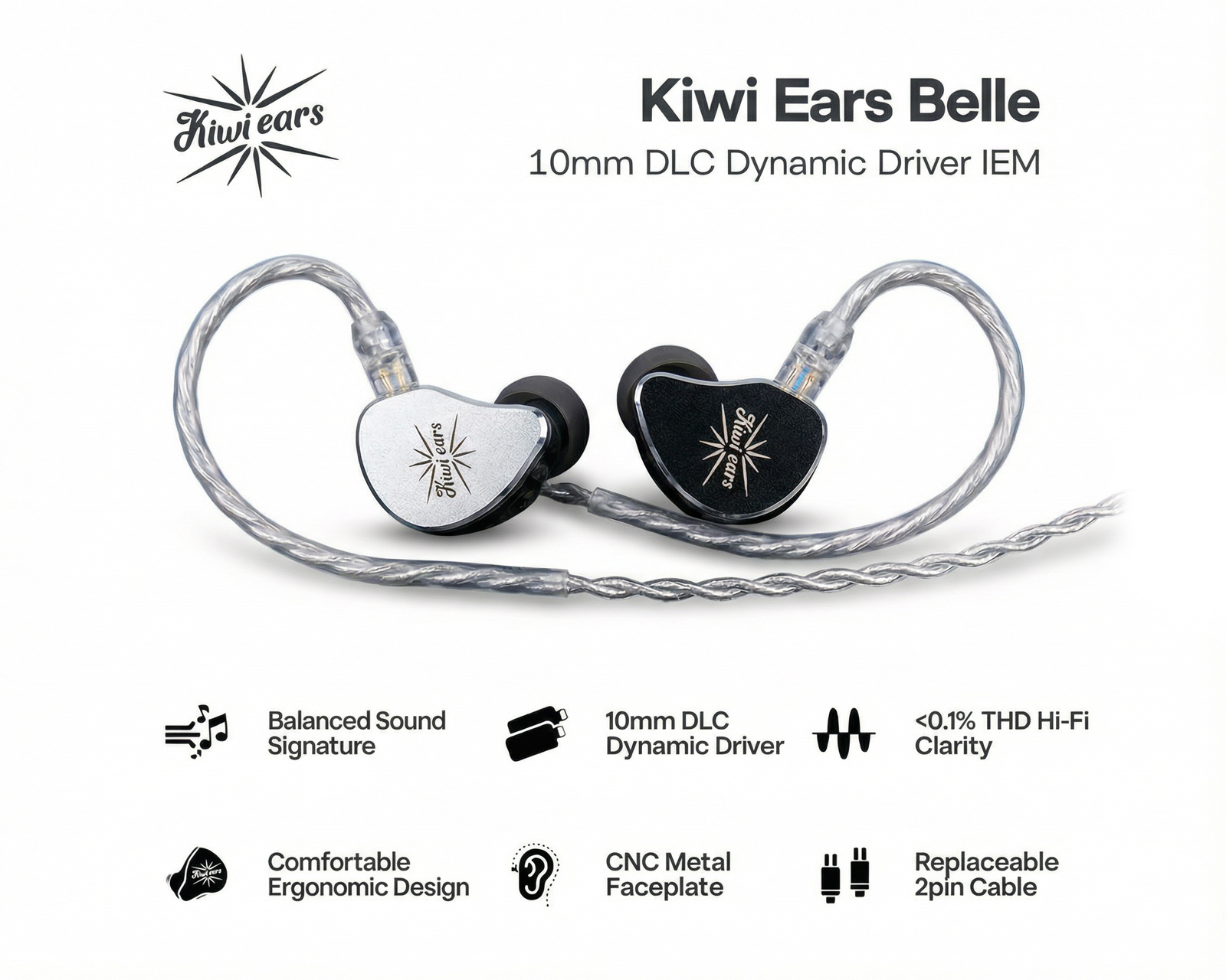 Kiwi Ears Belle is a professional in-ear monitor (IEM) that combines a 10 mm DLC dynamic driver with an appealing design and high sound quality. With an impedance of 32 Ohms and a balanced tonal signature, Belle is designed to provide an engaging listening experience, whether it’s for music production, gaming, or live performances. It is a versatile headphone that handles various music genres with deep bass and clear midrange, making it ideal for both audiophiles and professional users.Built with CNC-machined metal faceplates, Belle offers a premium feel and durability. The latest generation of Kiwi Ears Diamond-Like Carbon (DLC) diaphragm contributes to a snappier and more responsive sound reproduction, with a total harmonic distortion (THD) of less than 0.1% at 1 kHz. Cable options include Type C and 3.5 mm, providing flexibility depending on device usage. The silver-plated cable maximizes signal transmission and the ability to reproduce high-frequency details, delivering a superior sound experience. Belle is intended for those seeking the best sound while on the go and during live performances.