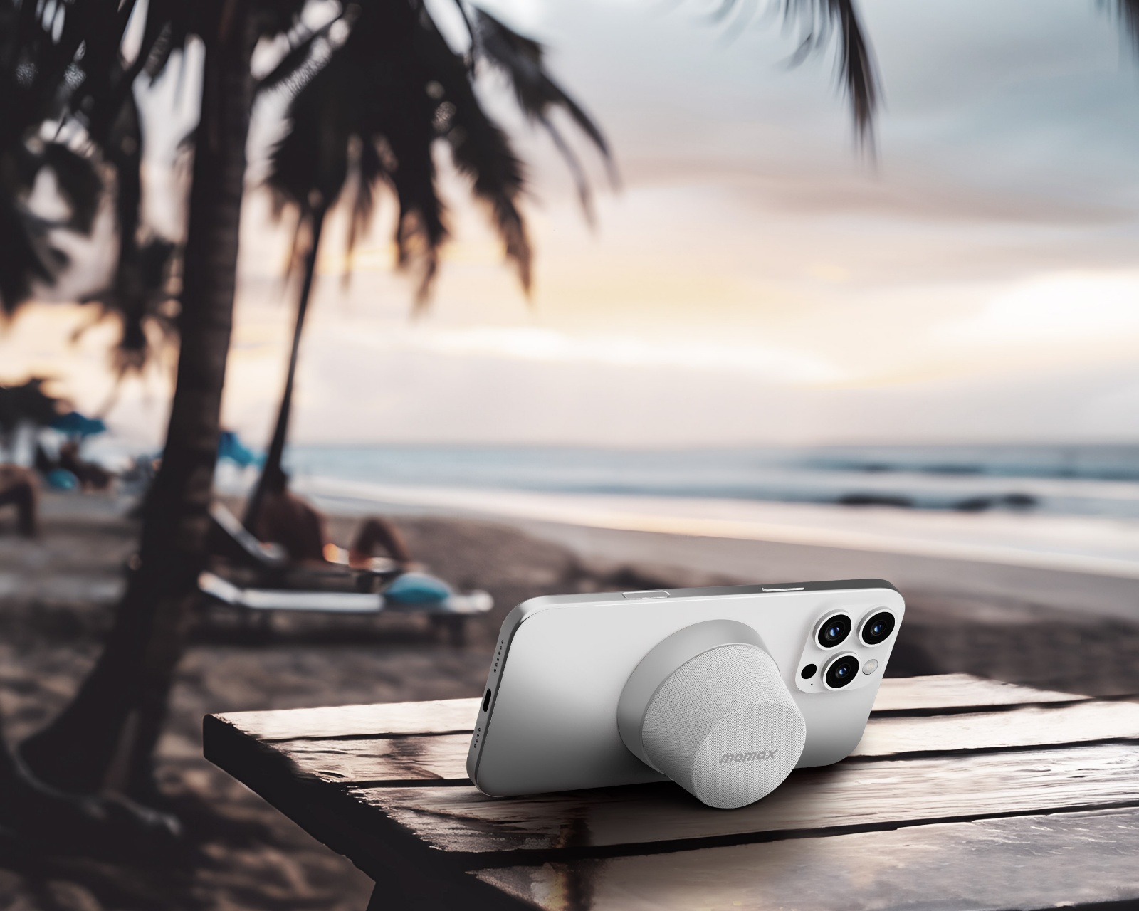 The 1-Vibe Go Magnetic Wireless Speaker is a portable speaker from Momax that provides a practical audio solution for modern users. Designed to easily attach to metal surfaces and MagSafe-compatible devices, it delivers an excellent listening experience wherever you are. Its IPX6 water-resistant protection allows it to withstand splashes and moisture, making it ideal for outdoor activities.