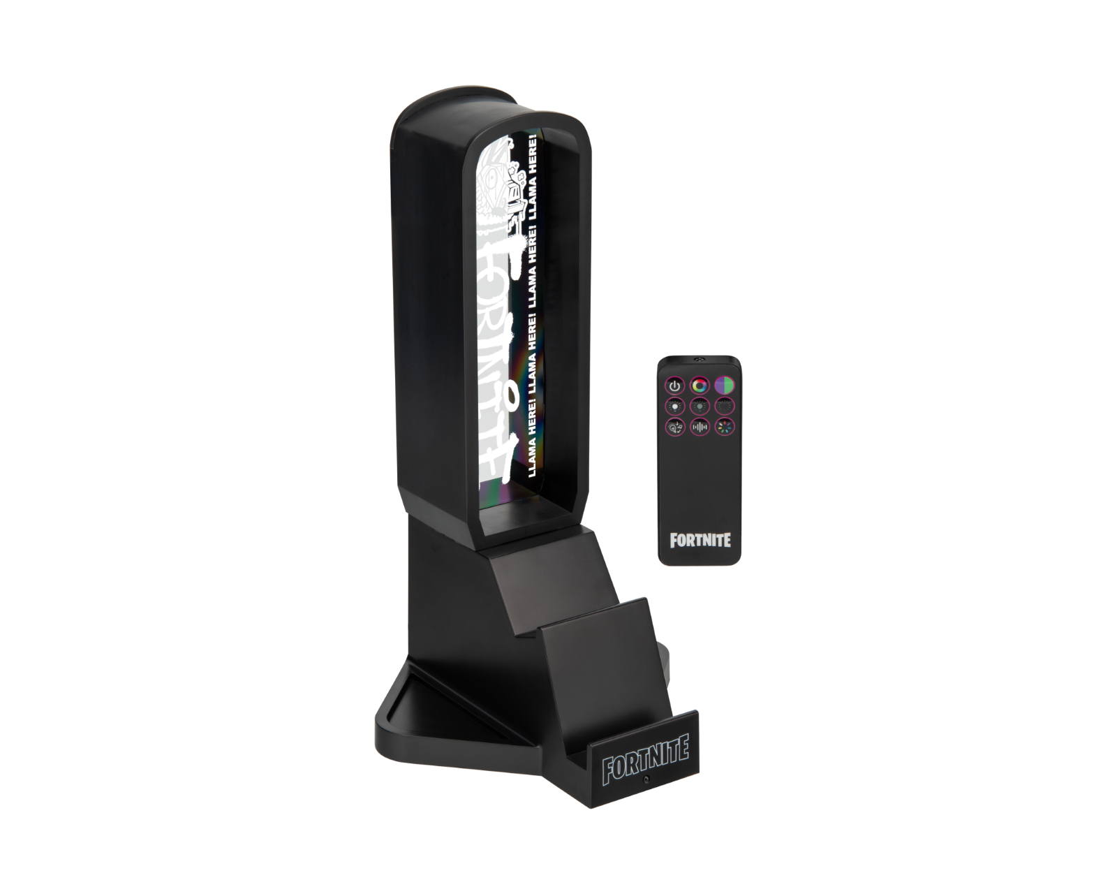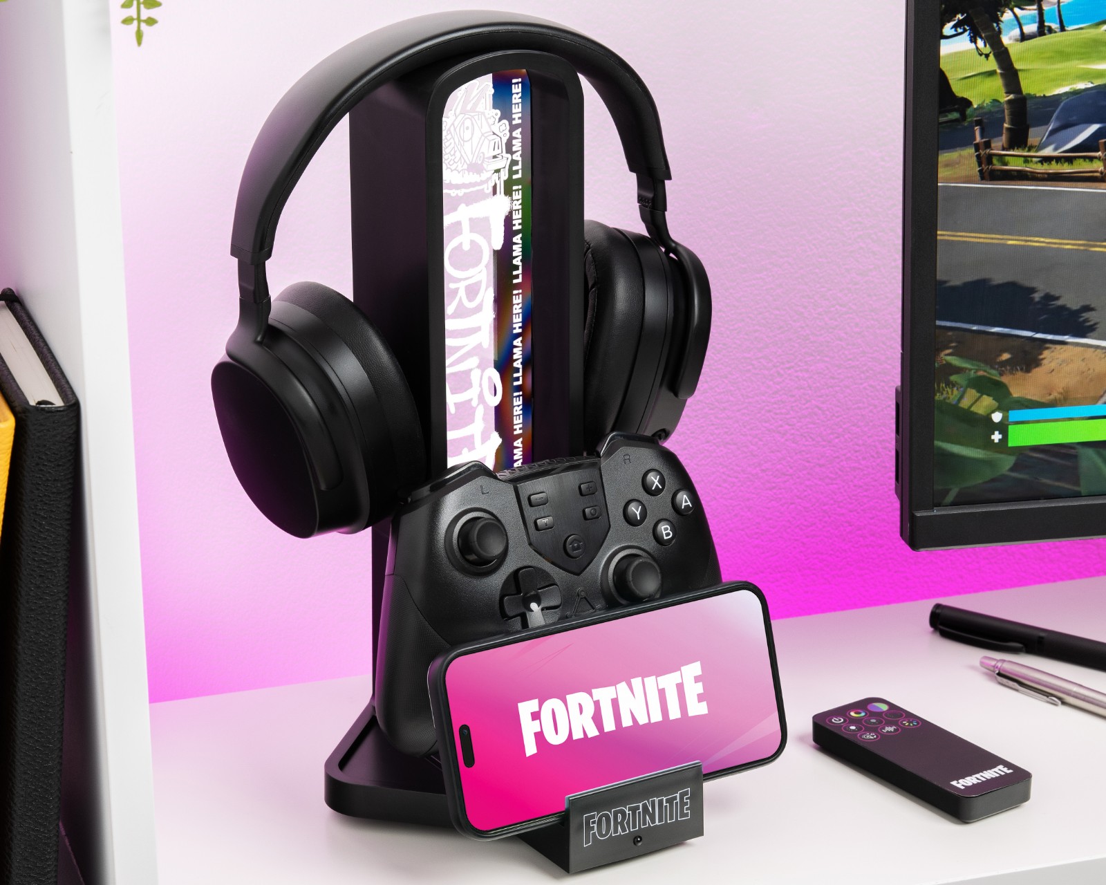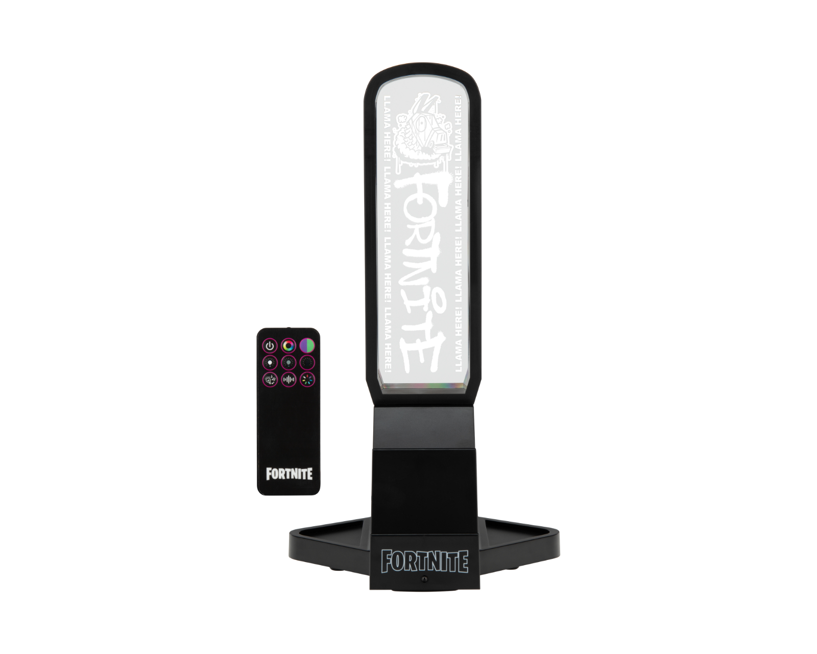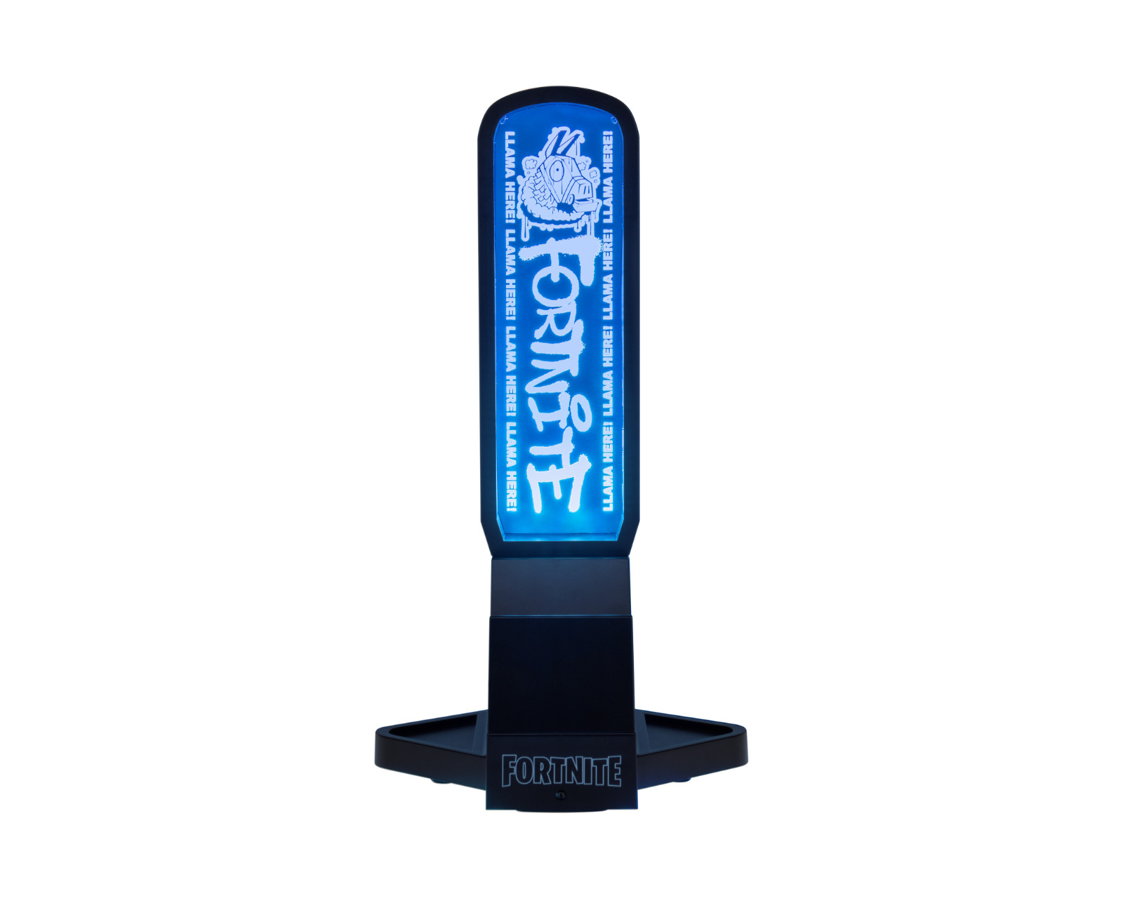 Fortnite Desk Headphone Stand with Lights from Paladone combines function and style. Standing at 30 cm tall, the stand not only provides a secure hold for your headset but also serves as a holder for game controllers and phones, helping to maximize your desk space. Equipped with two USB-C charging ports, you can quickly and easily charge multiple devices at the same time, which is a practical solution in a gamer environment.Built to meet the needs of both casual and hardcore gamers, the Fortnite Desk Headphone Stand with Lights features an RGB LED light panel that can be set to three different brightness levels. The music-reactive feature and color-changing mode contribute to a dynamic atmosphere during your gaming sessions. Everything is smoothly controlled via the included remote control, and the permanently connected USB cable ensures that you always have power for the lighting. This device combines aesthetics with practical features to create a complete workstation for the gamer.