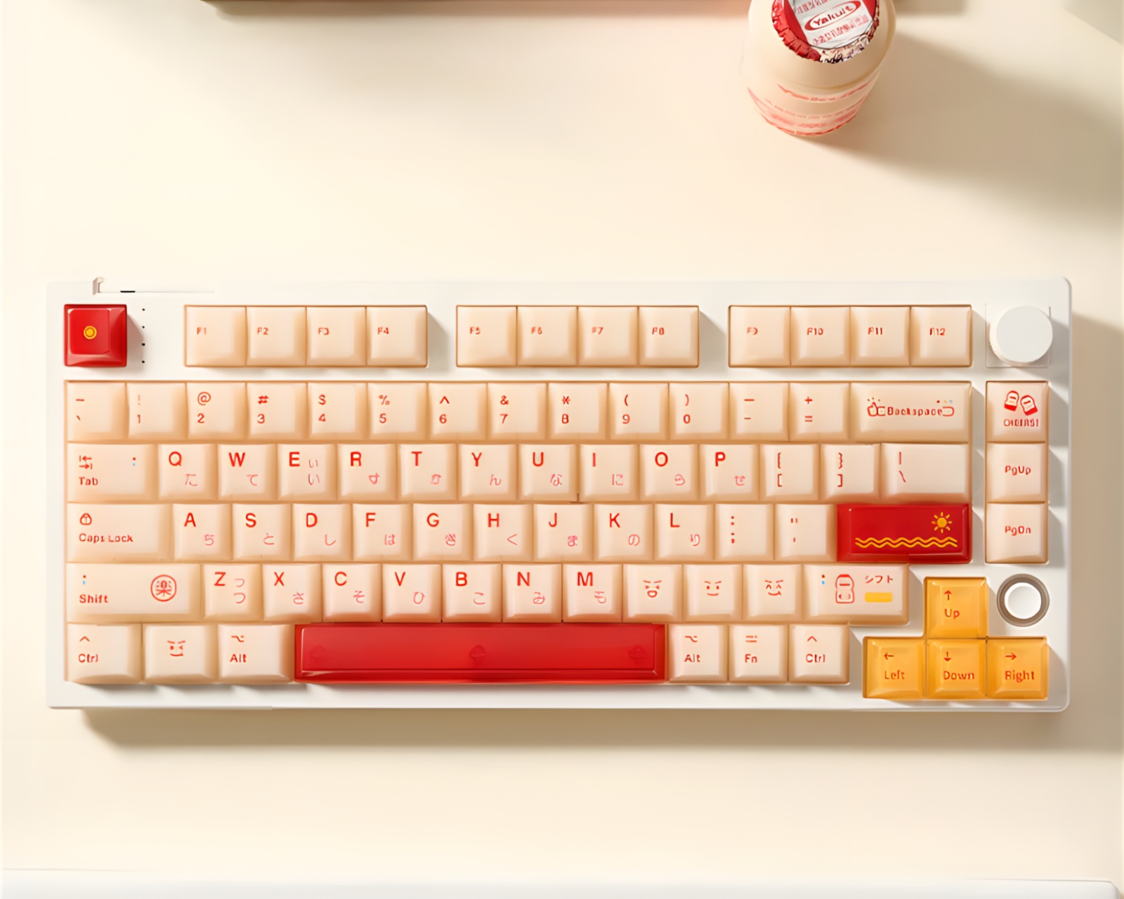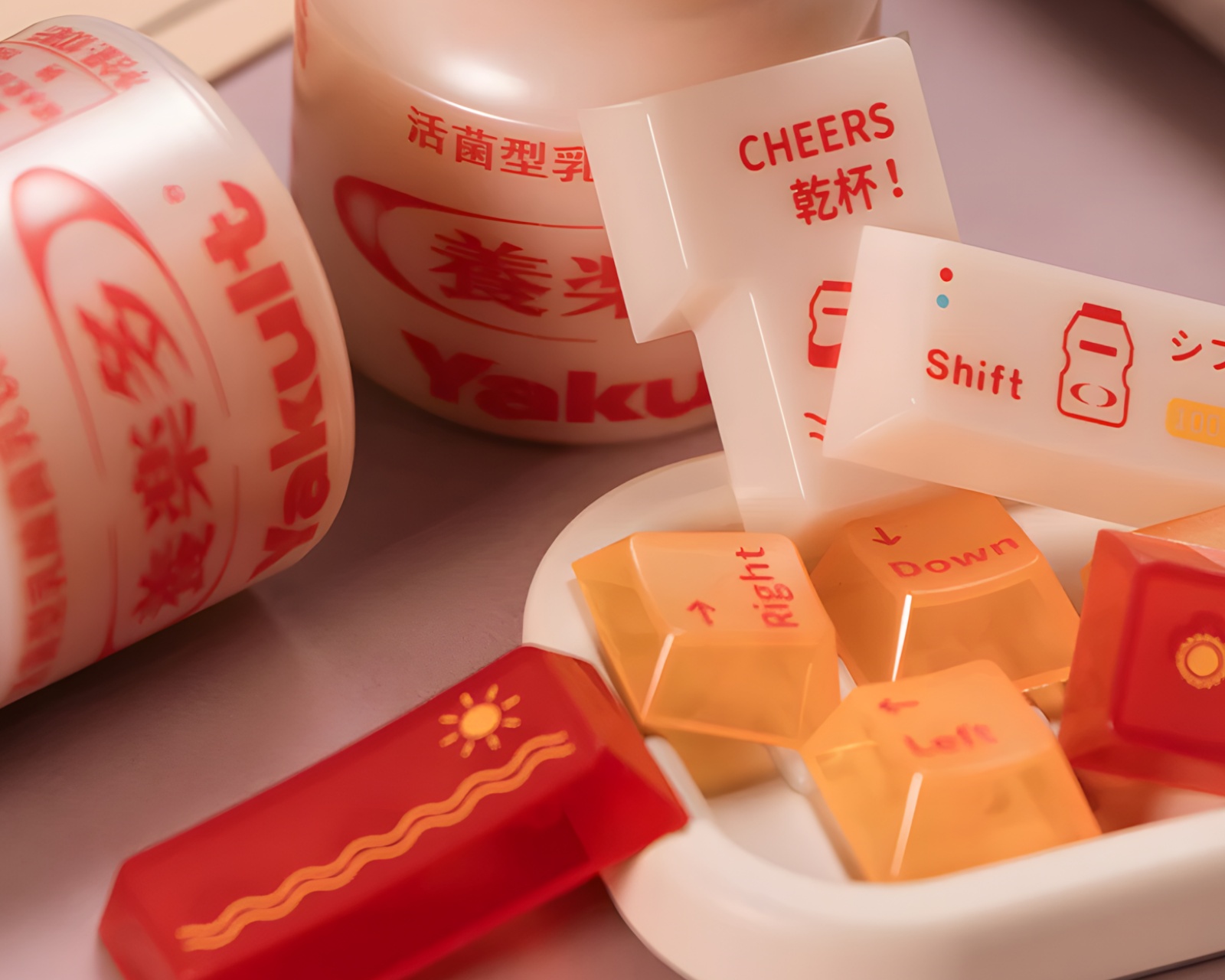 Cheers! Keycap set from Keymoji that offers a visual nostalgia trip inspired by the iconic probiotic drink Yakult. With its classic milk-white bottle, light yellow and vibrant red details, this set recreates a fresh and playful aesthetic that brings to mind happy memories of sipping on Yakult. Consisting of 148 keys with a Cherry profile and compatible with MX switches, this keycap set is perfect for all types of use, whether for gaming, work, or studying.Made of high-quality PC plastic, these keycaps are durable and resistant to wear, making them suitable for daily use in gaming or office environments. The colorful design with its simplified patterns, fun icons, and hidden emojis gives each key a playful character that brightens up every keystroke. Thanks to the injection molding manufacturing method, the colors are ensured to be vibrant and long-lasting. These keycaps are not only practical but also a fantastic collectible for any keyboard enthusiast.