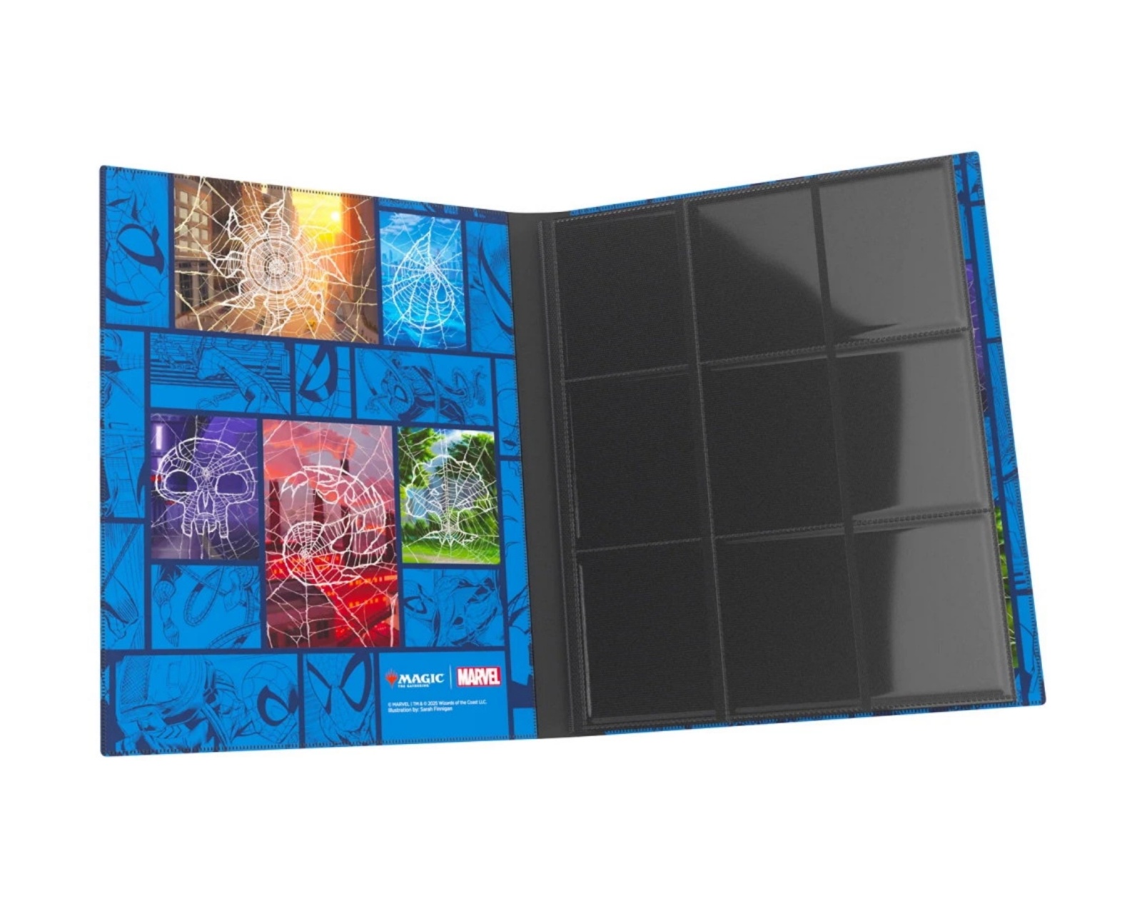 18-Pocket Album is a collector's album from Magic: The Gathering that offers an efficient solution for organizing and storing valuable cards. With its colorful cover featuring high-quality full-art prints, it is specifically designed to accommodate cards in double sleeves. It has 20 pages, with each page containing 18 side-loading pockets, providing a total capacity of 360 cards. The album is equipped with black pages and an elastic strap with reinforced seams, offering an elegant and secure closure. The product size is 245 x 25 x 305 mm.The build quality of the album is high and it is optimized for Gamegenic Sleeves, meaning that using other brands may affect capacity and compatibility. The pages are durable and designed to protect the cards from damage and dirt. The extra wide strap with reinforcements ensures that the album remains closed even when full, making it practical for gamers who desire a robust and functional solution for their card collection.