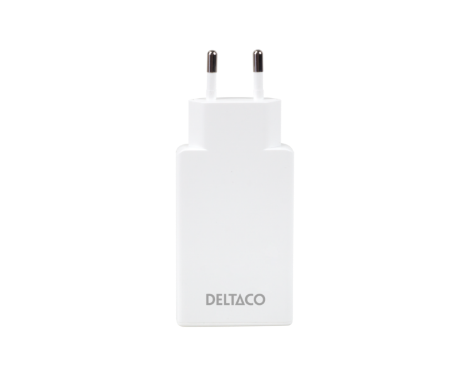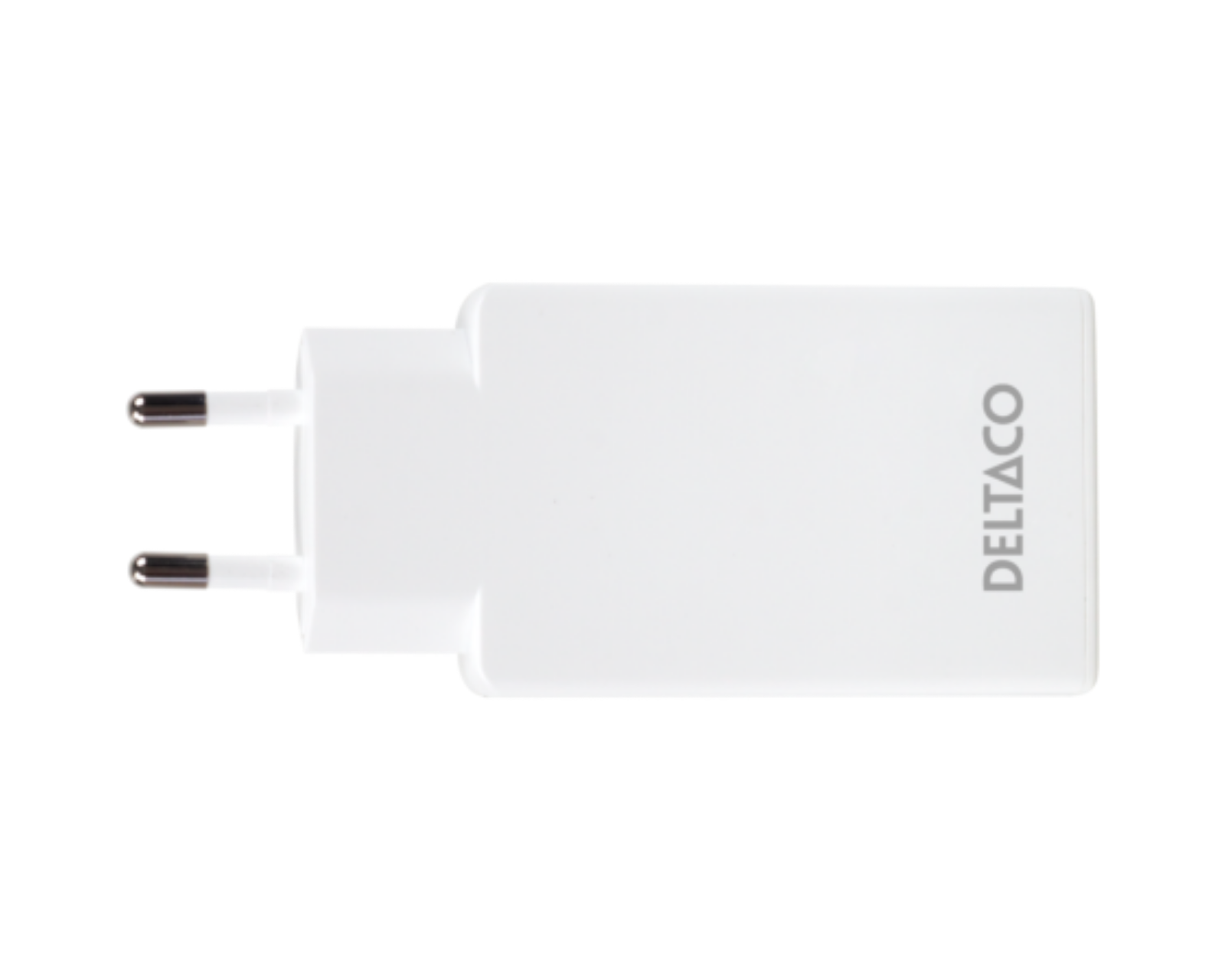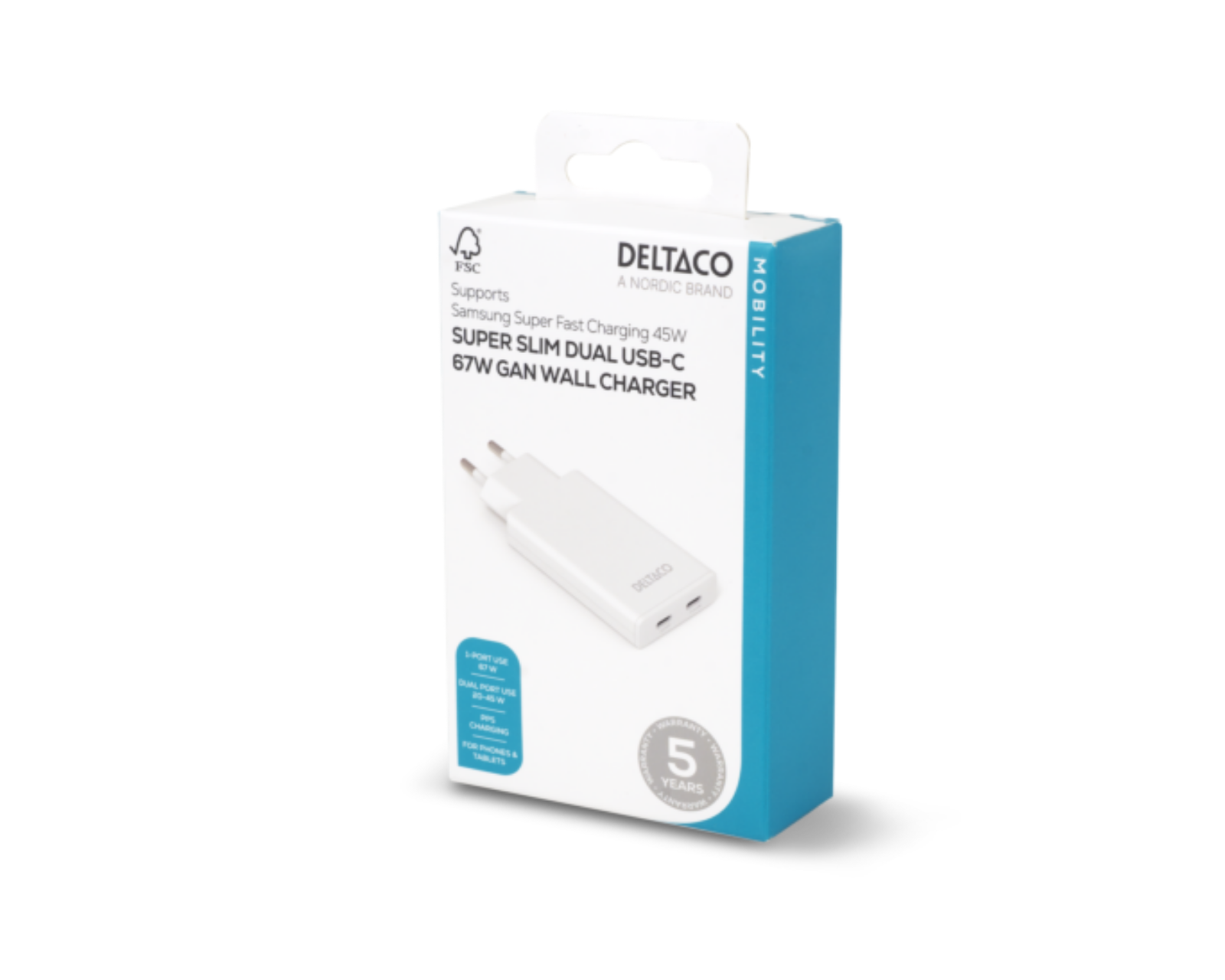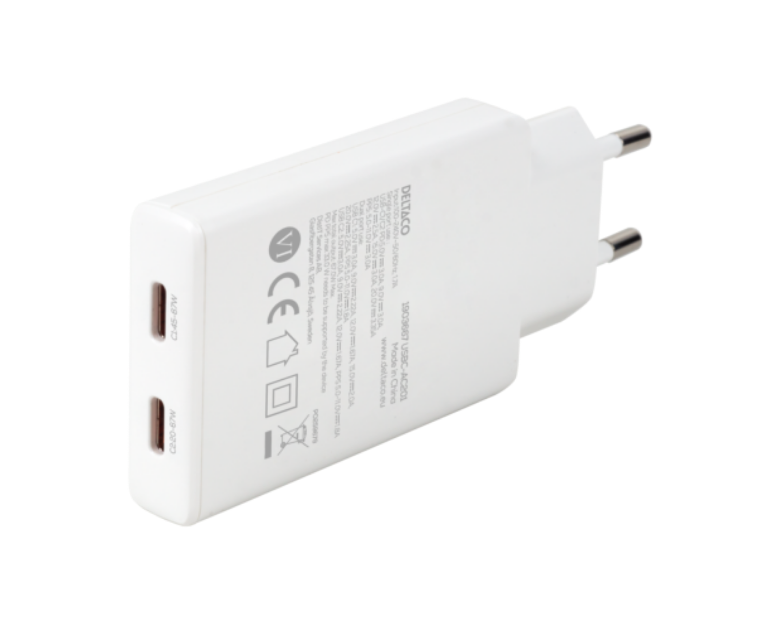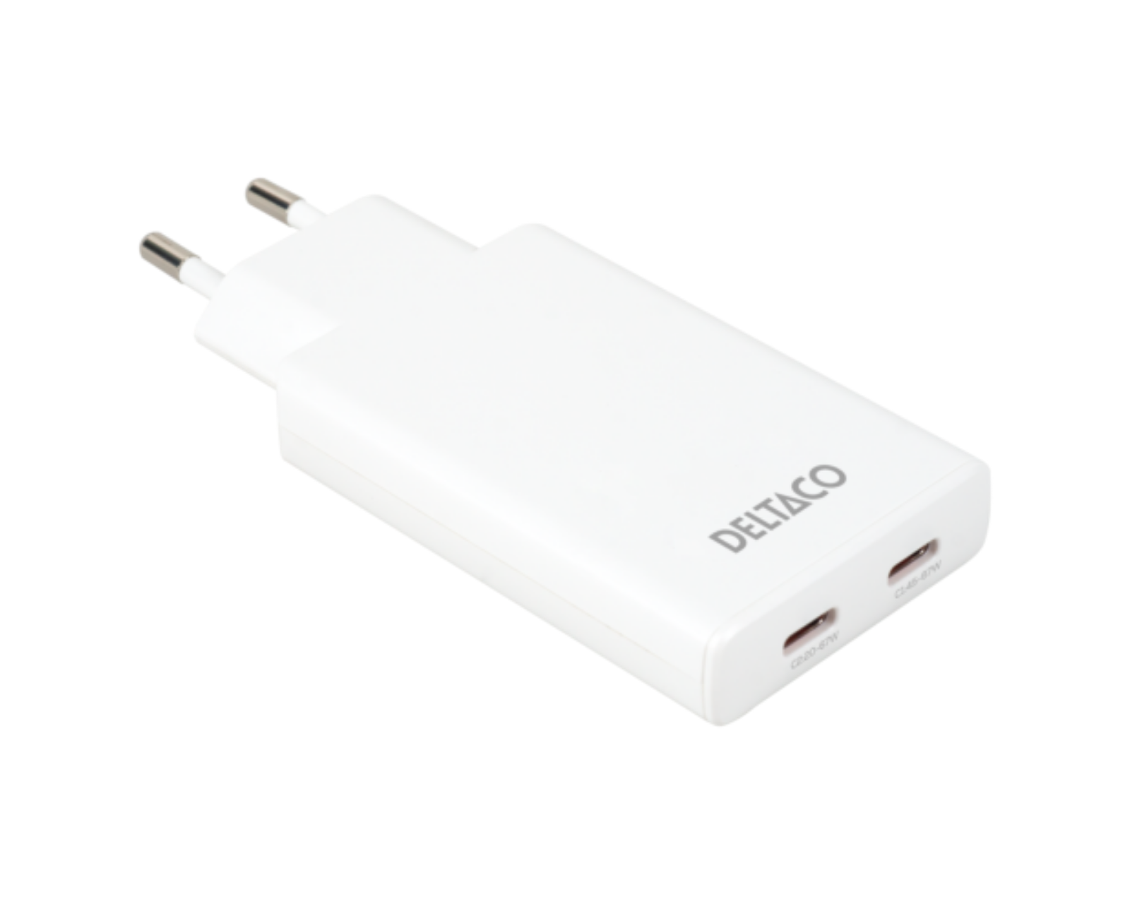 67W 2x USB-C wall charger is a wall charger from Deltaco that offers fast and efficient charging with a total power of 67 W. It is equipped with two USB-C PD ports, making it suitable for charging phones, tablets, and laptops. The ports can be used individually or together, allowing for flexibility in charging options.The charger supports PPS charging which optimizes current and voltage in real-time depending on the device's charging status. When one port is used, it can deliver up to 67 W, and when both ports are used, the maximum output is 45 W for port C1 and 20 W for port C2. The charger's slim design makes it perfect for travel, and it requires that the device being charged supports PPS for optimal results.