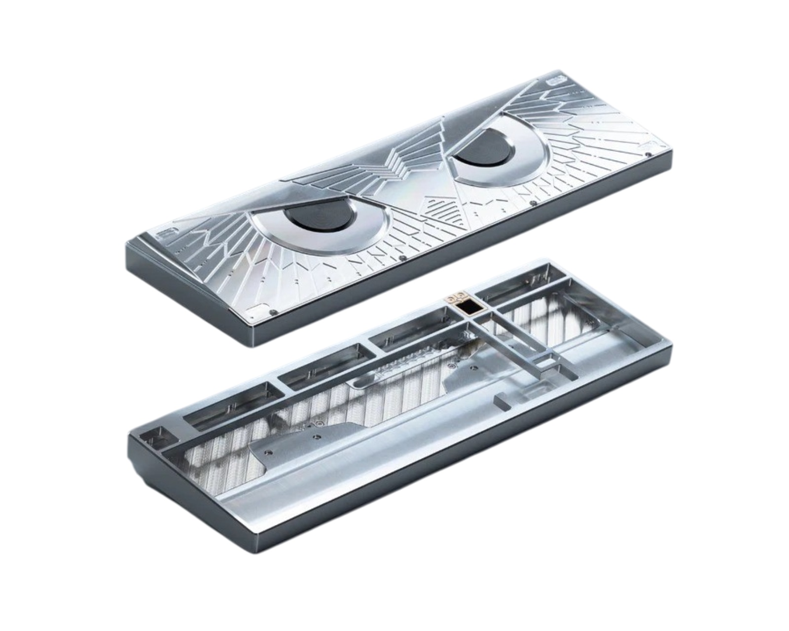 Athena 1800 is a mechanical barebone keyboard from KBDfans that combines technology and design. It features a modern 1800 layout with an LED screen that allows for customization such as GIF animations. The keyboard targets enthusiasts with higher demands for both typing experience and aesthetics.The keyboard has a solid build quality in anodized aluminum and is offered with various options for inner plates, including stainless steel, brass, and carbon fiber. There are multiple mounting options such as top mount and PCB silicone rubber gaskets that provide either a firm and direct typing experience or a more dampened and sound-insulated feel. The design also includes a carefully engraved owl motif on the backplate as well as a light diffuser that creates a subtle backlighting.