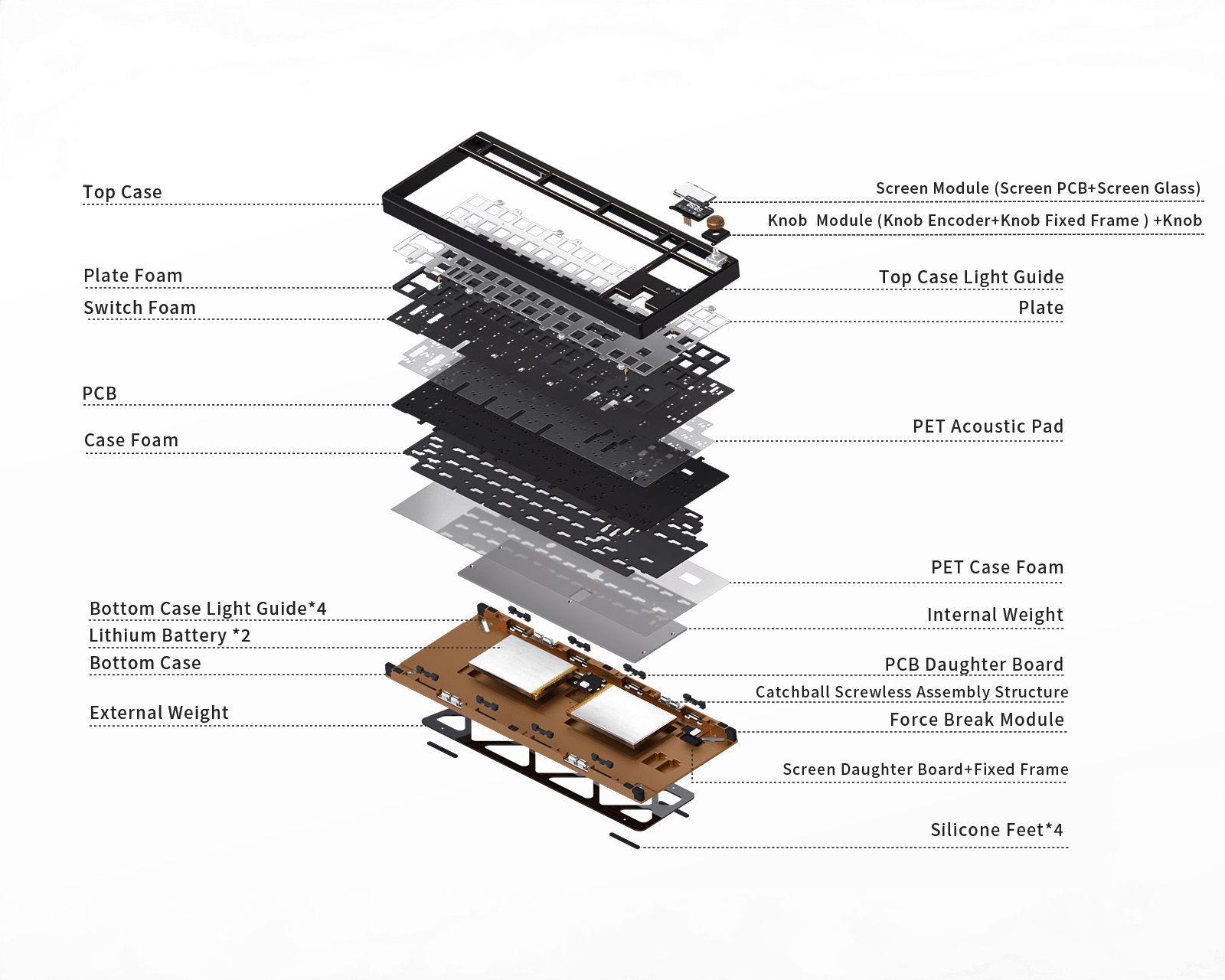 Note that the keyboard requires assembly, no switches and keycaps included.ZOOM TKL DYNA is a barebones kit from Wuque Studio that offers a versatile user experience. Its modular design allows for adjustments to the screen and controls, giving users the freedom to customize their settings. The device features a 6063 aluminum casing and a screw-free ball joint system for easily switching between different mounting options. It supports both wired connection via USB-C as well as wireless via Bluetooth 5.4 and 2.4 GHz.