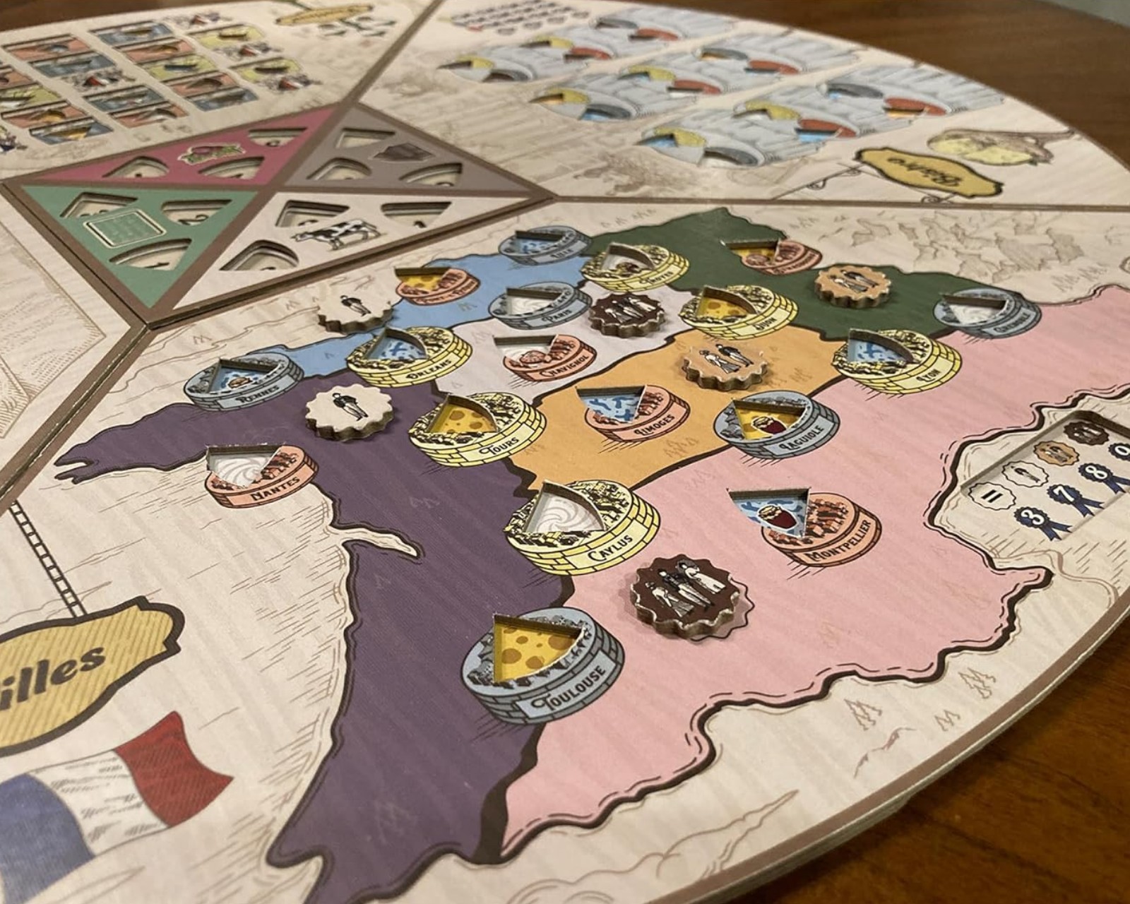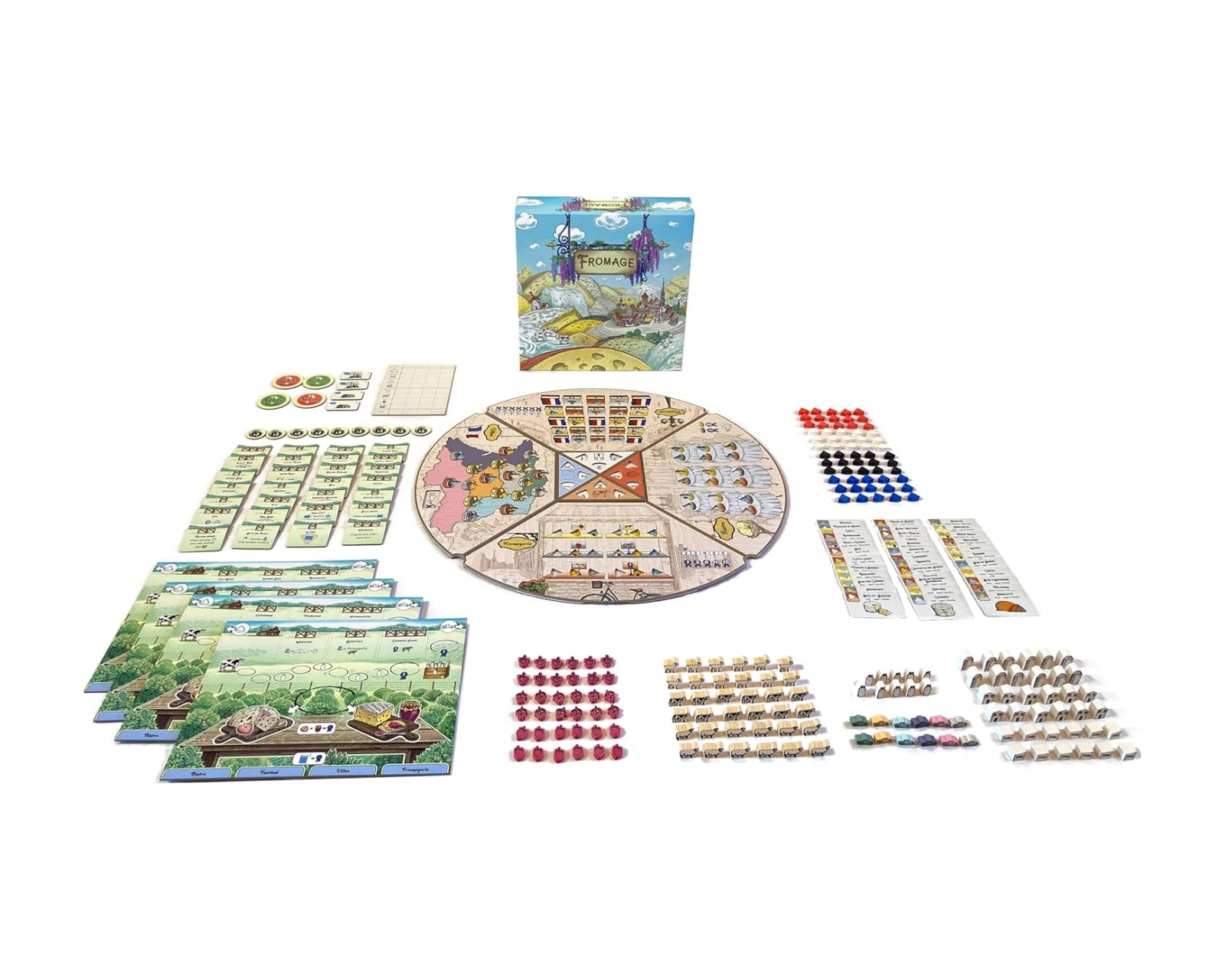 Fromage is a board game where players take on the role of French cheesemakers in the early 1900s. Players place their workers to produce cheese and gather resources from the part of the board facing them. Players aim to become the most prestigious cheesemaker in France by effectively managing and upgrading their cheese factory.The system for collecting Prestige Points by selling cheese to four different locations contributes to the game's strategic depth. The game is designed for 1 to 4 players and has a playtime of about 30 minutes. It is aimed at players aged 14 and older, making it suitable for both family and friends. The game board rotates after each round's workers have been placed, aging the cheese produced and giving each player new opportunities in their strategy.