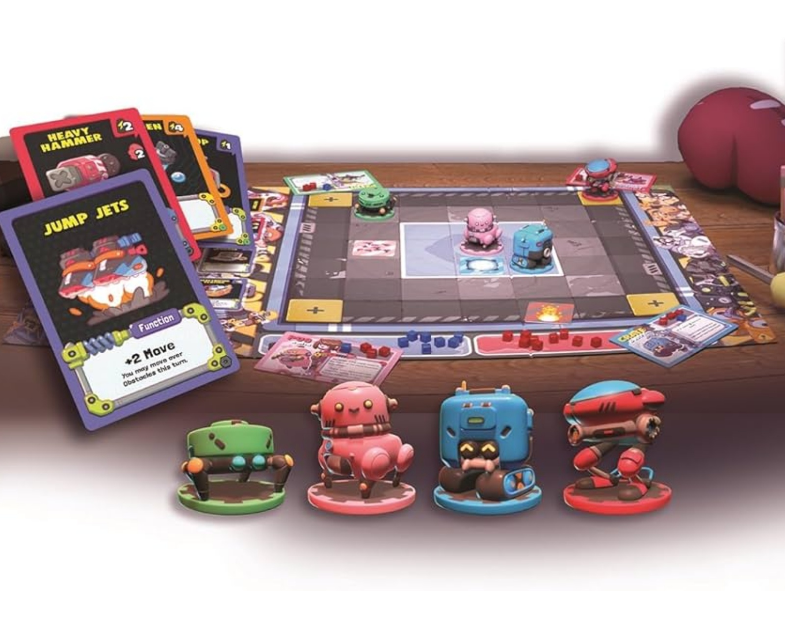 Robot Quest Arena is a board game for 2-4 gamers that revolves around robot battles and card-building mechanics. The game offers a dynamic gaming experience where players navigate through an arena and strategically use their cards to collect points. The game is designed to be accessible for gamers aged 8 and up and has a playtime of 40-60 minutes.The game includes energy cards that provide the necessary energy to move, activate weapons, and purchase powerful new cards for their deck. The arena is filled with dangers that players must maneuver around, and they shoot their opponents to collect points. Lost robots return each round, ensuring that no one is completely out of the game. Alliances can be formed and broken during the game, adding an extra dimension of strategy and interaction.