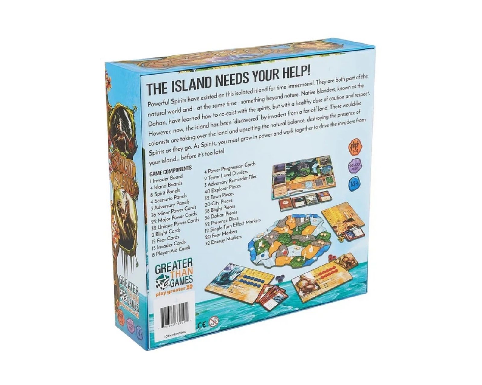 Spirit Island is a cooperative board game about defending your island from colonizing invaders. The game allows each player to control different spirits of the land, each with unique elemental powers. Players simultaneously choose which power cards to play each turn, which cost energy. By combining power cards that match a spirit's elemental affinities, players can gain bonus abilities. Fast powers are executed immediately before the invaders can spread, while other magic requires more planning. During the spirit phase, spirits gain energy and decide how to grow, either by reclaiming used power cards, seeking new power, or spreading their presence to new areas of the island. The invaders expand on the map in a somewhat predictable pattern. Each turn they explore different parts of the island, build settlements and cities, and cause blight when they attack native inhabitants. The spirits fight back against the invaders and protect the island. The complexity of the game increases over time and offers varying difficulty levels, with a range of different opponents to combat. Summary- Cooperative board game