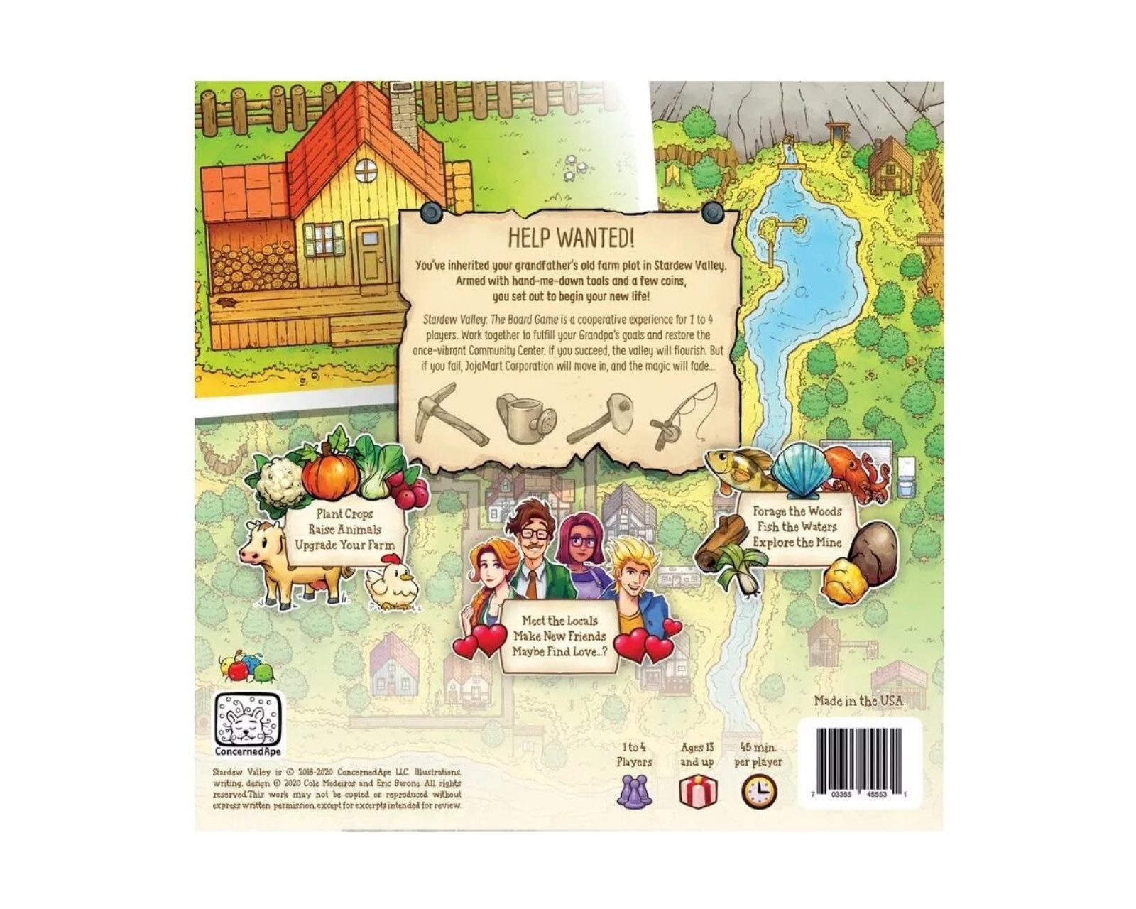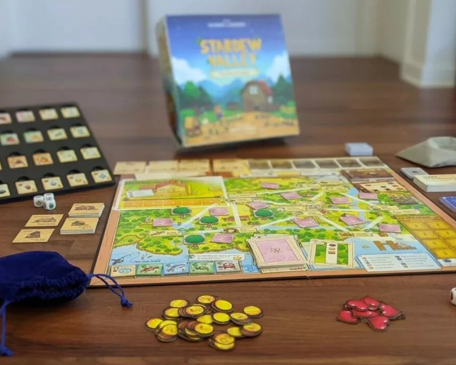 Stardew Valley - Board Game is a cooperative board game by Eric Barone, based on the acclaimed computer game. In Stardew Valley, players find themselves in a rich and vibrant world where they collaborate to restore the rundown valley. The game encourages strategic thinking by planting crops, raising animals, and expanding their farm. With a game mechanic that promotes cooperation, the goal is to prevent Joja Corporation's encroachment and preserve the valley's charming community.The game includes various components such as a game board, rulebook, special tiles, and cards, allowing for a deep and varied gaming experience. The unique villager cards and season cards offer players opportunities to gain advantages through friendship and secret missions. The different dice and tiles also contribute to creating a dynamic gameplay environment where every decision and action matters. The playtime is about 45 minutes per player, making it a perfect activity for game nights with friends and family.