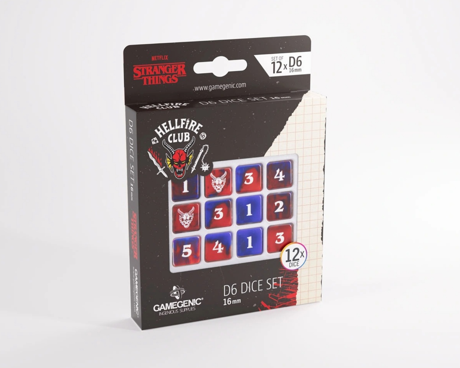 Hellfire Club D6 Dice Set 16mm is a set of 12 high-quality dice from Stranger Things™. These six-sided dice are made of resin and are a component intended for RPG, board games, and tabletop games. The dice are 16 mm in size and feature smooth, rounded edges that provide a smooth feel when rolling, as well as clear visibility of the numbers. The manufacturing material, resin, contributes to a sturdy and durable build quality.The design includes a unique feature where "Number 6" is represented by the Hellfire Club logo, giving the dice a theme from the series. The dice have an attractive visual style through a combination of two colors, which sets them apart from standard dice sets. The planned packaging type is a cardboard window box, making it easy to display the contents.
