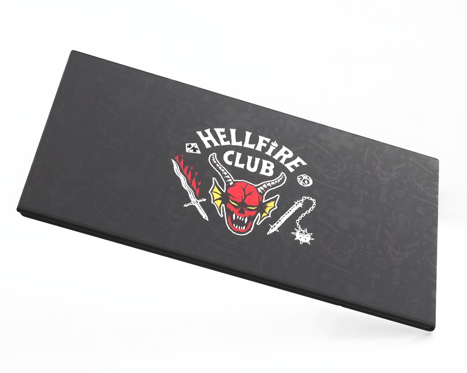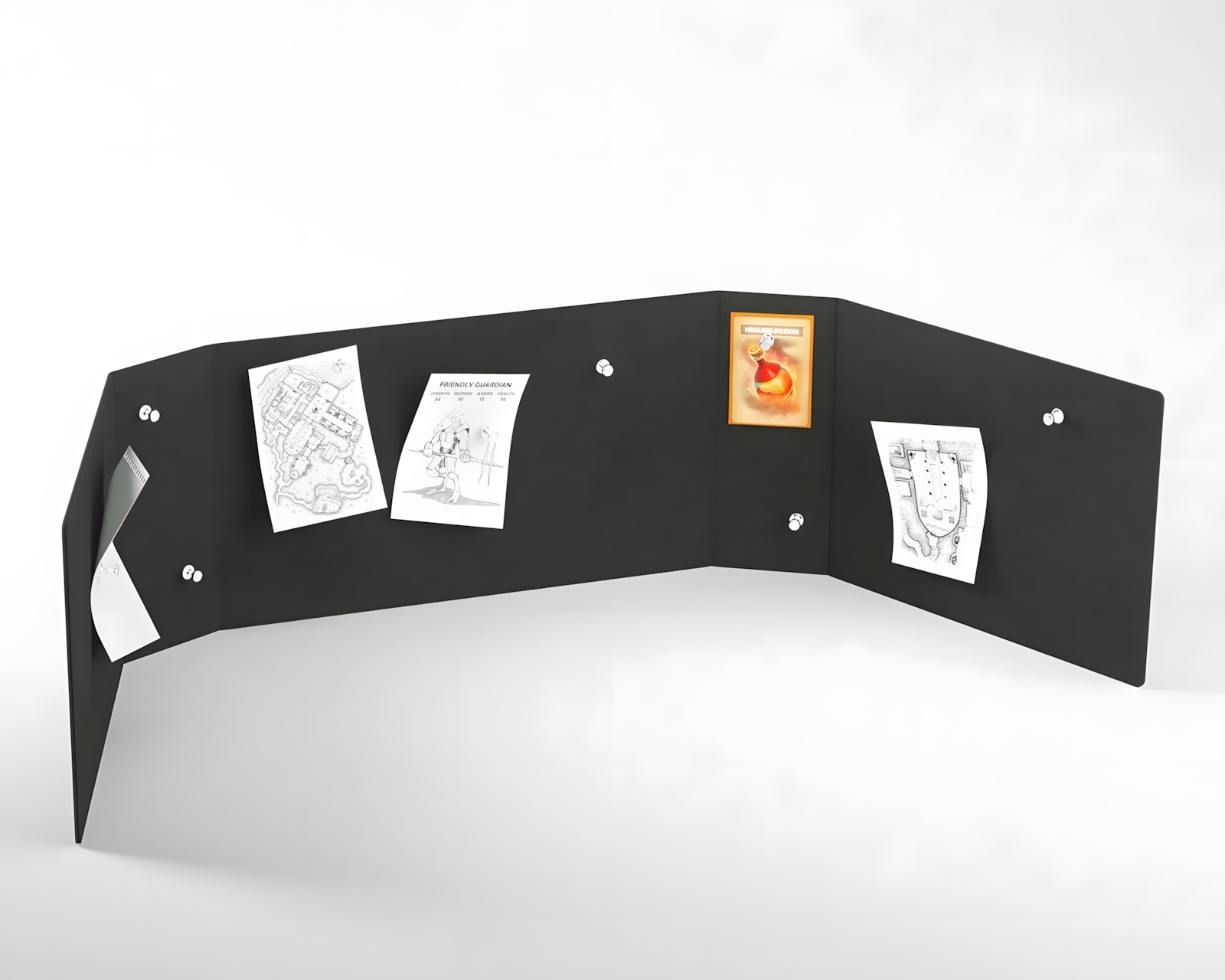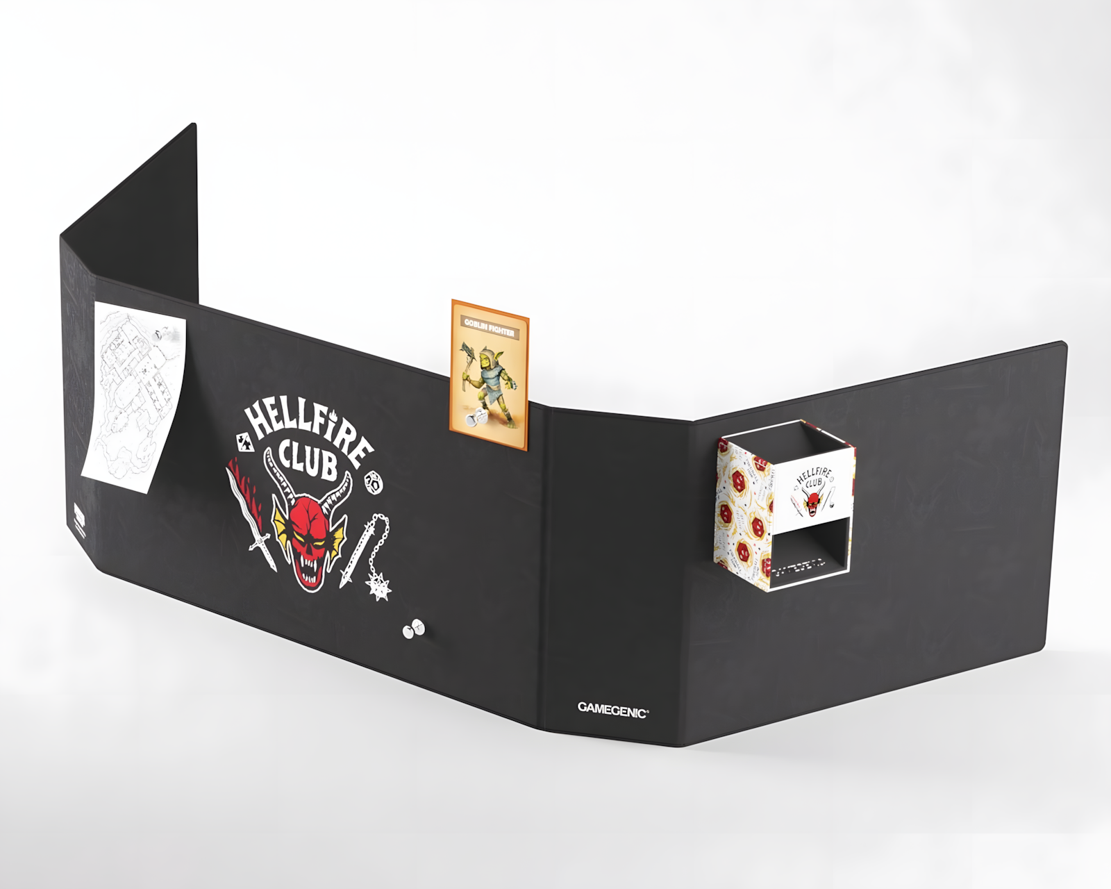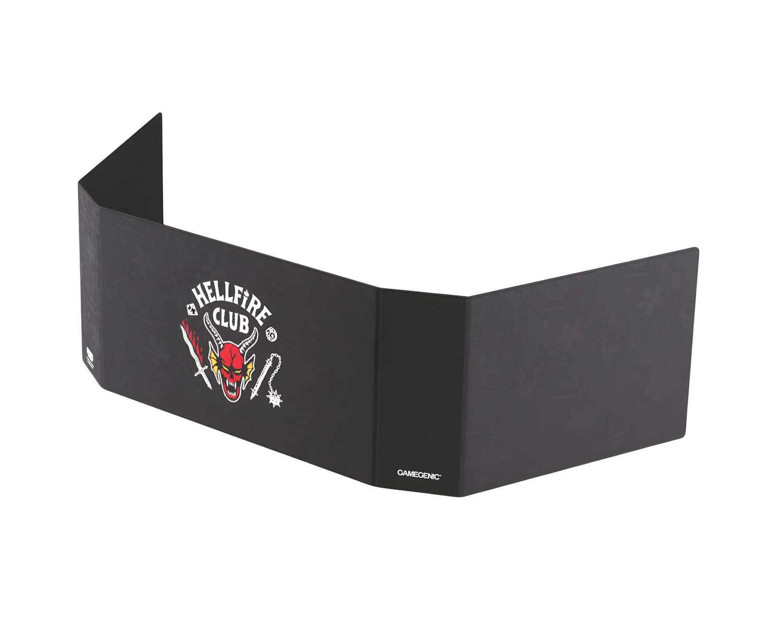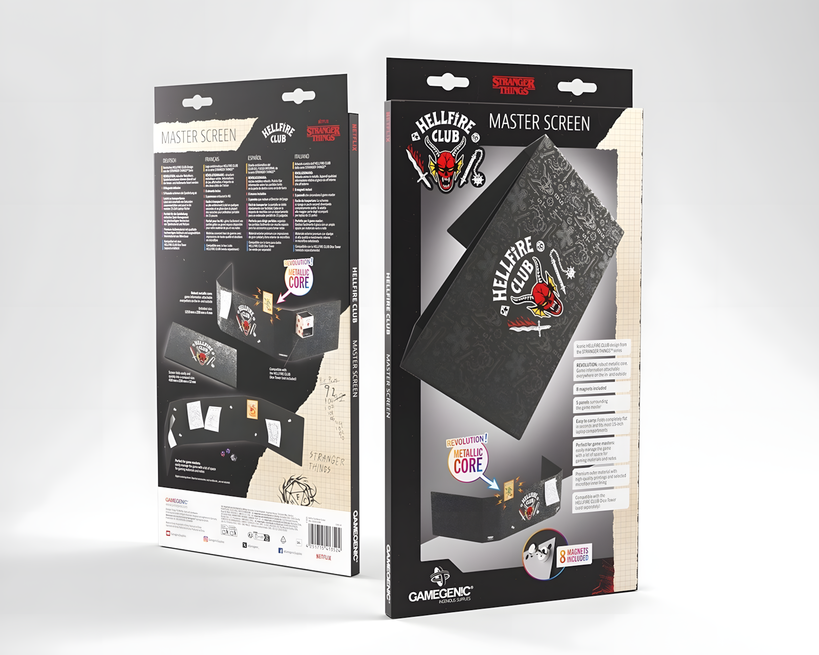 Hellfire Club Master Screen is a gaming accessory from the Stranger Things™ series. It features an iconic design and offers a sturdy construction with a metallic core. The Master Screen is equipped with 8 magnets that can hold game information both inside and outside the screen. It is particularly useful for game masters who manage game materials and notes during play.The screen is easy to transport, as it can be folded completely flat in just a few seconds and fits most 15-inch laptops. The product is made of Nexofyber+ surface and has a microfaser lining on the inside. This results in a durable and high-quality construction. When the screen is extended, it measures 1210 x 230 x 4 mm and provides ample space for organizing game materials. It can be used together with the HELLFIRE CLUB Dice Tower sold separately. The packaging is in a cardboard box, which allows for protection during transport.