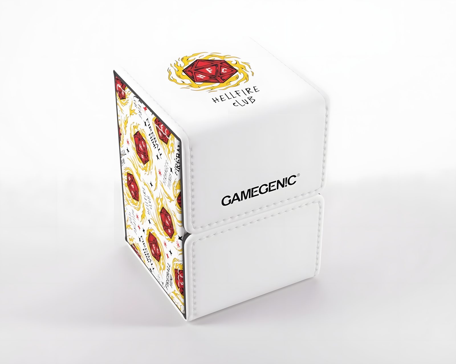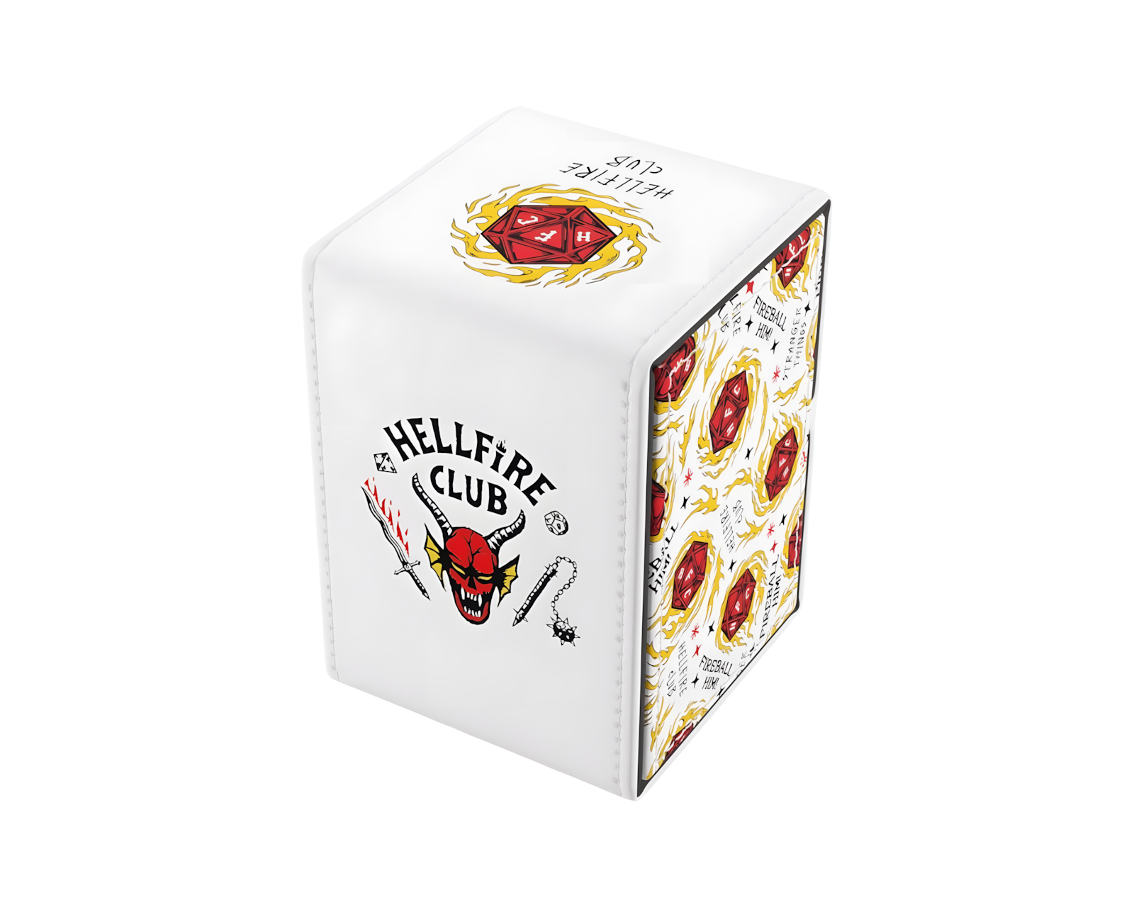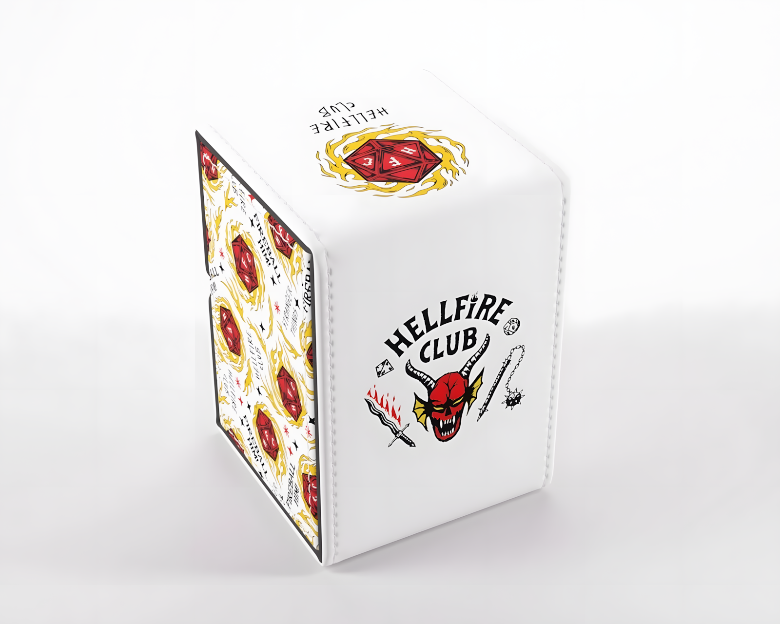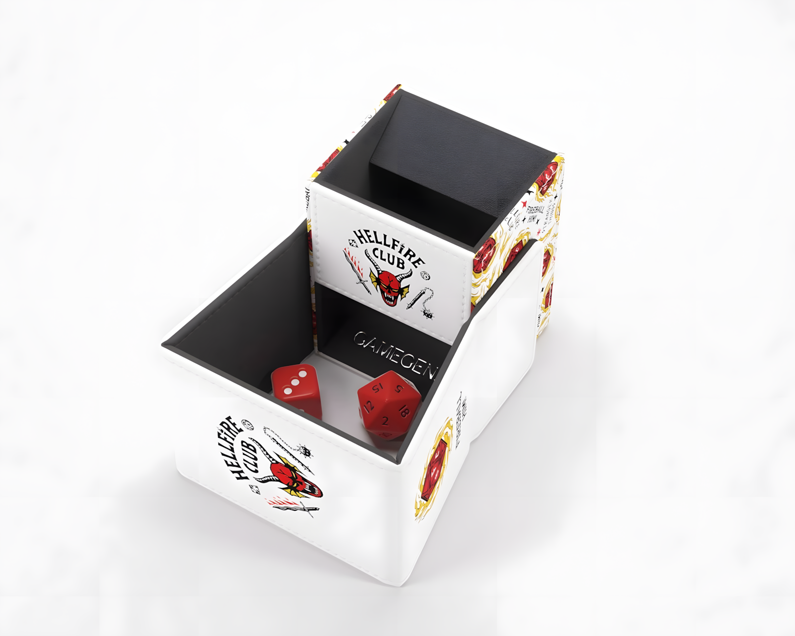 Stranger Things: Hellfire Club Premium Dice Tower is a dice tower from the Hellfire Club. This compact dice tower has a unique design inspired by the popular Stranger Things™ series and also serves as a storage box for dice. It is ideal for use in various role-playing games, board games, and card games where dice are used.The dice tower is made with a leather-like surface and a soft inner lining, providing a durable and stylish construction. With dimensions of 68 x 92 x 65 mm, the dice tower fits easily into most standard card boxes. It has a removable closing flap that also acts as a dice stopper. The dice tower is compatible with the HELLFIRE CLUB Master Screen and works excellently for larger dice up to 25 mm, such as the HELLFIRE CLUB Premium Metal D20.