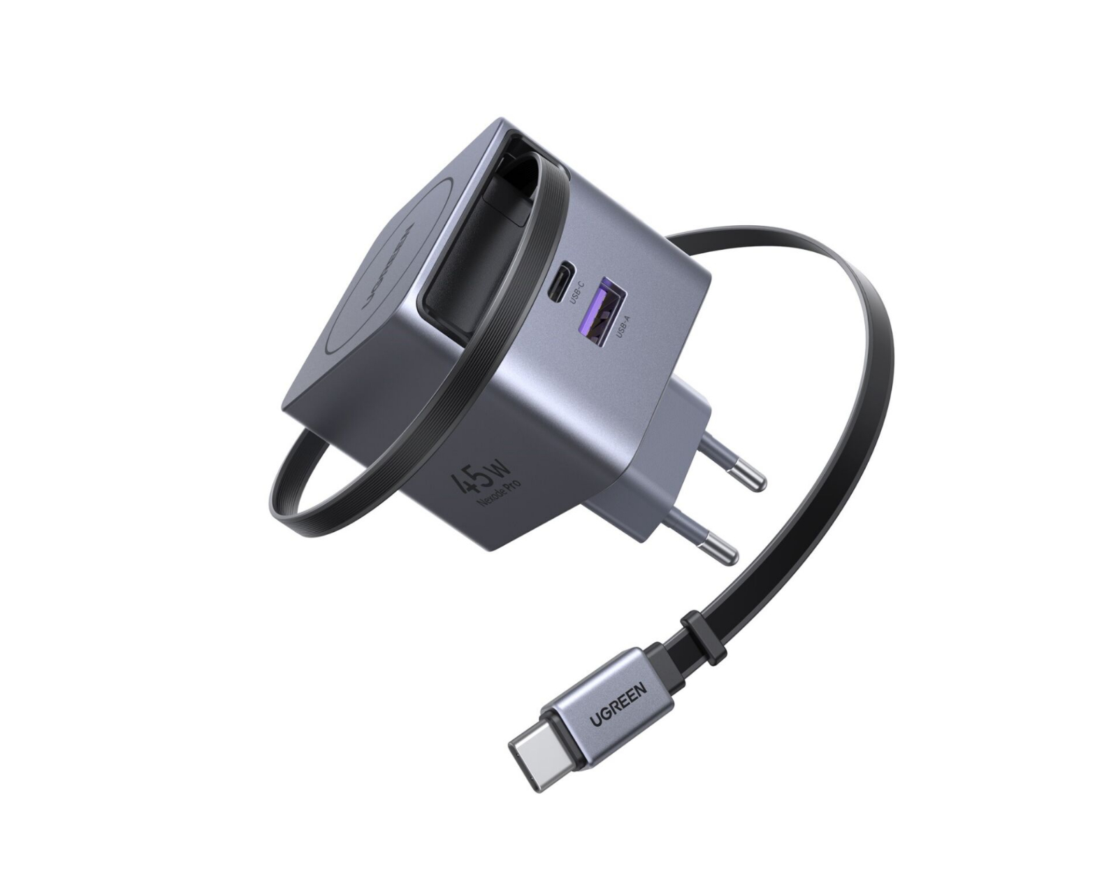 45W GaN Fast Charger with Retractable Cable is a versatile charging solution from UGREEN. This charger allows you to charge up to three devices simultaneously, and the built-in retractable cable offers a length of 0.7 meters with eight adjustable lengths. It has undergone over 25,000 retract and 10,000 bend tests, ensuring durable and tangle-free use.The product is designed with GaNInfinity? technology, which provides 95% efficiency and excellent heat dissipation. The fast charger has a total output of 45W, and it has USB-C outputs with 45W max power and a USB-A output with 22.5W max power. It also has eight levels of protection against overcurrent, overvoltage and overheating, and Thermal Guard? monitors the temperature 200 times per second. This ensures safer charging conditions.