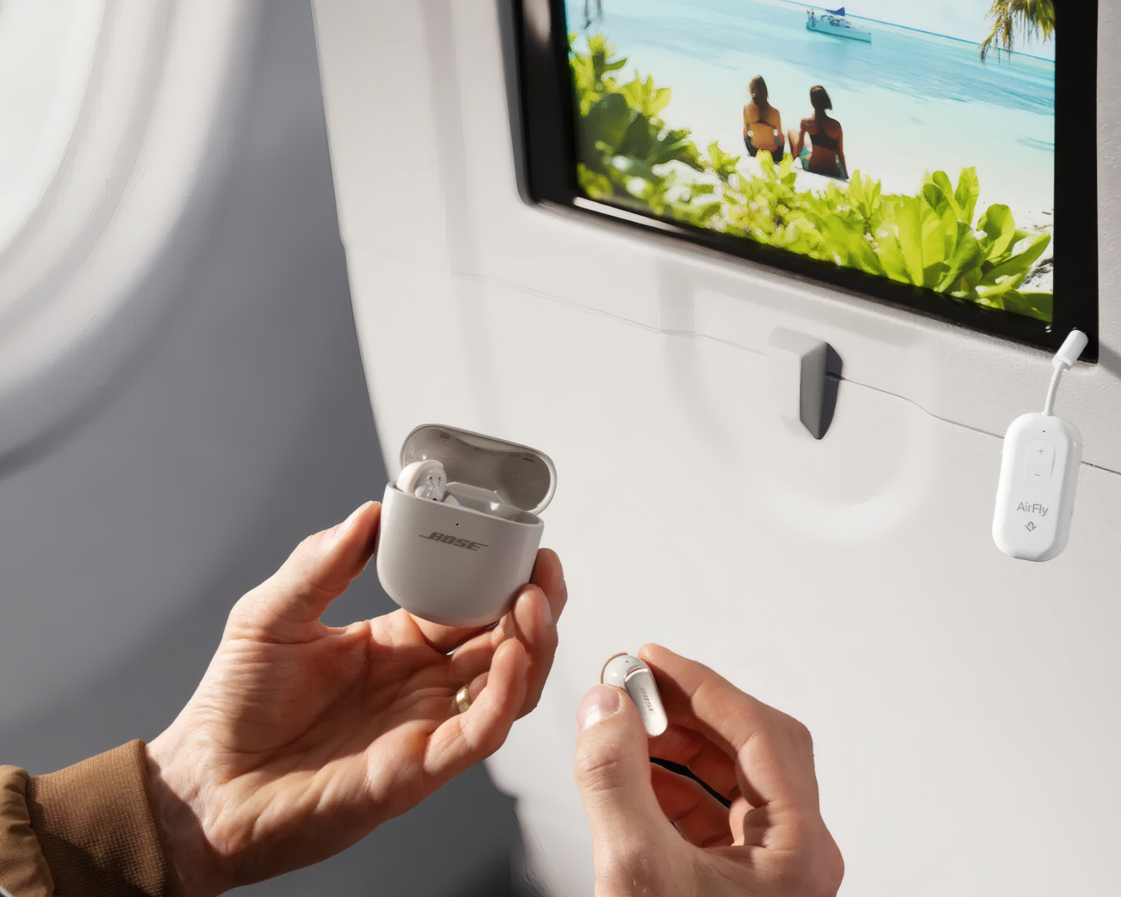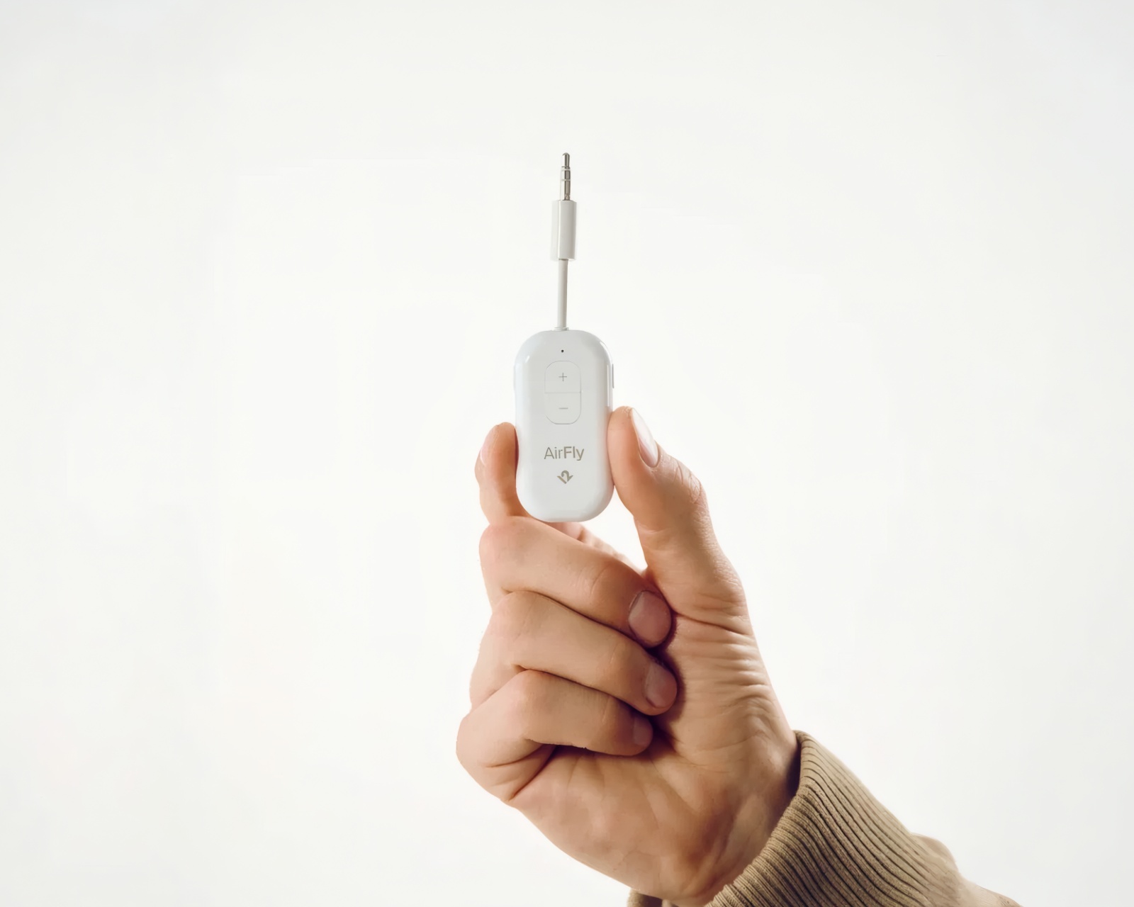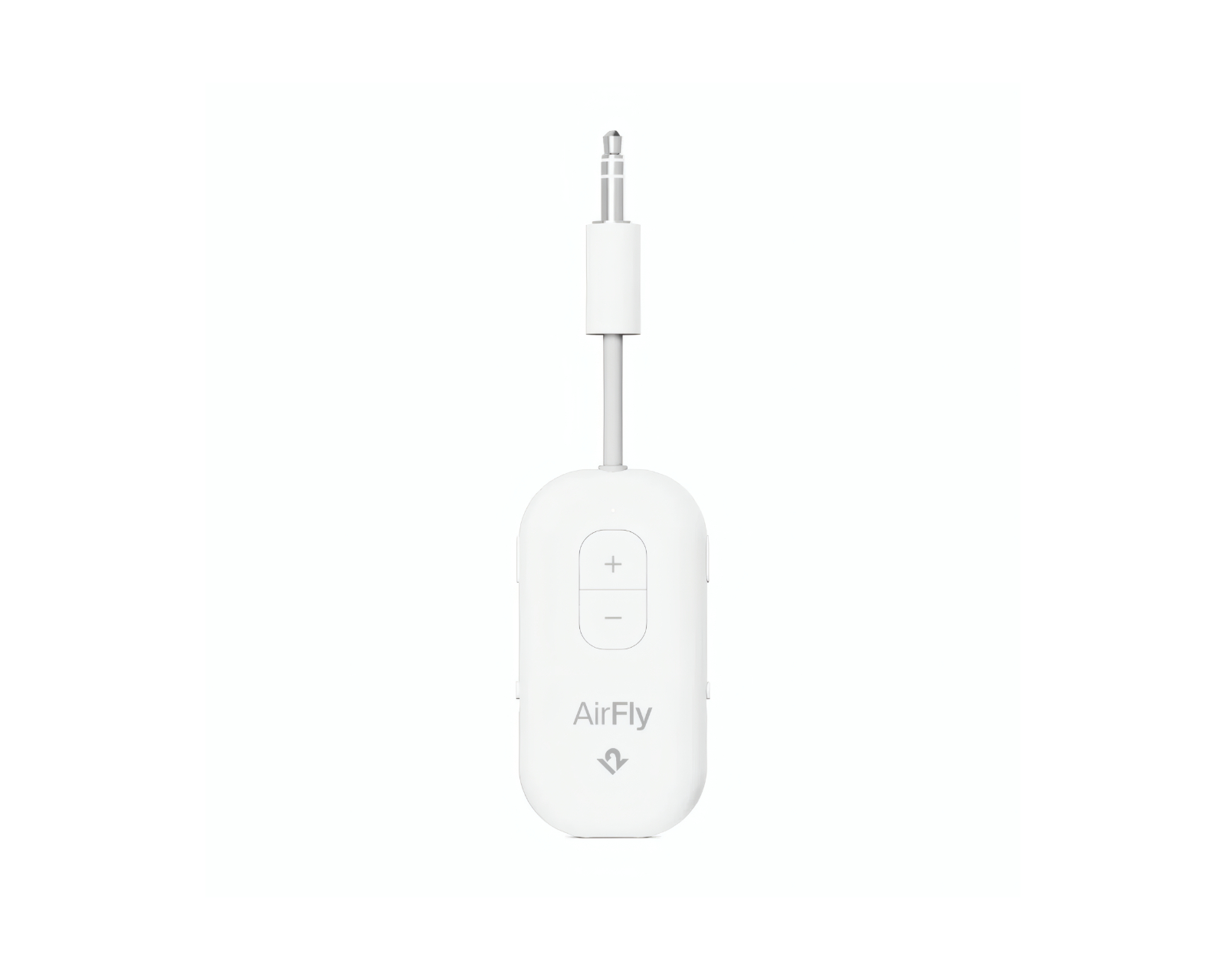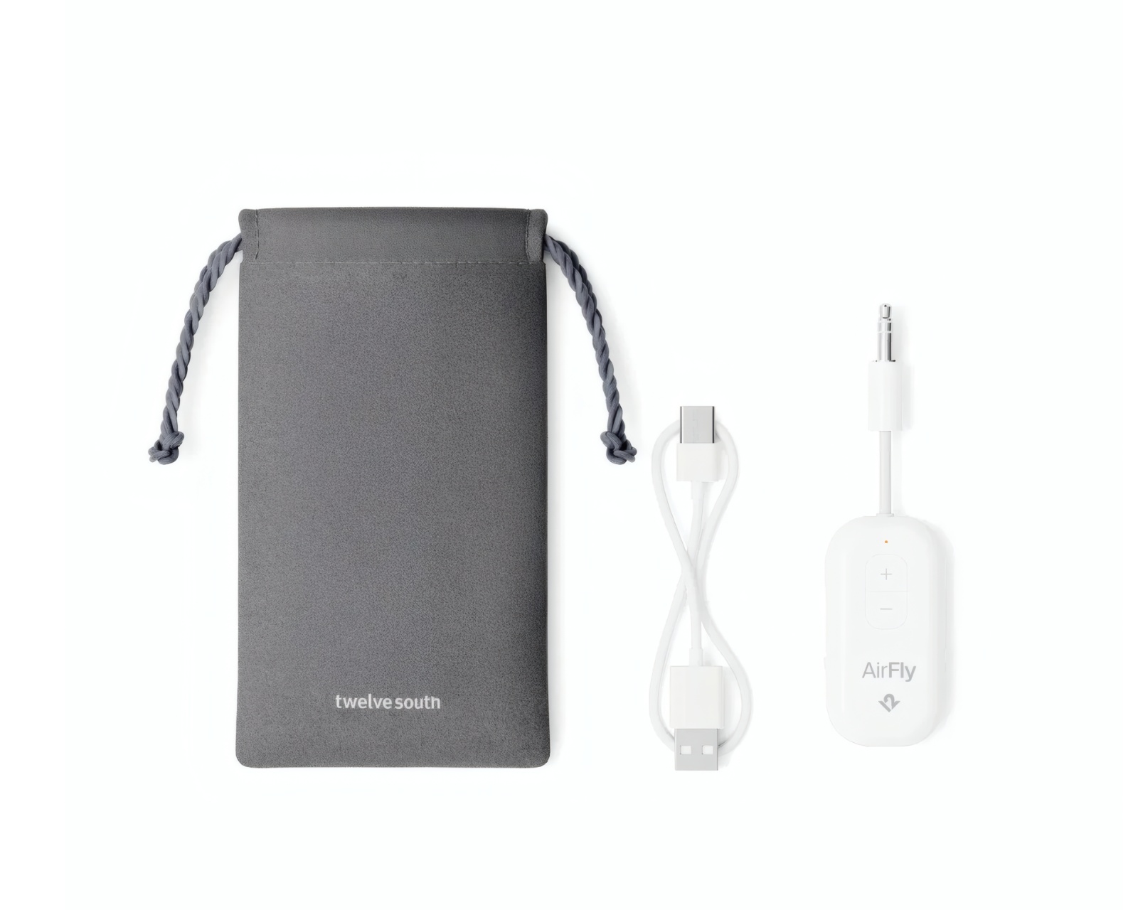 AirFly Pro 2 is a wireless adapter for headphones from Twelve South. This device enables the connection of AirPods or other Bluetooth headphones to any devices with a headphone jack, such as in-flight systems, gym equipment, and gaming consoles. AirFly Pro 2 can hold over 25 hours on a charge and is charged via USB-C.AirFly Pro 2 is compact and lightweight, making it easy to transport and use while traveling. It features two buttons to pair up to two wireless headphones to a single device, eliminating the need for a splitter cable. The device also has intuitive controls for volume and mute, as well as a clearly visible battery indicator. The deluxe version includes an international airplane adapter and a premium travel case for optimal use while traveling.