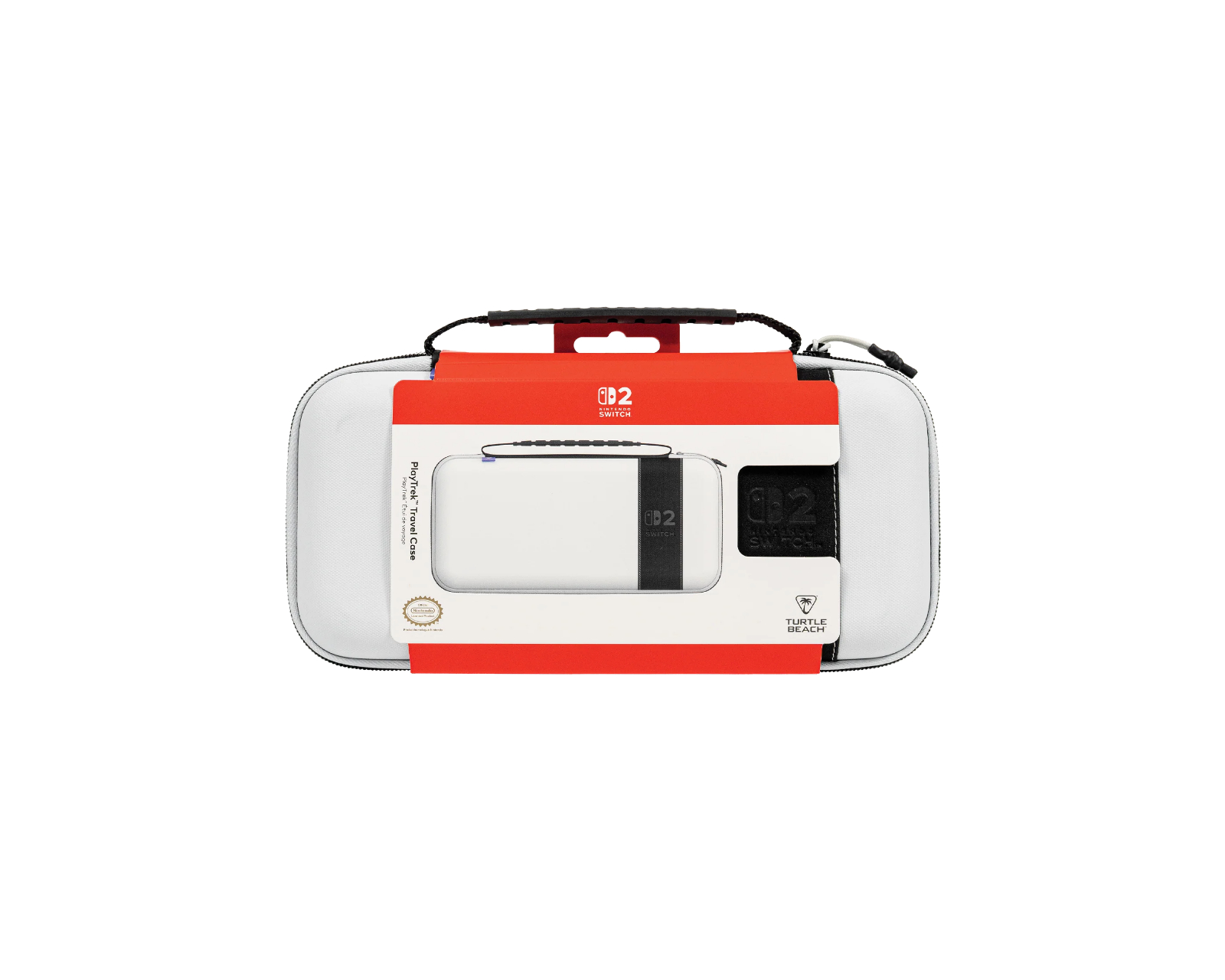 PlayTrek Carrying Case is a portable case from Turtle Beach, designed to protect the Nintendo Switch™ 2, Nintendo Switch™, and Nintendo Switch™ - OLED Model. The case's design combines functionality with durability to ensure that the console is protected during travel. Weighing in at 0.83 lbs (378 g) and measuring 11.81” x 6.10” x 2.28” (300 mm x 155 mm x 58 mm), it is a compact solution for gamers on the go.The case features a structured EVA molded shell covered with TPU-coated polyester, which contributes to a high level of impact and abrasion resistance. The padded inner compartment protects the screen from scratches, while a built-in mesh pocket provides storage for smaller accessories like cables or earbuds. Dedicated card slots ensure that game cards stay organized. A reinforced handle provides comfortable carry for easy transport.