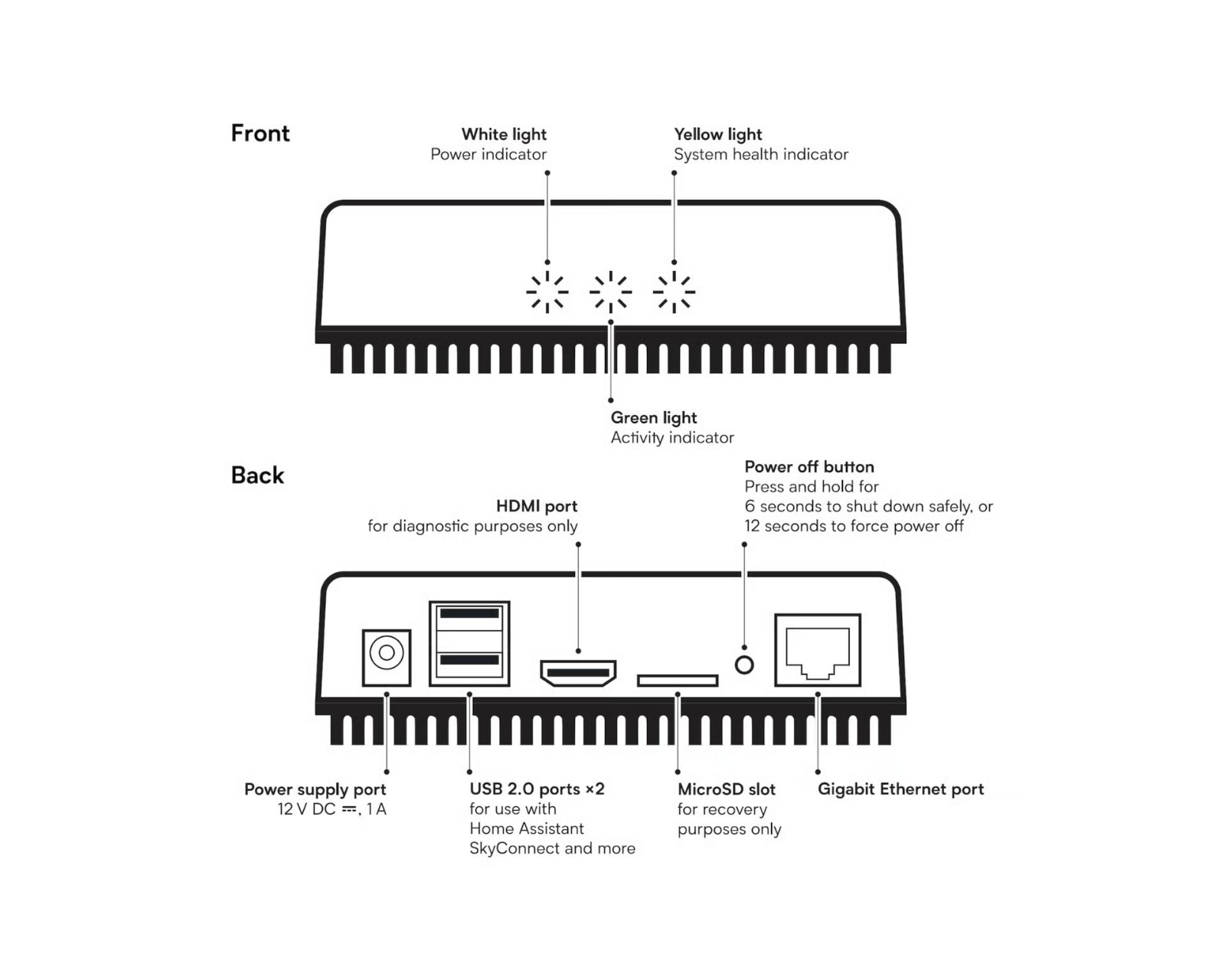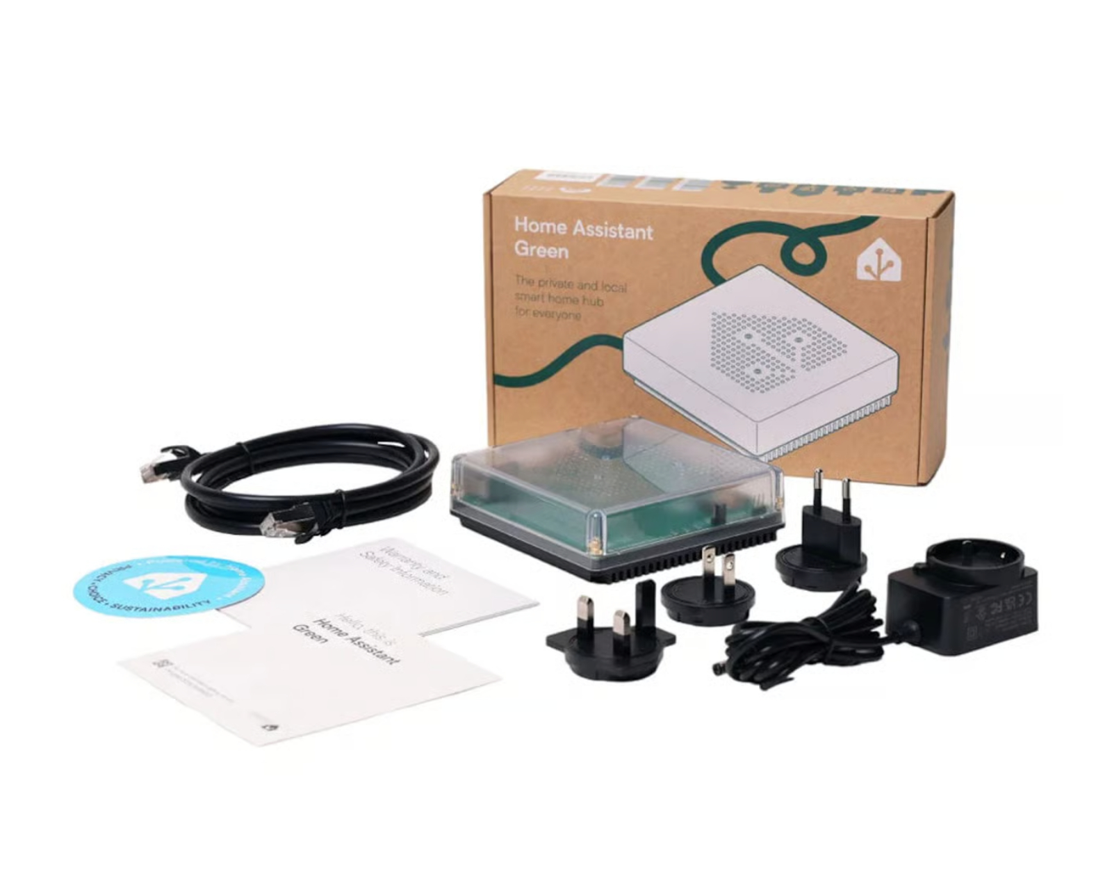 Home Assistant Green is a control center for smart homes from Nabu Casa designed to facilitate the use of Home Assistant. Equipped with a quad-core ARM processor at 1.8 GHz and 4 GB of RAM, it offers powerful performance for fast and efficient operation. With 32 GB of eMMC storage pre-installed with Home Assistant, setup is simple and quick.The build quality is top-notch with a robust construction and a large heatsink that allows for silent cooling. The dual USB ports and a Gigabit port ensure fast and reliable connections for all your smart home devices. The packaging also includes both a power cord and a network cable, giving you everything you need to get started quickly. Home Assistant Green supports SkyConnect, further enhancing its usability in a smart home.
