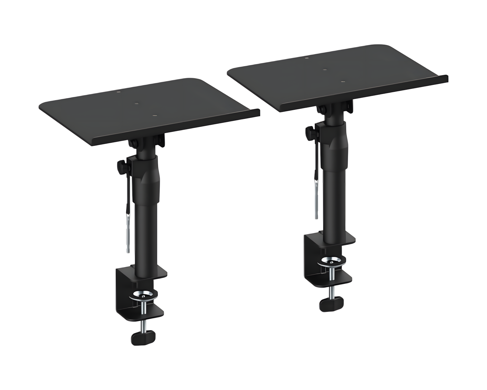 Adjustable Speaker Stand with Clamp is a speaker mounting solution from MaxMount that allows for flexible and precise placement of audio equipment. With a depth-adjustable top plate for front-to-back positioning, users can avoid wall interference. It offers fully adjustable angles that further enhance the audio experience regardless of the installation situation. The clamp support is intended for use in home environments where sound quality is of the utmost priority.Built with a focus on quality and functionality, the clamp support features anti-vibration pads which minimize sound transmission and disturbing vibrations. The built-in cable management system ensures an organized workspace. Its clamp mounting attaches securely to the table, maximizing workspace utilization and providing secure support. The choice of materials and construction methods contribute to a robust product that is tailored for sustainable use and easy installation.