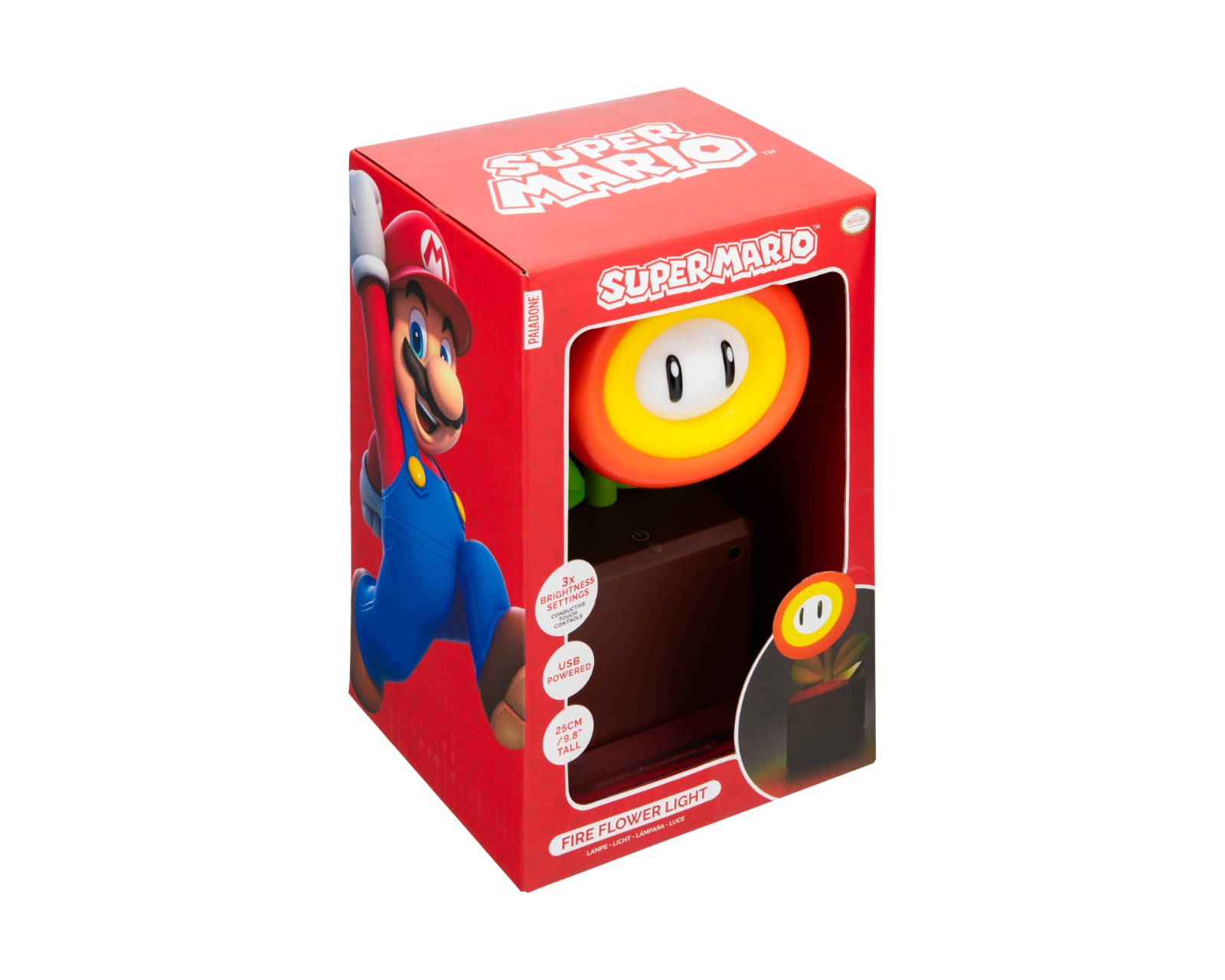 Give your home a touch of retro with the unique Fire Flower Lamp, perfect for gaming lovers and pop culture fans. With its compact size of 10 cm and super lightweight design, it is perfect as a night light or stylish decoration in the children's room, game corner or living room. The lamp is powered by 2 AAA batteries and is made with BDP, an environmentally friendly material that makes it recyclable and biodegradable.The officially licensed design makes the Fire Flower Lamp a unique gift for both children and adults. Brighten up your home with this nostalgic piece that will both light up and bring joy to any room.