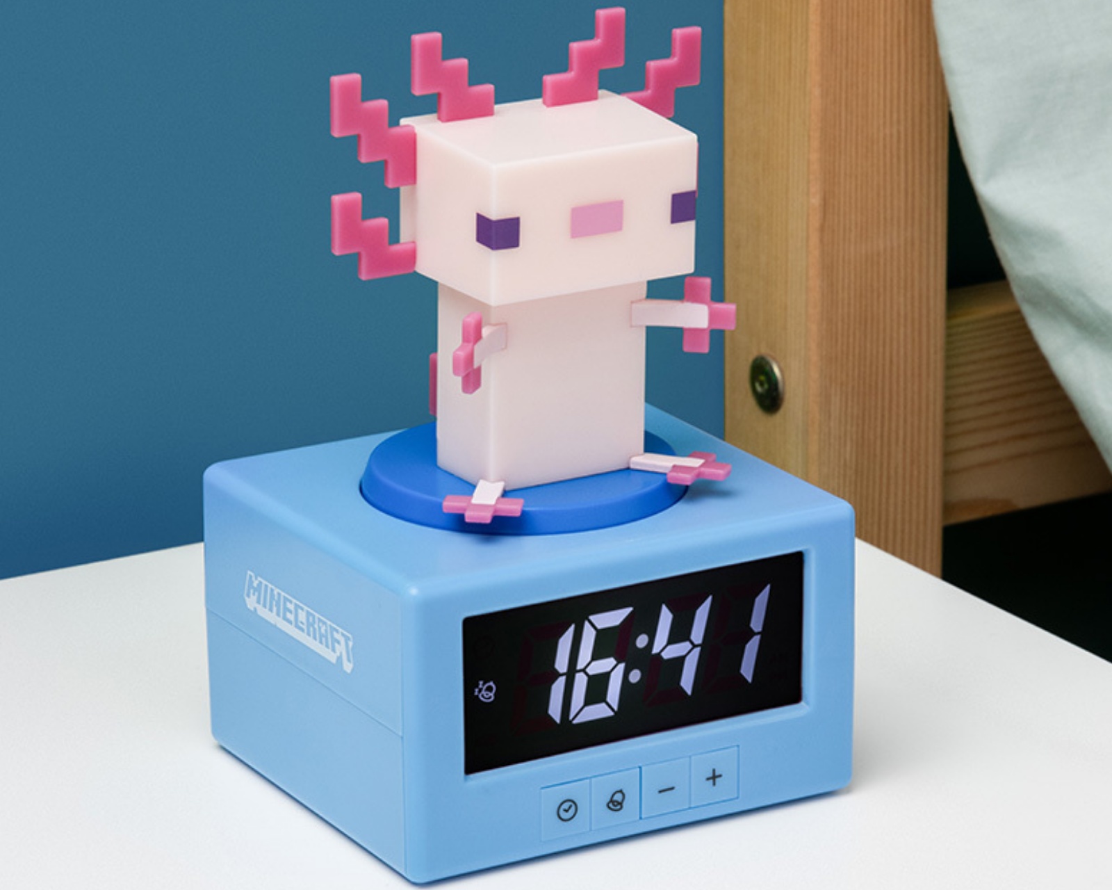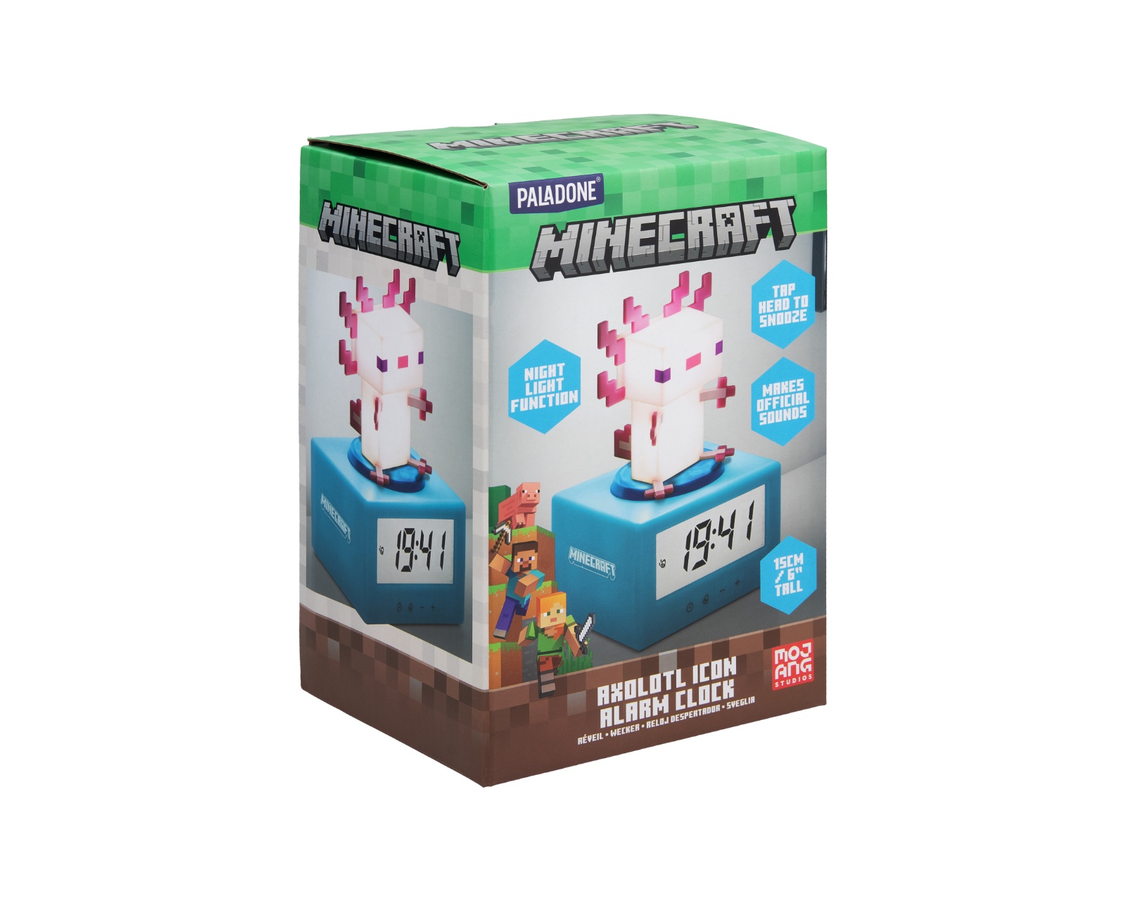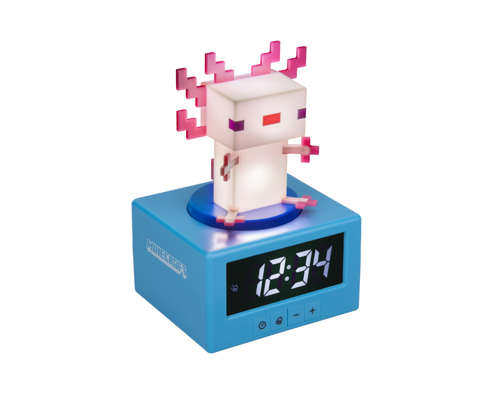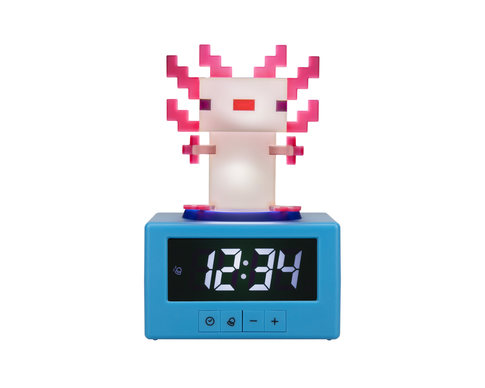 Axolotl Ikon Alarm Clock is a digital alarm clock from Paladone that combines function and design. Standing at 15 cm tall, this clock features a figurine Axolotl mob from Minecraft on top, making it an eye-catching accessory for gamers. The clock offers an alarm with sounds from the game's Otherworld song, providing a unique morning wake-up experience. The snooze function is easily activated by tapping, allowing you to get a few extra minutes of sleep.The alarm clock is designed with user-friendliness in mind and has a nightlight function that activates by pressing down on the Axolotl figure, providing a soft glow perfect for nighttime. Additionally, no cord is required to operate it; it is powered instead by three AA batteries (not included). The clock is not only a usable gadget but also a collectible item for fans of Minecraft, making it ideal for adorning a bedside table or gaming room.