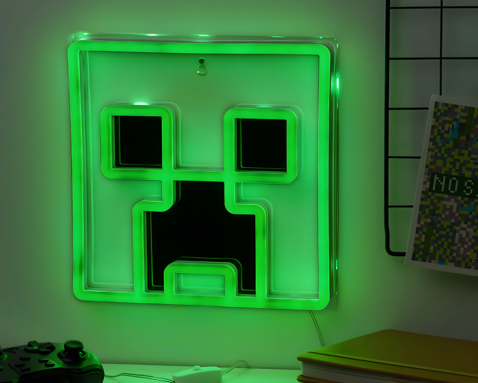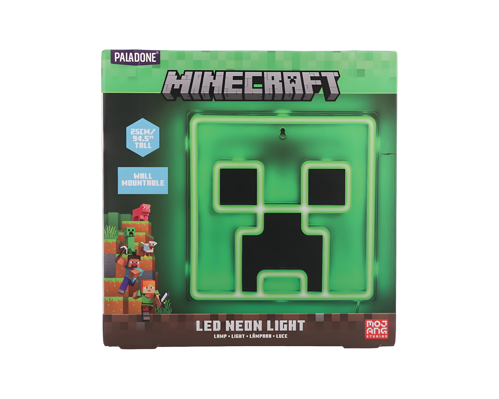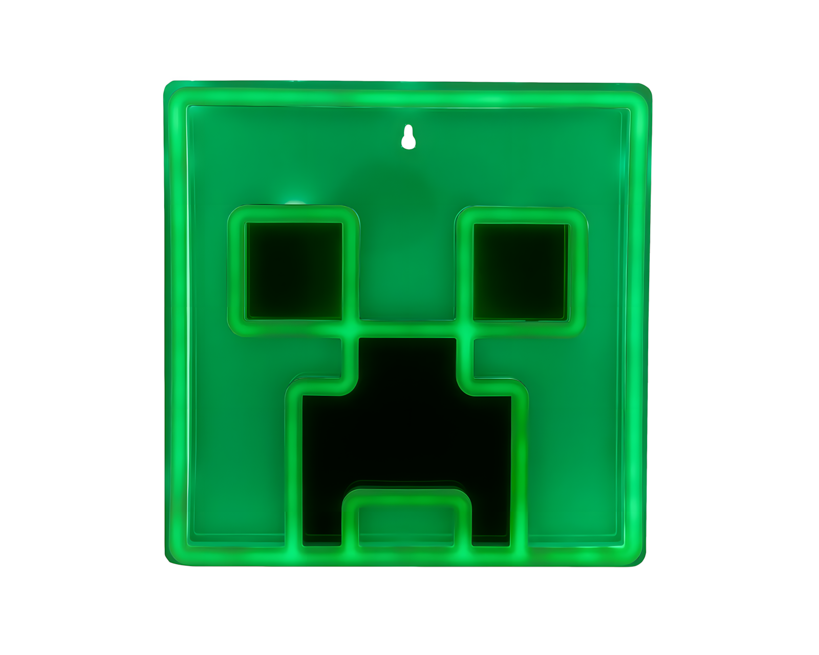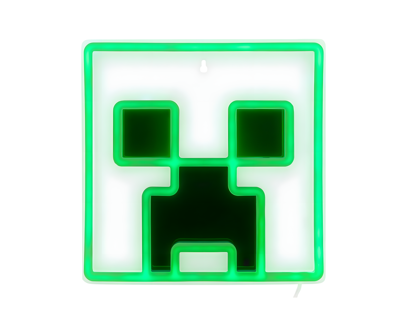 Creeper Wall-Mountable LED Neon Lamp is a lighting product from Paladone. It is 25 cm (9.4") tall and can be mounted on walls. The lamp depicts the iconic Creeper character from Minecraft and emits an intense green light, giving a playful impression in various rooms and environments. It is practical for gamers who want to decorate their rooms with gaming-related items. The lamp is powered via a USB cable that is attached to the unit.This LED lamp is made with a focus on sustainability and quality. It has a stable construction that allows it to be mounted on the wall without any problems. The green light provides a pleasant atmosphere and can be used to illuminate a dark room or as a decorative piece in gaming rooms. The product is officially licensed by Minecraft, meaning the design is true to the game's aesthetics. The unit is suitable for use in gaming rooms, study spaces, or as a gift for a gamer.