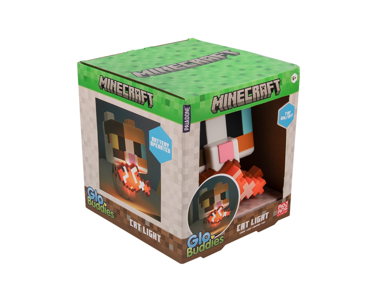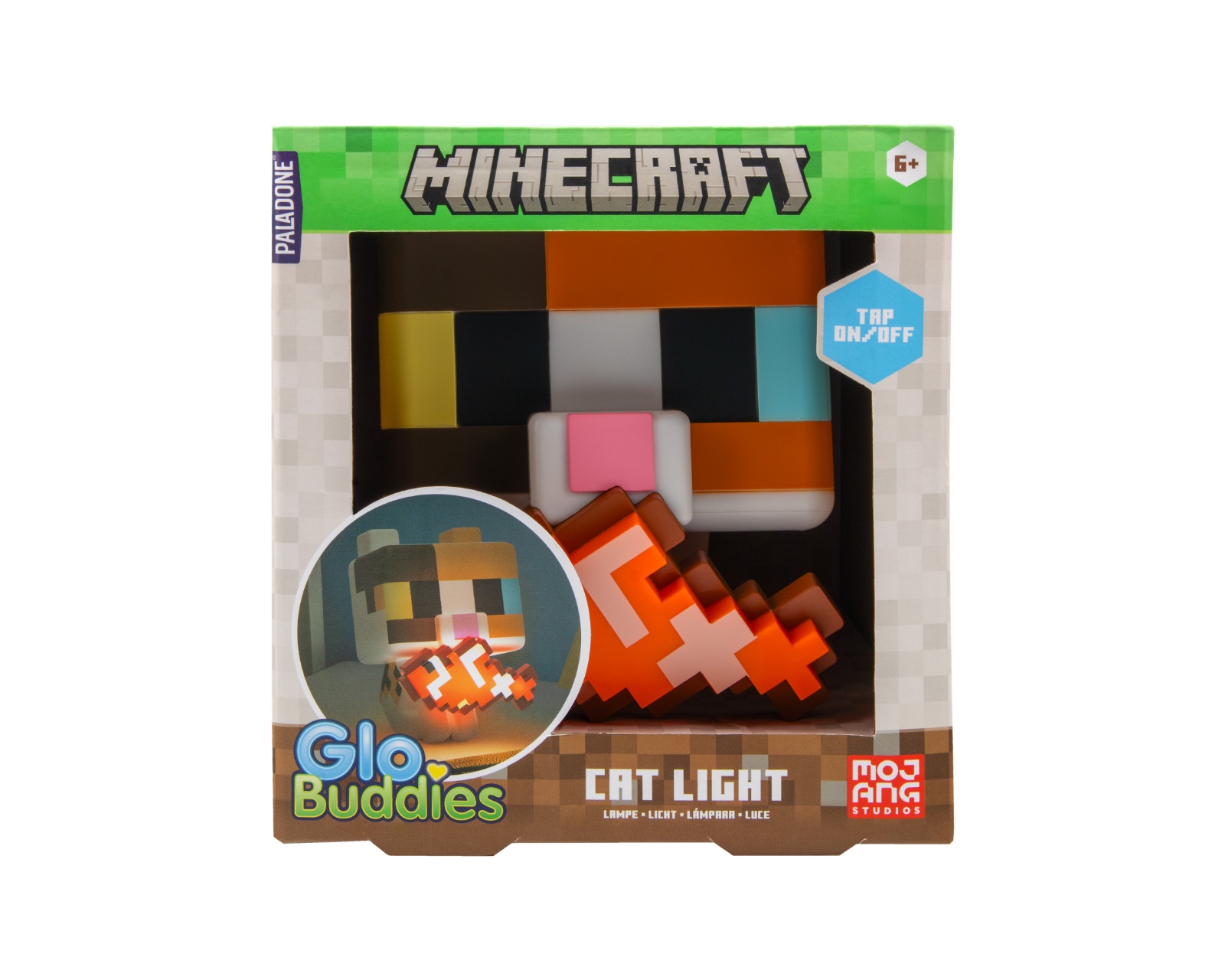 Minecraft Cat GloBuddies Lamp is a decorative lighting from Paladone that brings life to your space. This 3D figure stands 15 cm tall and represents the popular game's calico cat with a charming, glowing fish in its mouth. It is easy to use; press to turn on and press again to turn it off. The lamp is powered by 2x AA batteries (not included), which means no wires are needed to turn on the light.The Minecraft Cat GloBuddies Lamp is ideal as a night light and fits perfectly on desks, shelves, or bedside tables. The figure is carefully designed to mimic the game's graphics, making it an excellent accessory for both gamers and Minecraft enthusiasts. The lamp offers a soft, warm glow that creates a pleasant atmosphere in any room. With its compact size, it is easy to place and can elevate the mood in your home.