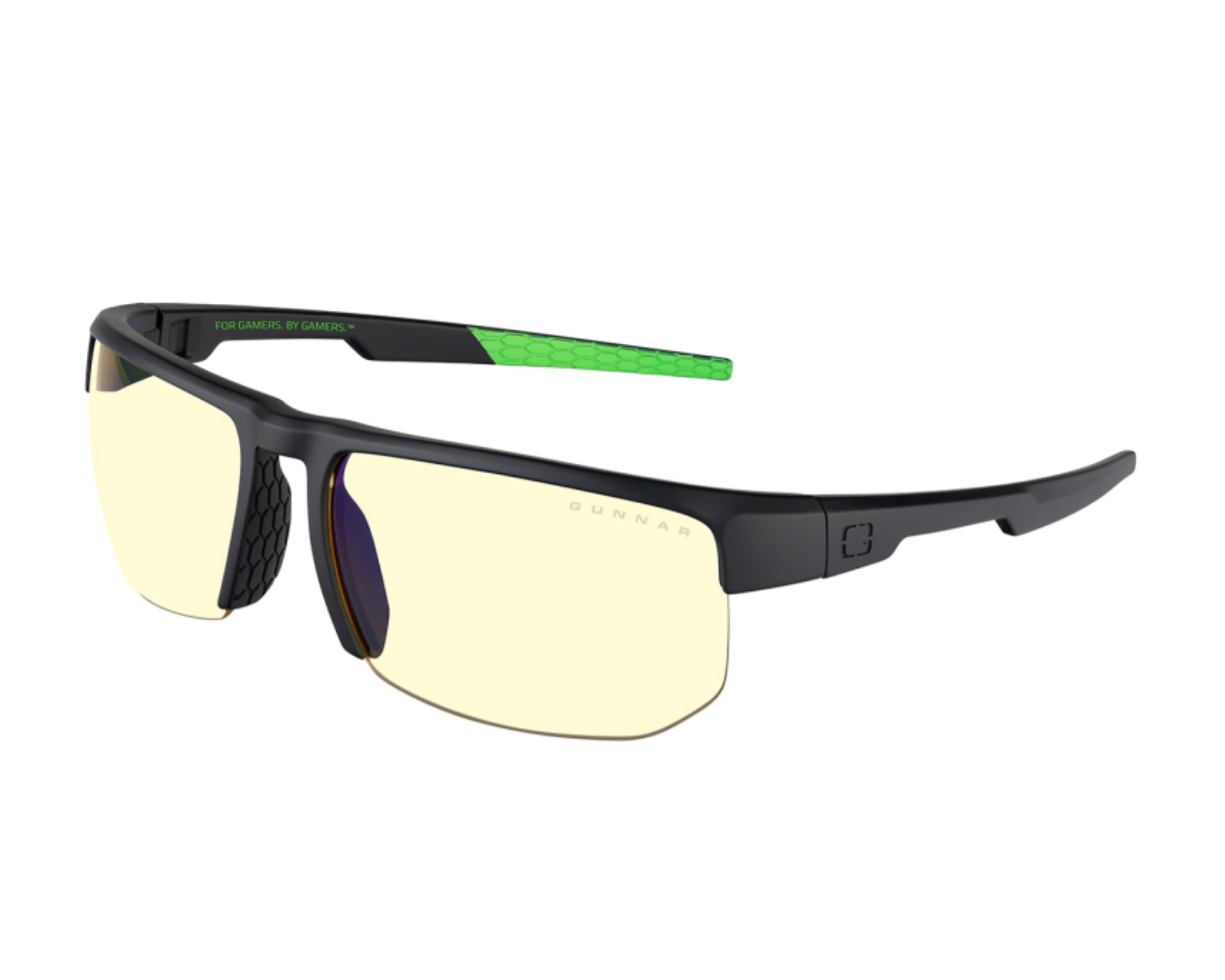 Torpedo-X Razer Edition is a pair of gaming glasses from Gunnar Optiks designed to enhance visual endurance and focus during long gaming sessions. These lightweight, wrap-around glasses come with GUNNAR's patented "Amber" lens, which effectively reduces the symptoms of digital eye strain and blocks 65% of harmful blue light. The glasses feature a semi-rimless design and a wide nylon frame for maximum panoramic view, providing unmatched vision during your gaming.The glasses are built with high quality and have a wrap-around construction that, together with GUNNAR's lenses, helps to combat dry eyes. A free, interchangeable temple with fastening device is included, making them compatible with headphones and providing increased comfort. The glasses also feature standard anti-reflective treatment both front and back, as well as a dirt-repellent coating.