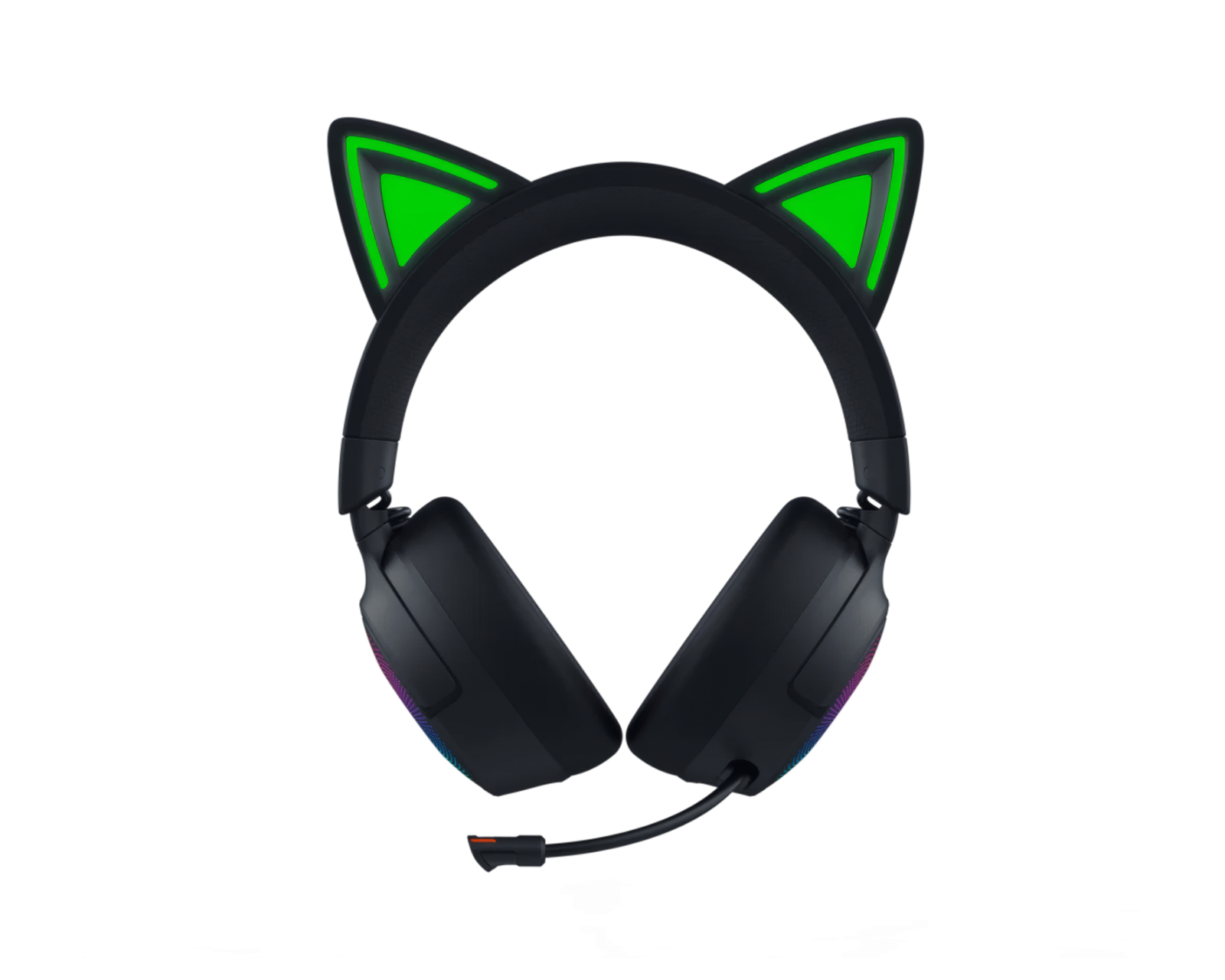 Kraken Kitty V3 Pro is a wireless gaming headset from Razer, designed with distinctive cat ears and Razer Chroma™ RGB lighting. It offers three different connection modes, including 2.4 GHz and Bluetooth 5.3, as well as a super-wide microphone for clear sound reproduction. This headset targets gamers looking for style and functionality during their gaming experience.The headset features protein leather ear cushions with memory foam for increased comfort and sound isolation. The flexible and detachable Razer™ HyperClear microphone has a wide frequency response which ensures that the user's voice is reproduced clearly. Razer™ TriForce Titanium 40 mm drivers provide a listening experience with distinct highs, smooth mids, and deep bass, resulting in clear and balanced sound. The device supports THX Spatial Audio for 7.1 surround sound, providing a more immersive gaming experience.