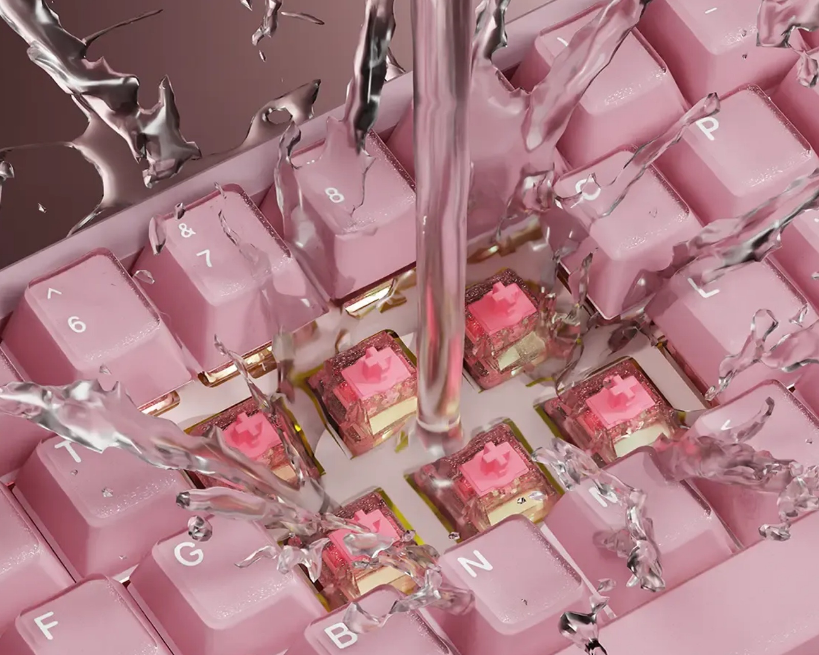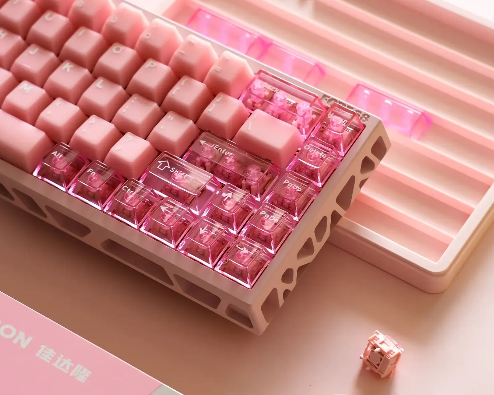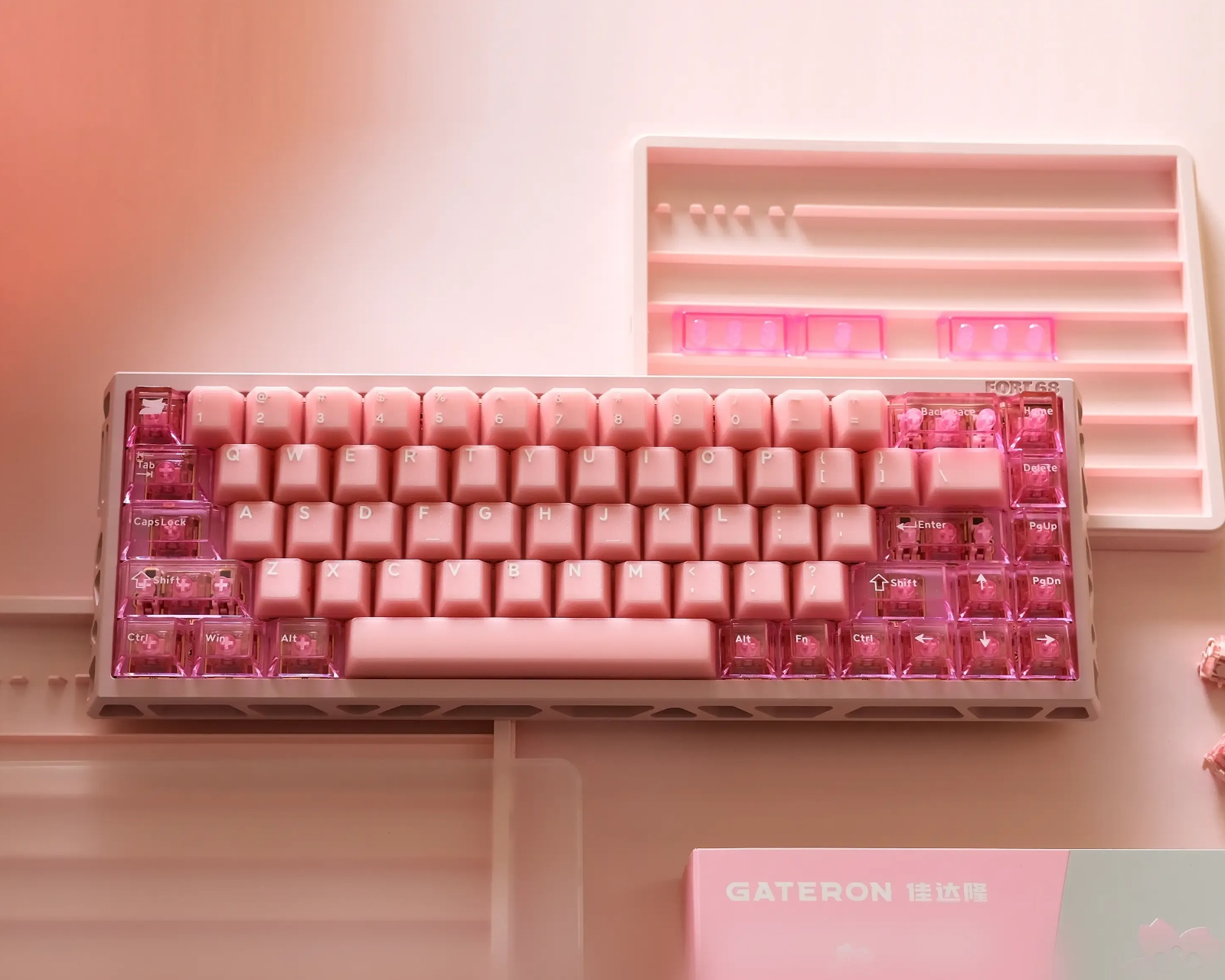 GATERON FORT 68 Sakura is a 68-key mechanical keyboard kit from Gateron, designed with a real-time optical system and magnetic switches. The keyboard offers a pre-assembled layout with a tri-split modular space bar for improved interactivity and customization. It responds instantly to input with light effects, providing a multifaceted typing experience.The keyboard is equipped with a patented tri-split design that allows for modular flexibility and stability. The magnetic switch provides enhanced feedback with quick rebound, which is beneficial for gamers. Additionally, the keyboard is protected with a nanoscale waterproof module, making it spill-resistant. The latency is outstanding with an accuracy of 0.01ms and a latency of < 0.125ms for smoother usage.