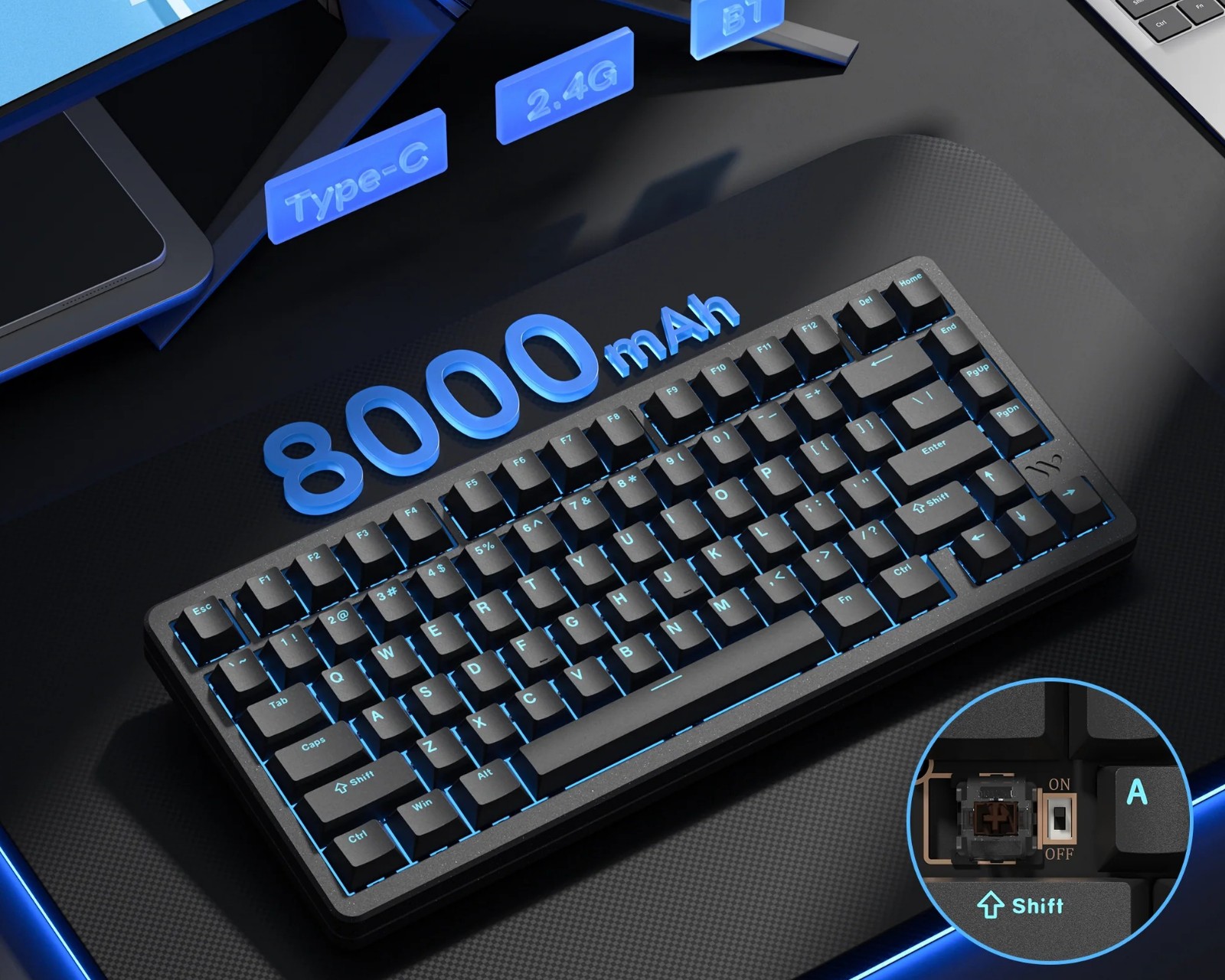 Womier SK75 TMR is a wireless keyboard with magnetic switches from Womier Keyboard. The keyboard offers swift response with a polling rate of 8000Hz in both wired and wireless mode. It consists of 81 keys in an ANSI 75% layout, making it compact and easy to use in various environments. Thanks to the long-lasting 8000mAh battery, it is designed for both gamers and users seeking a reliable and high-performance device.The build quality of SK75 TMR is robust with an aluminum chassis and an FR4 plate that supports both magnetic and traditional mechanical switches, enabling hot-swap functionality. The keyboard is also equipped with adjustable actuation points between 0.1mm and 3.5mm and has a latency of 0.125 ms in wired mode. The keyboard supports USB Type-C connection, Bluetooth 5.0, and 2.4 GHz wireless. Backlight LEDs are placed beneath the keys, providing a smooth and appealing illumination.