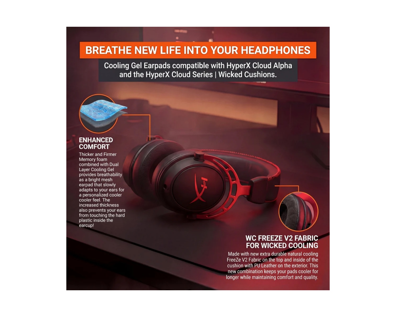 WC FreeZe earpads are ear cushions from Wicked Cushions. They offer improved comfort and cooling during use and are specifically designed for HyperX Cloud headphones. The products utilize FreeZe V2 cooling technology that keeps the pads cool longer and provides a better experience during gaming sessions. These ear cushions have a quick installation process and are compatible with a range of HyperX models.WC FreeZe earpads are made from extra thick memory foam that molds to the ear and creates a pressure-free fit, providing better sound insulation and improved ergonomics. The angled design increases space for the ears and helps to reduce pressure during long gaming sessions. The material is resistant to wear, making them durable for daily use. The ear cushions are specifically designed for a variety of HyperX models but do not fit other brands.