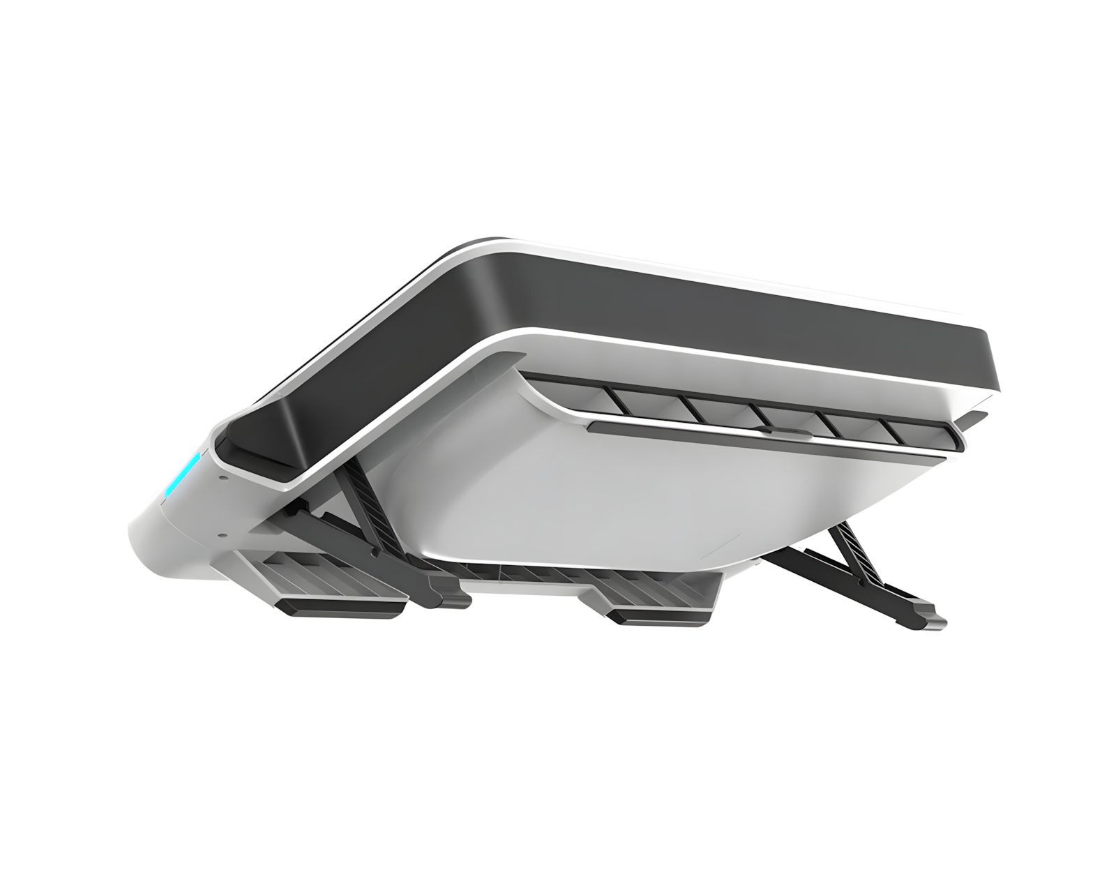 FLYDIGI BS2 Laptop Cooler is a high-performance cooling pad from Flydigi, designed to effectively lower the temperature of the laptop's CPU and GPU. With a lab-tested temperature reduction of up to 36°C, it improves both performance and stability during demanding tasks such as gaming and video editing. The cooling pad has a noise level of a maximum of 53 dB, making it quieter than most built-in fans in computers.Built with an innovative closed turbo pressure system, the BS2 offers an air intake that is 10 times more efficient than open cooling systems. It features a dual sound-reducing structure that includes an intake for sound dampening and an internal flow regulator to eliminate unwanted high-frequency sounds. The cooling pad runs at a speed of 3000 RPM and has three different modes: Storm mode, Standard mode, and Silent mode, providing flexible cooling performance. With intelligent temperature control 2.0, the fan speed adjusts automatically based on usage, ensuring optimal cooling whether you are gaming or watching videos. A dustproof design with a removable net makes it easy to keep the device clean and in perfect condition.