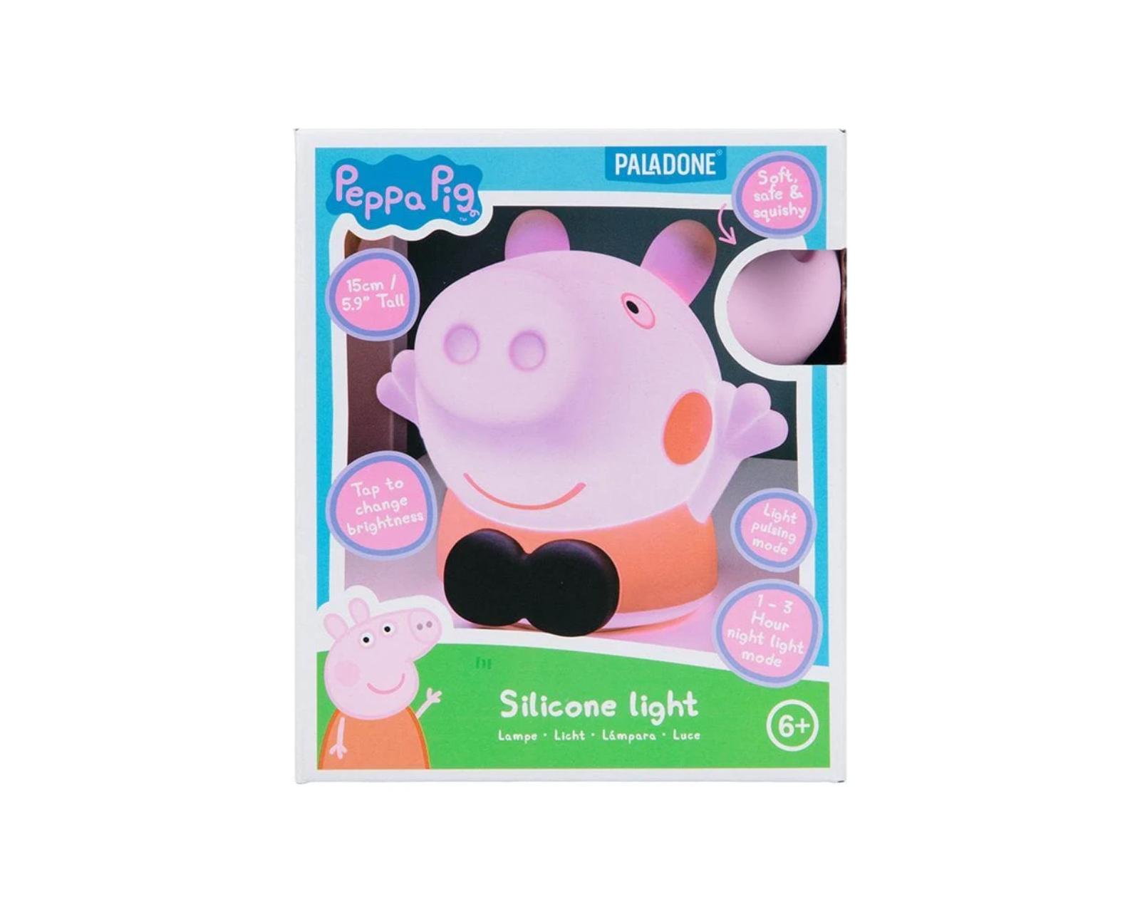Peppa Pig Silicone Lamp with Rechargeable Battery is a child-friendly night light designed to provide a soft and pleasant light. The lamp is shaped like the popular cartoon character Peppa Pig and is made of and soft silicone material. It has a height of 15 cm, which makes it easy to place in different environments. It is particularly suitable for children's rooms, making it a practical solution for parents who want to create a safe sleeping environment for their children.The lamp offers three different brightness levels that are easily adjusted by pressing Peppa Pig's head. It has an automatic shut-off function that turns off the light after 1 to 3 hours depending on the setting, which can help children sleep undisturbed. With a built-in rechargeable battery, wireless use is possible, which provides both flexibility and ease of use. The lamp is easily connected via the included USB charging cable. This allows it to be charged through many different devices, which increases accessibility and practical use.