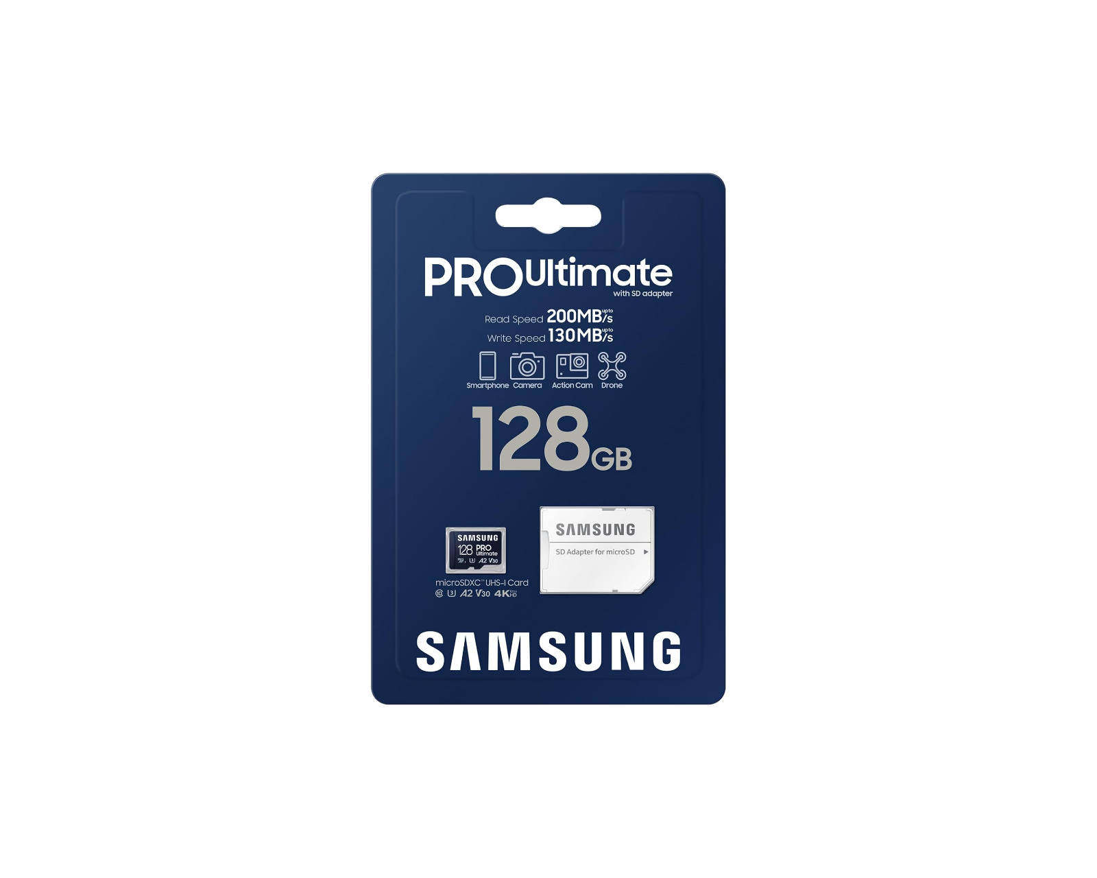MicroSD PRO Ultimate is a high-performance memory card from Samsung, designed to meet the needs of gamers and creators. With an impressive storage capacity of 128 GB, this card allows for the storage of up to 7.5 hours of 4K/UHD video or 67,518 photos in FHD. Equipped with a read speed of up to 200 MB/s and a write speed of 130 MB/s, this card is perfect for smartphones, drones, and action cameras.The PRO Ultimate card offers robustness and versatility, with six protection features including waterproofing, temperature resistance, x-ray safety, and shock resistance. It has dimensions of 15 x 11 x 1 mm and weighs only 0.26 g, making it both lightweight and easy to carry. With its UHS-I U3 rating, it guarantees high speed for 4K/UHD and burst photography, allowing users to capture and store the most intensely detailed moments without compromising performance.