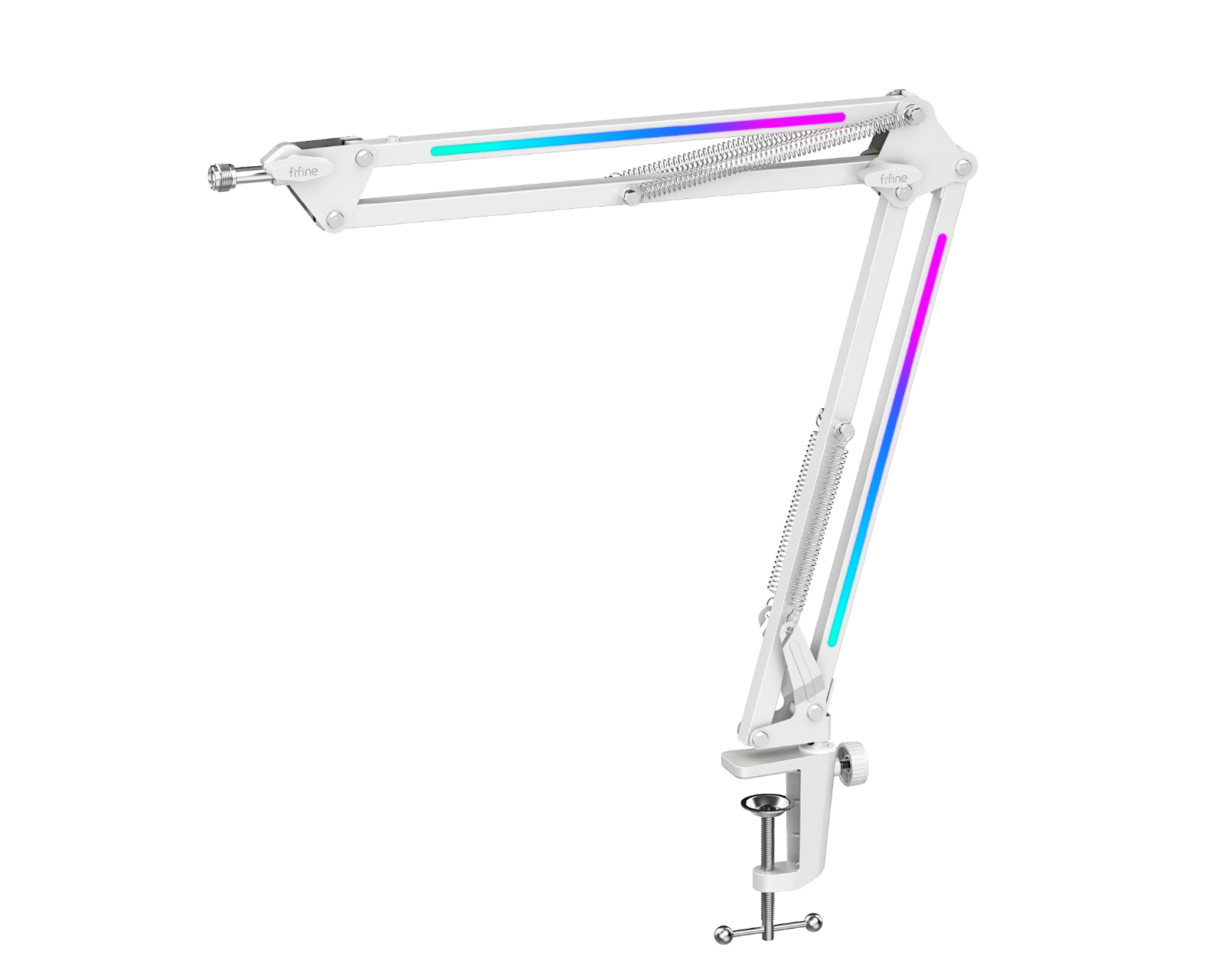BM38 RGB Metal Microphone Arm is a microphone arm from FIFINE that offers adjustable placement and RGB lighting for an enhanced user experience. It features a thick steel construction that ensures stability and can support microphones weighing up to 1.5 kg. It is aimed at gamers and podcasters who seek a flexible and durable solution for their microphones.The microphone arm is made of reinforced steel and designed to withstand high-intensity use without losing stability. The RGB lights can be adjusted with a button on the arm, allowing the user to switch between over nine color modes. Additionally, the arm has a 180° flexible section and a 360° swivel base that allows for precise adjustment of the microphone's position. Installation is tool-free and avoids unwanted damage to the desk thanks to a silicone pad on the clamp. The product is also compatible with most microphones through included screw adapters for 3/8” and 5/8”.