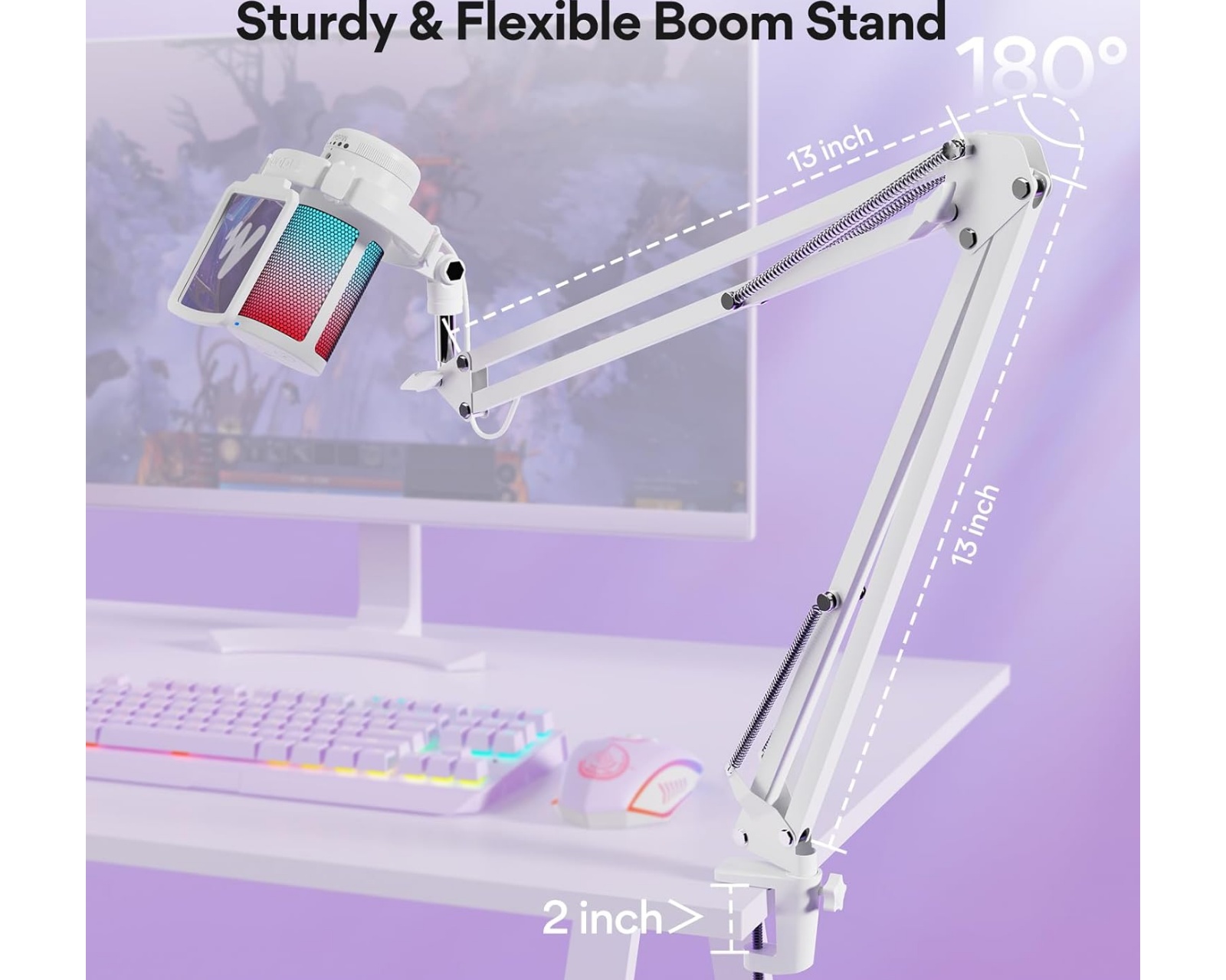 DGM20S is a gaming microphone from Maono that offers noise reduction and real-time monitoring. It features a unidirectional polar pattern that focuses on capturing sound from in front of the microphone, providing better sound quality and accuracy for streaming or voice recording. The microphone is equipped with RGB lighting that can be customized to nine different modes, allowing gamers to adjust the color of the light to match their gaming environment. The microphone is made from durable materials and has a stable construction.It comes with a metal arm that can be adjusted in various ways to fit your setup, as well as a shock mount and a pop filter. It connects via USB and USB-C, making it compatible with Windows, Mac, PS4, and PS5. A dedicated mute button and volume control provide easy use during streaming or recording. The microphone is plug & play, meaning it is ready for use immediately upon connection.