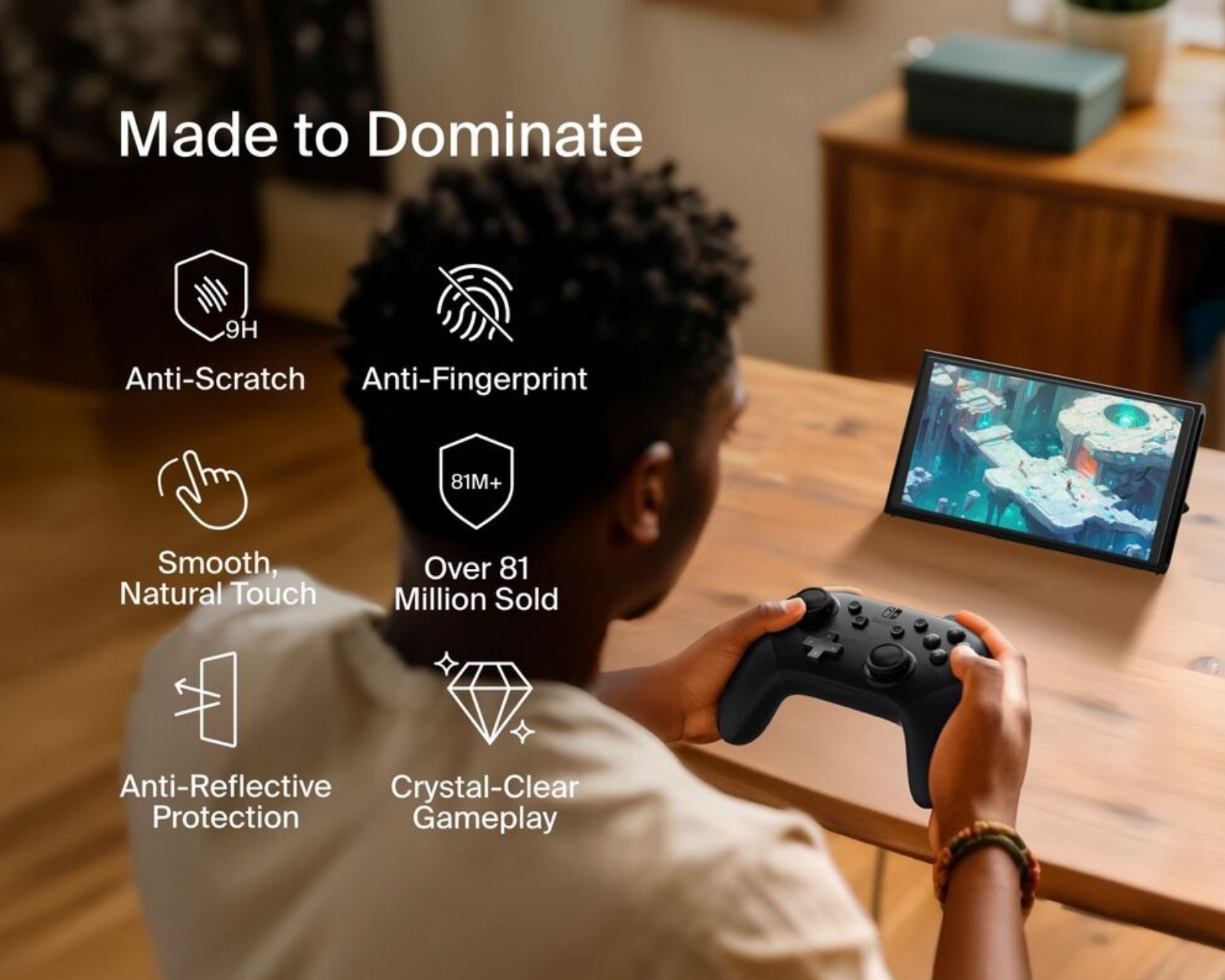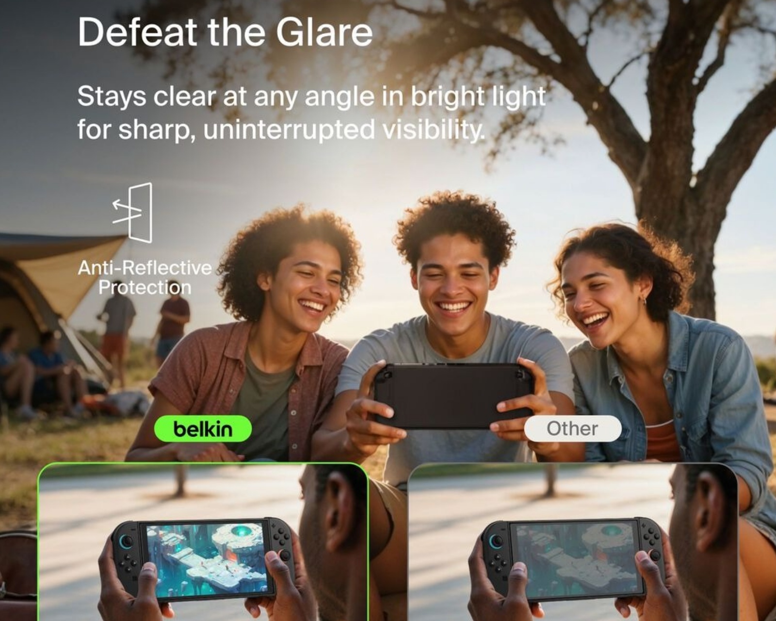 Antireflective Screen Protector for Nintendo Switch 2 is a product from Belkin that offers protection while preserving the screen's colors and sharpness. The screen protector is specifically designed for the latest model of Nintendo Switch and has a 9H hardness, providing robust protection against scratches and dirt. It is suitable for gamers who want to ensure that their device is safe during gameplay, whether indoors or outdoors.The screen protector is made of high-quality tempered glass with a thickness of only 0.33 mm, which maintains the original touch response for seamless gaming. The anti-reflective surface allows use in various lighting conditions. The screen protector also has an anti-fingerprint coating that keeps the screen clean and free from dirt. The included Easy Align frame makes installation easy and bubble-free. The product's environmentally friendly aspects include the use of 60% PIR glass and a 70% PCR frame.