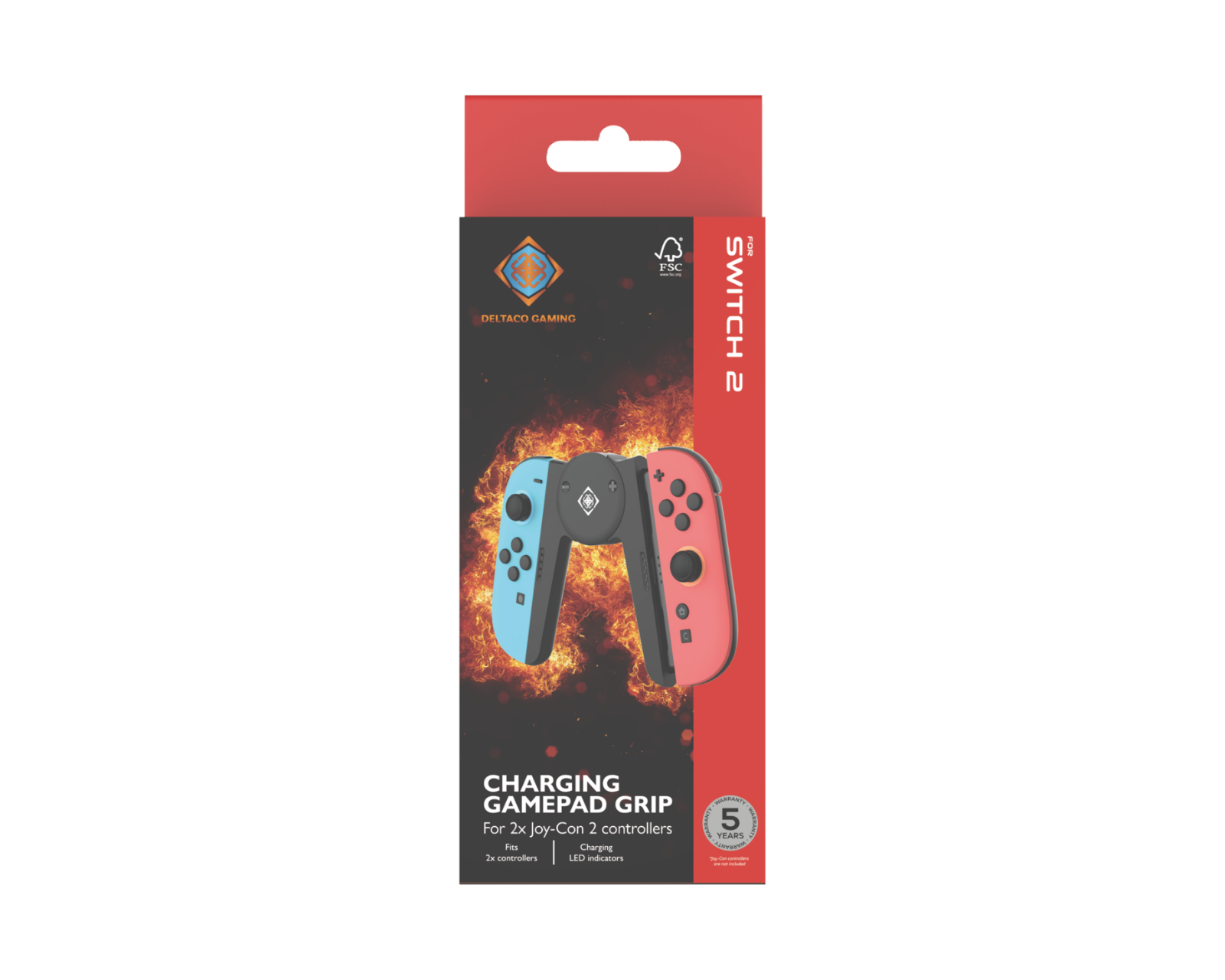 Grip and charging station for Joy-Cons from Deltaco Gaming that offers easy charging and convenient handling of Nintendo Switch 2's Joy-Con controllers. It is designed to accommodate two Joy-Con controllers and provides an ergonomic grip design for better comfort and control during gameplay. LED indicators show the charging status, and the magnetic attachment method allows you to easily use the product.The product is built to enhance gaming sessions by providing a more traditional feel of a game controller. The ergonomic design enables longer gaming periods without discomfort, making it ideal for both single-player and multiplayer situations. With the sleek and functional construction, a stable and secure grip during gameplay is ensured. The charging indicators provide quick feedback on the device's status, contributing to user-friendliness.