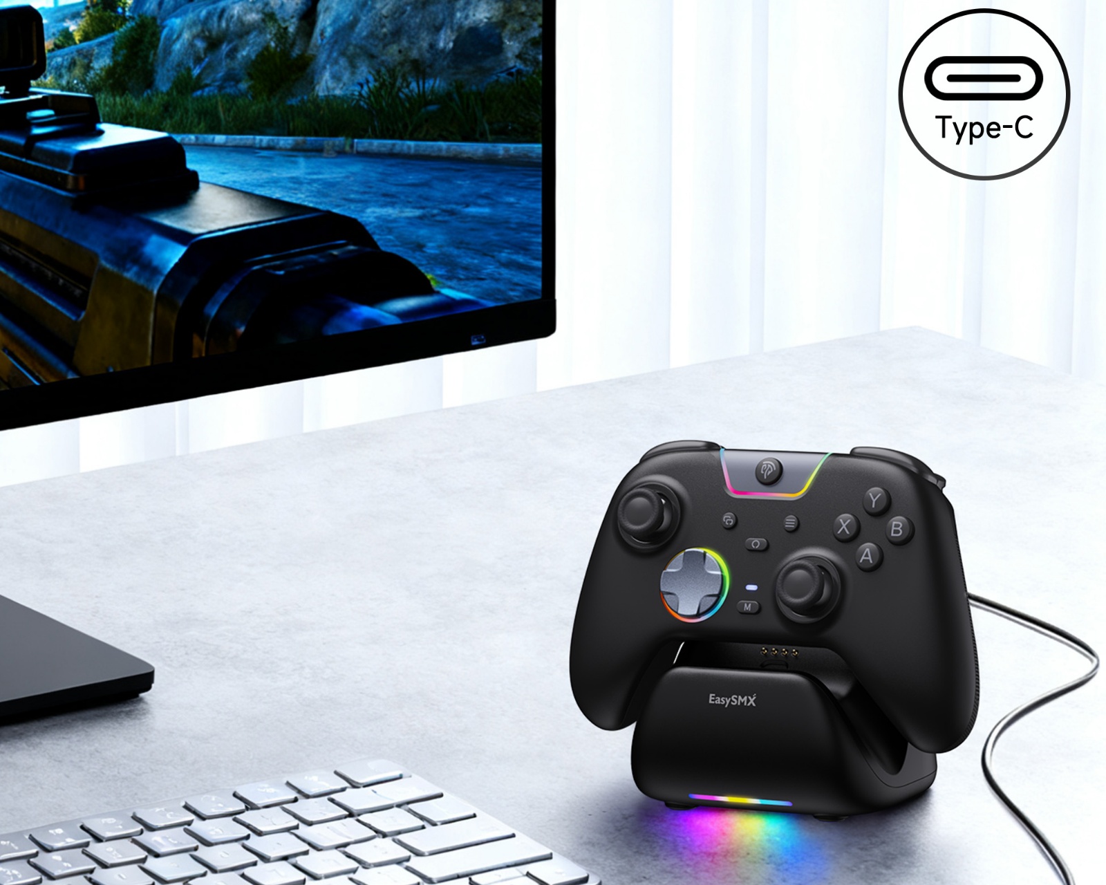 EasySMX X05Pro Charging Dock is a docking solution aimed at users of the EasySMX X05Pro wireless controller. The product offers a secure and form-fitting stand that stabilizes the controller and is easy to use with a USB-C connection. The dock is designed to provide a clean and reliable power source without complicated installations.The dock is equipped with a dedicated compartment for storing the wireless receiver, which prevents the loss of important components. The stable, non-slip base with silicone pads ensures that the dock stands safely on all surfaces, minimizing the risk of it sliding or tipping over during use. An elevated viewing angle allows the controller to be easily displayed on desks, shelves, or in gaming rooms.