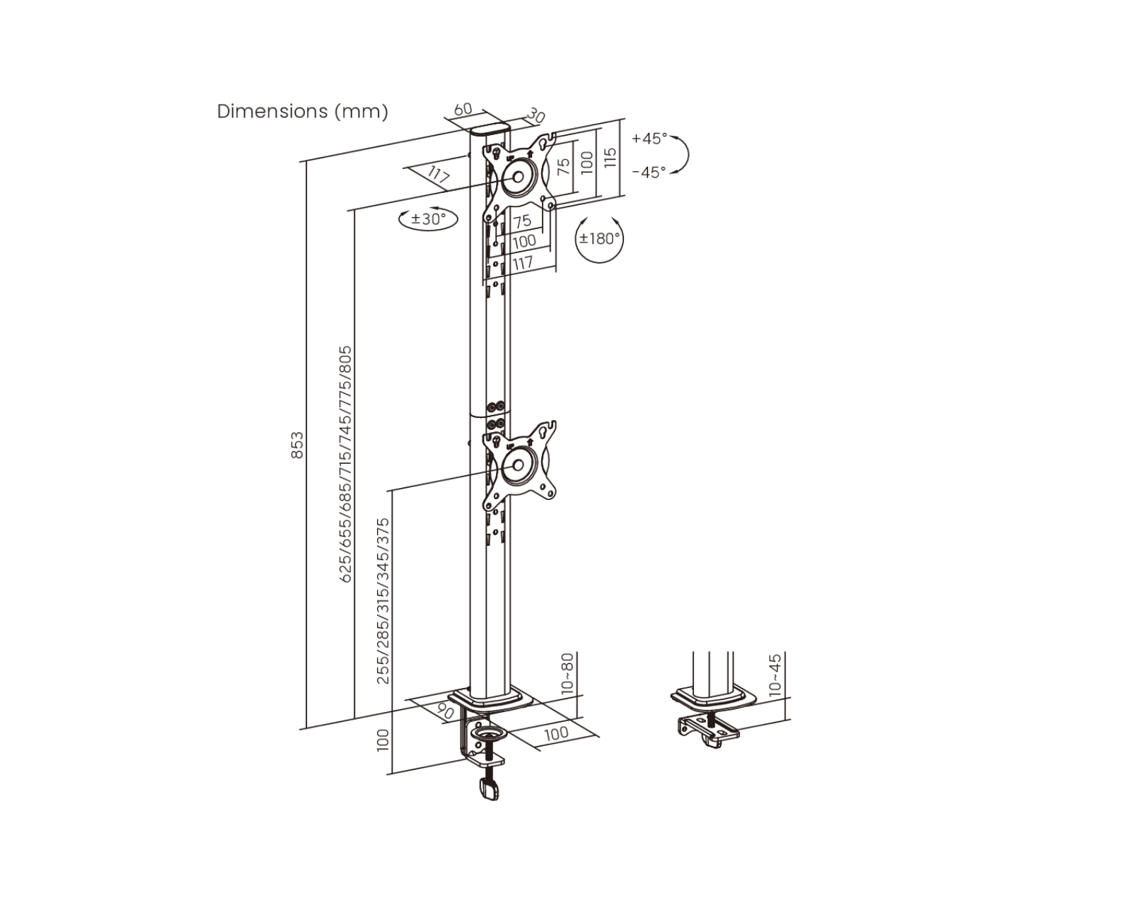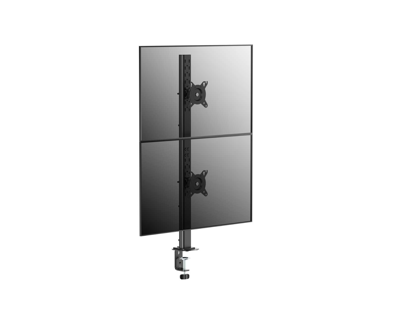 MaxMount Vertical Desk Mount for 2 Screens 17"-34" 12 kg is a robust solution from MaxMount, designed for gamers and professional users who require optimal screen space. This desk mount allows the placement of two screens in a vertical manner, providing an ergonomic workspace and freeing up valuable desktop space. The stand supports monitors with a maximum weight of 12 kg and has VESA mounts for both 75x75 mm and 100x100 mm.The vertical stand is made of durable steel and offers extensive adjustment options, including tilt up to +45°/-45°, swivel range of +30°/-30°, and 360° rotation for easy switching between landscape and portrait mode. With tool-free installation, no additional accessories are required, making it easier to find the perfect position for each screen. Cable management is kept organized with included cable clips, contributing to a clean and professional setup. Thanks to the compact packaging size, this is also a more environmentally friendly choice for e-commerce customers.