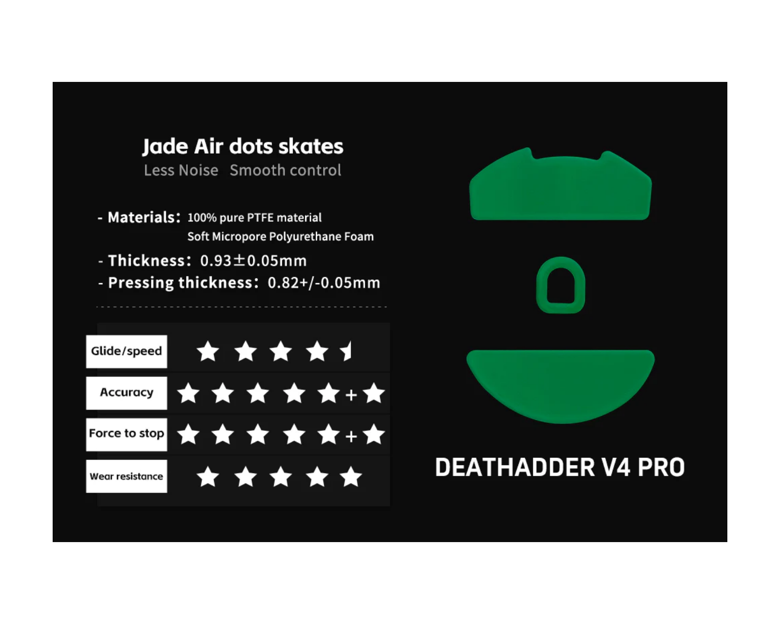 Jade Air Skates are a set of mouse skates from X-raypad designed for the Razer Deathadder V4 Pro. These skates offer a smooth and silent control and are made of PTFE material, providing a slick surface and precise fit that allows the mouse to move effortlessly. The skates are compatible with both cloth and plastic mouse pads, making them versatile for different usage scenarios.The choice of materials and build quality contributes to an improved user experience by minimizing noise levels during use. The stable and controlled glide facilitates precision in gaming as well as office work. The package includes two sets of skates, two alcohol pads, and two cleaning wipes for adhesive removal, making installation and maintenance easy.