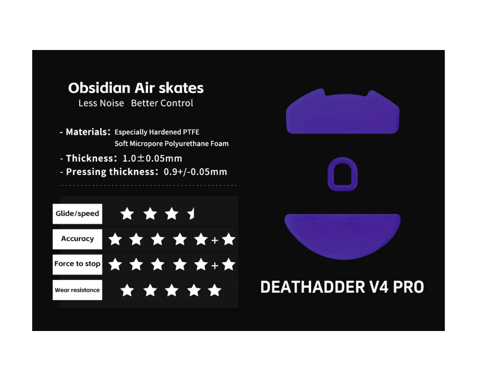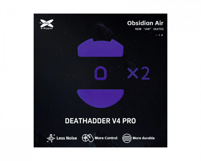 Obsidian Air from X-raypad is a set of mouse skates for Razer Deathadder V4 PRO that improves control and reduces noise levels during use. Designed to increase friction for fabric and glass mouse pads. The refined PTFE material ensures a significant improvement in braking ability, enabling better control and quick stops in critical situations.The carefully designed surface structure provides an optimal balance between glide quality and control, making it particularly useful for gamers who require high precision. The skates are suitable for both long-term use and intense gaming sessions. Each package contains two sets of skates.