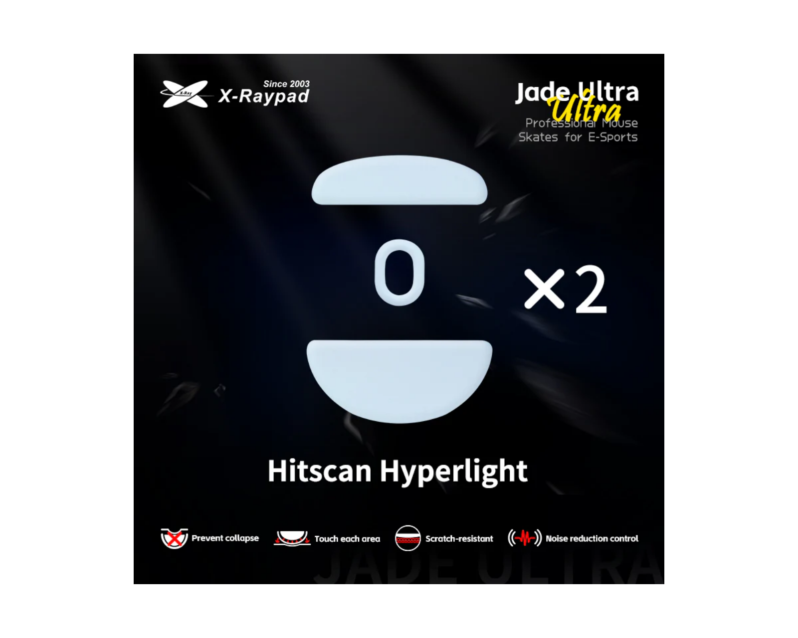 Jade Ultra Skates for Hitscan Hyperlight are non-slip mouse feet from X-raypad, designed to enhance the user experience during gaming. With a thickness of 1 mm (+/-0.1mm), these skates feature a pure PTFE surface that allows the mouse to glide smoothly over the surface. The product is designed for gamers seeking high precision and reduced friction, which is critical during fast-paced gaming moments. The skates are adapted for both cloth and plastic mouse pads, providing flexibility and use on various surfaces.Jade Ultra Skates are constructed with an extra anti-collapse moisture-wicking filling layer that helps prevent sagging and filling of the skates during heavy use. The surface is scratch-resistant and withstands wear, extending the lifespan. At the same time, the acoustic damping technology results in reduced noise and vibrations during use, increasing comfort and focus for the user.