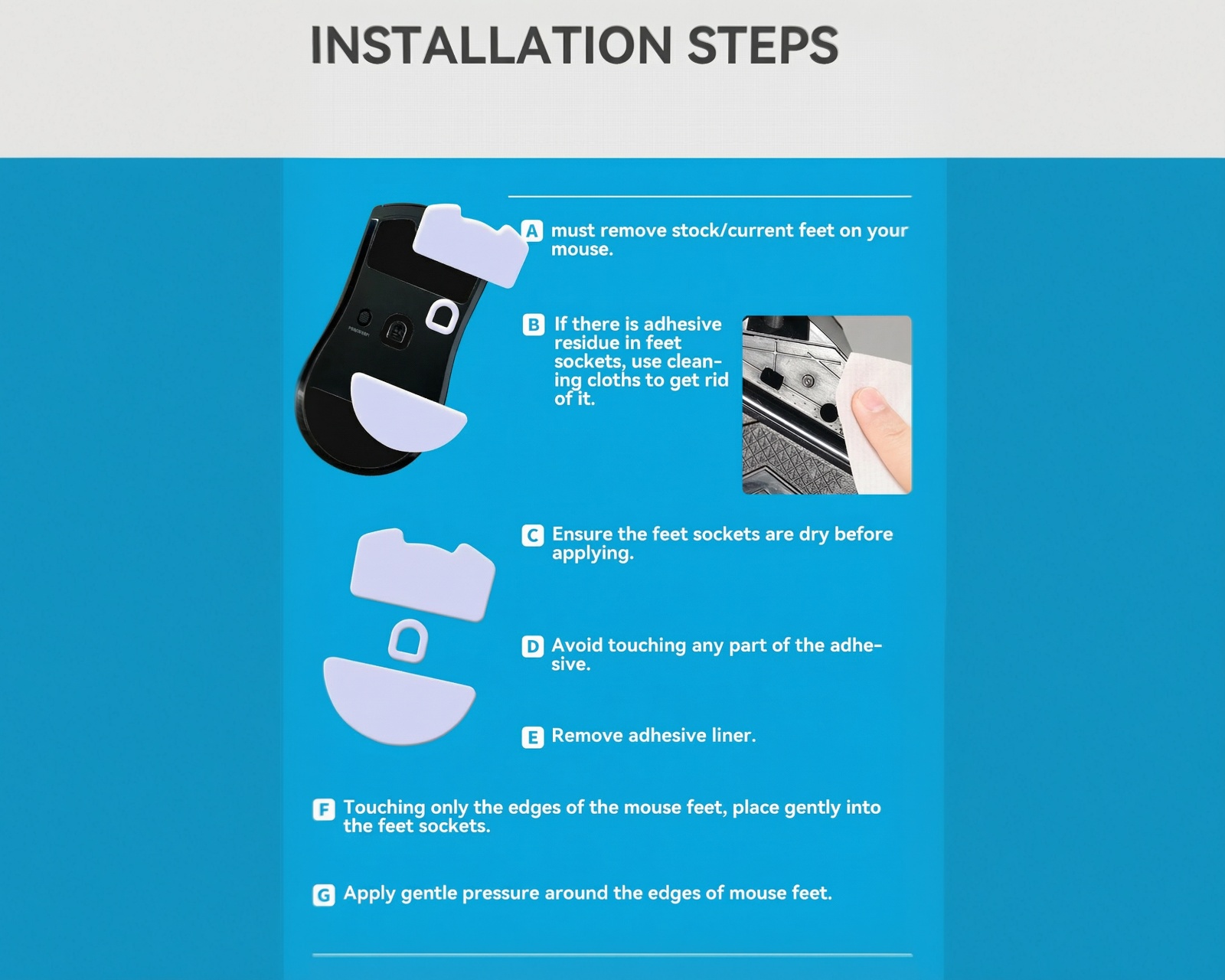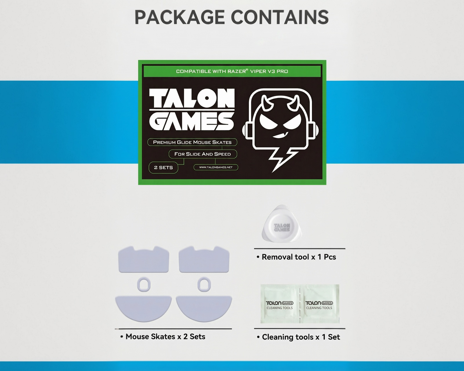 Mouse Skates from TalonGames offers a high-quality solution for increased precision and control during use. These mouse feet are made from a specialized Teflon material with a carefully calibrated thickness, providing smooth and consistent gliding. By replacing the original feet on your mouse, you can significantly improve your gaming performance.The product is made from 100% virgin PTFE material, which minimizes friction and is environmentally friendly. The rounded edges on each foot allow for durable gliding as well as easy installation with 3M’s adhesive to avoid residue. The well-balanced thickness has been fine-tuned to accommodate the durability and accuracy of the mouse's sensor, which is important for players with varying play styles. These feet also enhance the gaming experience by reducing grip tension and wrist strain during long sessions.
