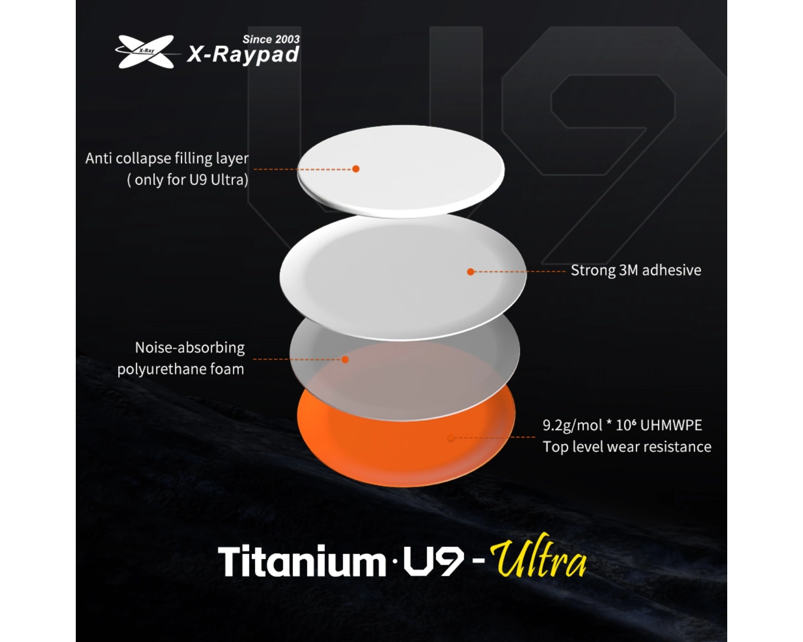 The U9 Ultra 8mm are dot skates from X-raypad, combining high durability with stable performance. These skates are optimized for glass surfaces and are also compatible with cloth mouse pads. Made of ultra-high molecular weight polyethylene (UHMWPE) in a multi-layer construction, they offer consistent aiming and ensure reliability with every move.The material is of the highest durability and provides a long life for use on various surfaces. The skates are designed to reduce wobbling movements and offer a stable and smooth experience for the gamer. Mobility is increased by the carefully crafted design that also includes a layer for noise reduction, which reduces friction noise and allows the user to focus better on the game. U9 Ultra is especially adapted for glass surfaces but also works excellently on fabric surfaces.