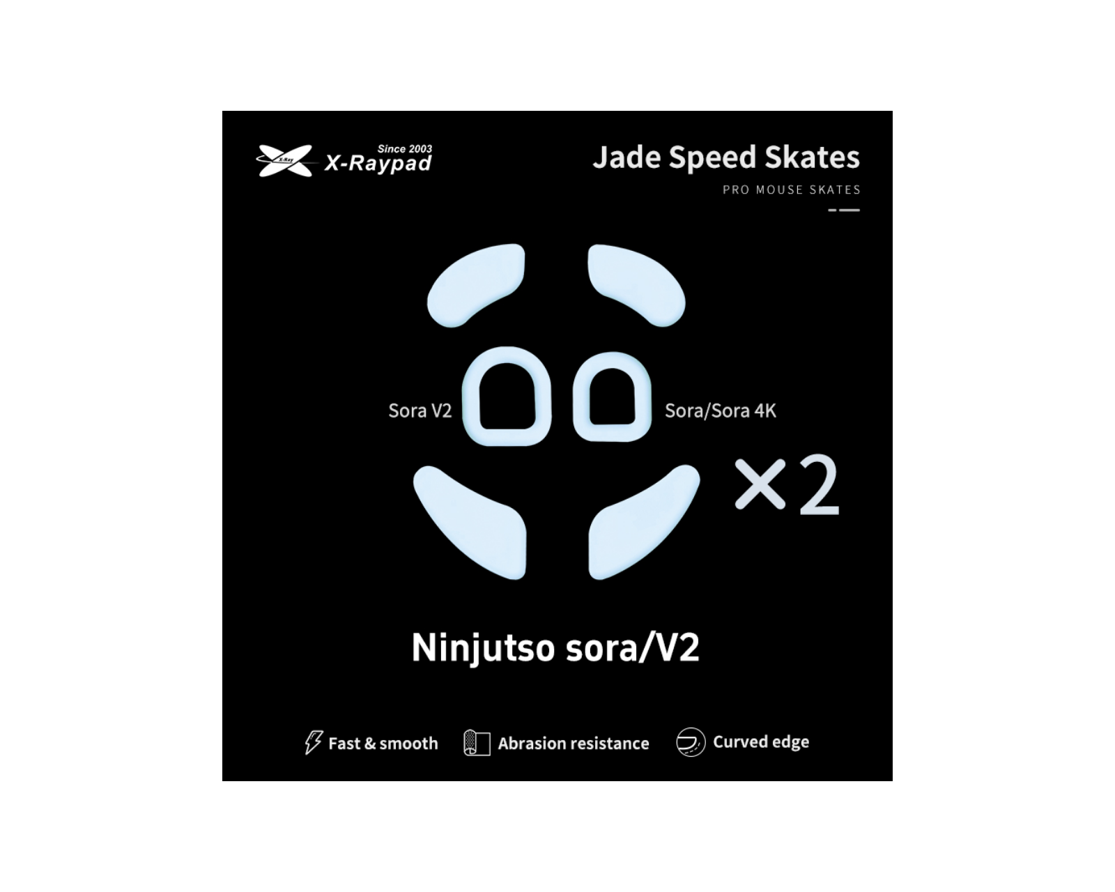 X-raypad Jade Mouse Skates are specially designed for Ninjutso Sora / 4K / Sora V2. These mouse feet are made of pure PTFE (polytetrafluoroethylene), which provides a durable and glide-friendly surface for improved performance. With their precise dimensions, a perfect fit is ensured, allowing for quick and smooth movements during gaming or work. Best suited for users looking for higher precision and speed in their mouse movements.These mouse feet utilize integrated Ice Glide technology that minimizes friction against the mousepad, increasing response time and the user's control over the mouse movements. Jade Mouse Skates are easily mounted on the existing mouse, saving time and providing a frictionless experience straight away. The material, PTFE, also offers long durability and resistance to wear. Additionally, the skates are tailored for both fabric and plastic mats, making them flexible to use depending on the player's preferences. However, it is recommended not to use them on glass surfaces as this may negatively affect performance.