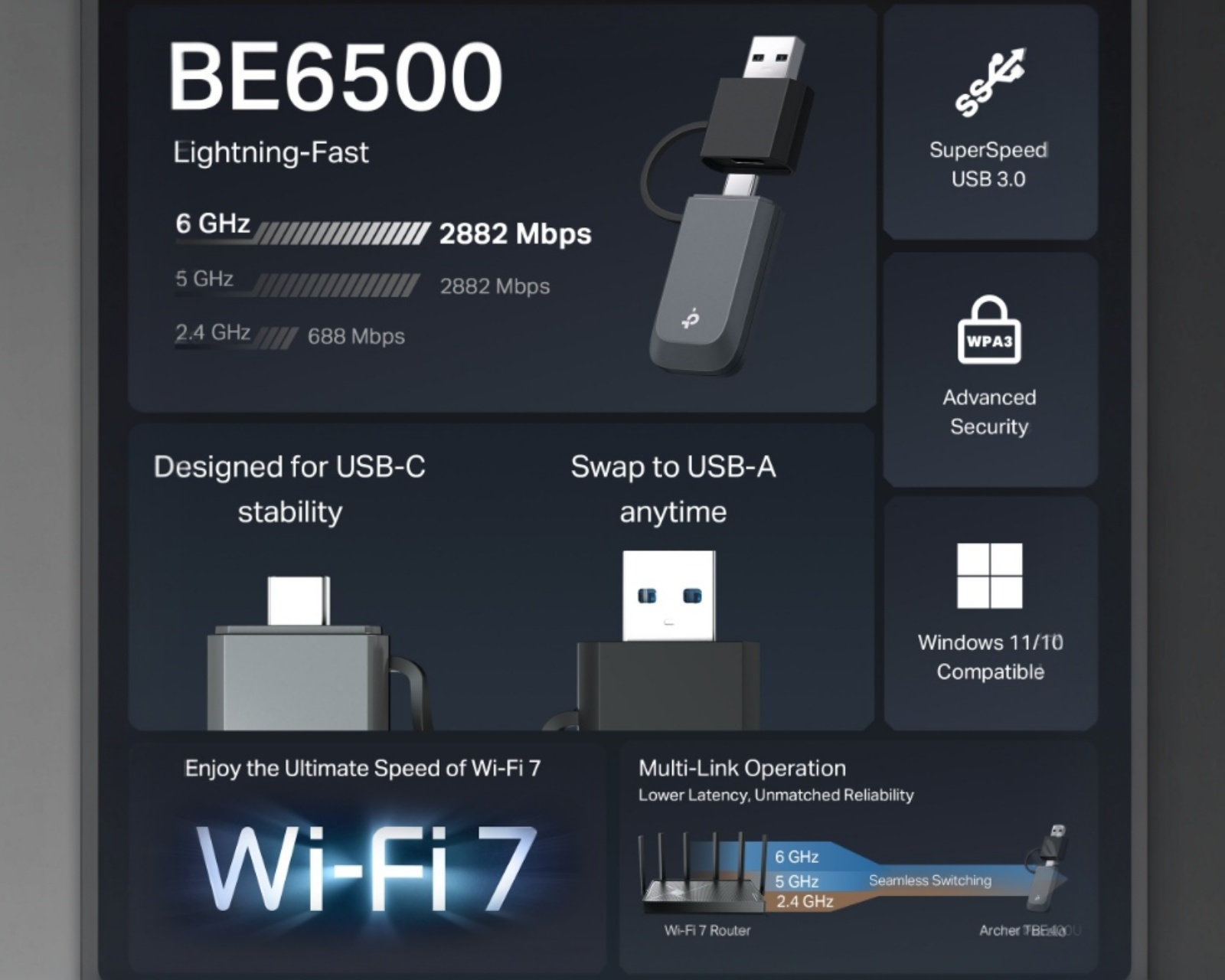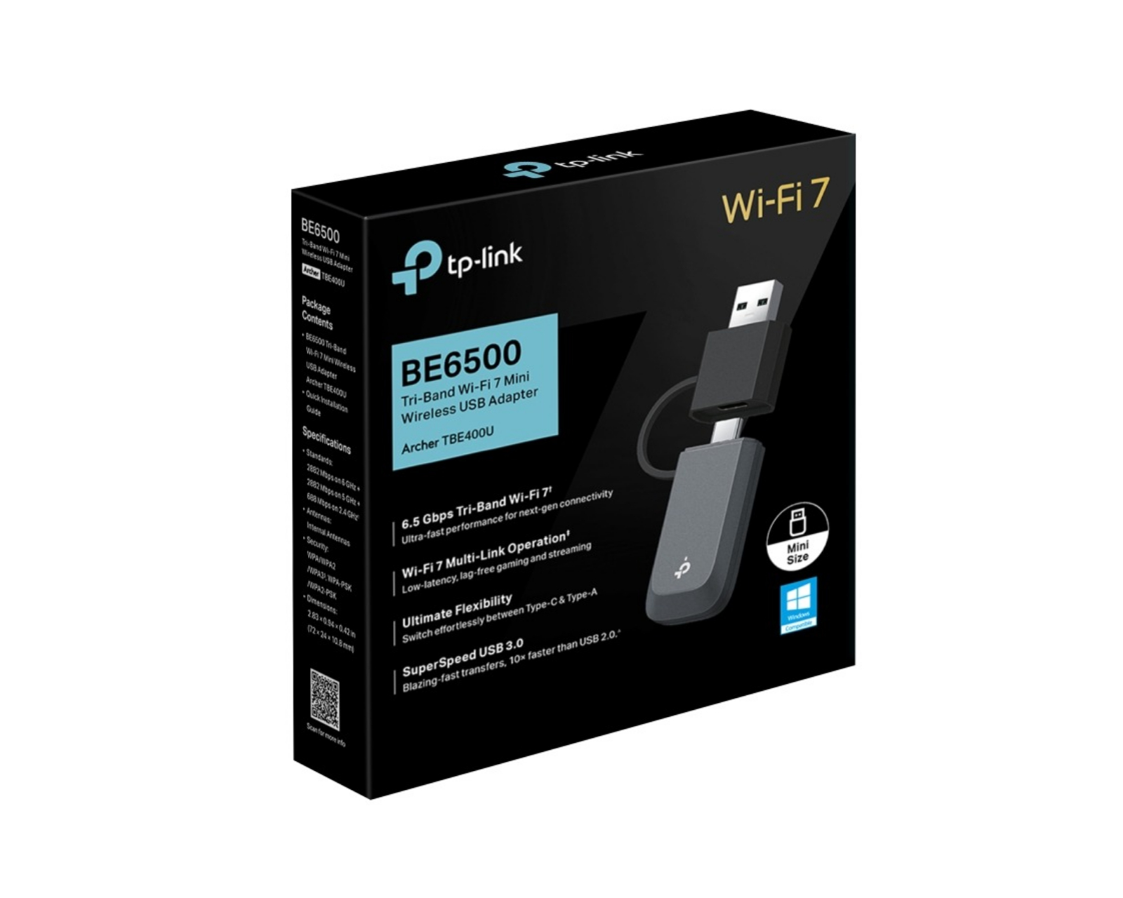Archer TBE400U BE6500 Tri-Band Wi-Fi 7 Mini is a wireless USB adapter from TP-Link that combines high performance with advanced technology. It is designed to provide a smooth and powerful wireless connection with speeds of up to 2882 Mbps on both the 6 GHz and 5 GHz bands while the 2.4 GHz band delivers 688 Mbps. The adapter's support for Wi-Fi 7 along with Multi-Link Operation ensures reduced latency and a stable experience for gaming and streaming.Archer TBE400U is designed with both USB-C and USB-A ports, providing users the flexibility to connect a range of devices without needing extra adapters. With SuperSpeed USB 3.0, users get up to 10 times faster transfer speeds compared to USB 2.0, making it perfect for large files and faster connections. The latest WPA3 security offers additional protection against unauthorized access and ensures that your data is secure. Installation is simple and requires no CD, making it plug-and-play compatible with Windows 10 and 11.