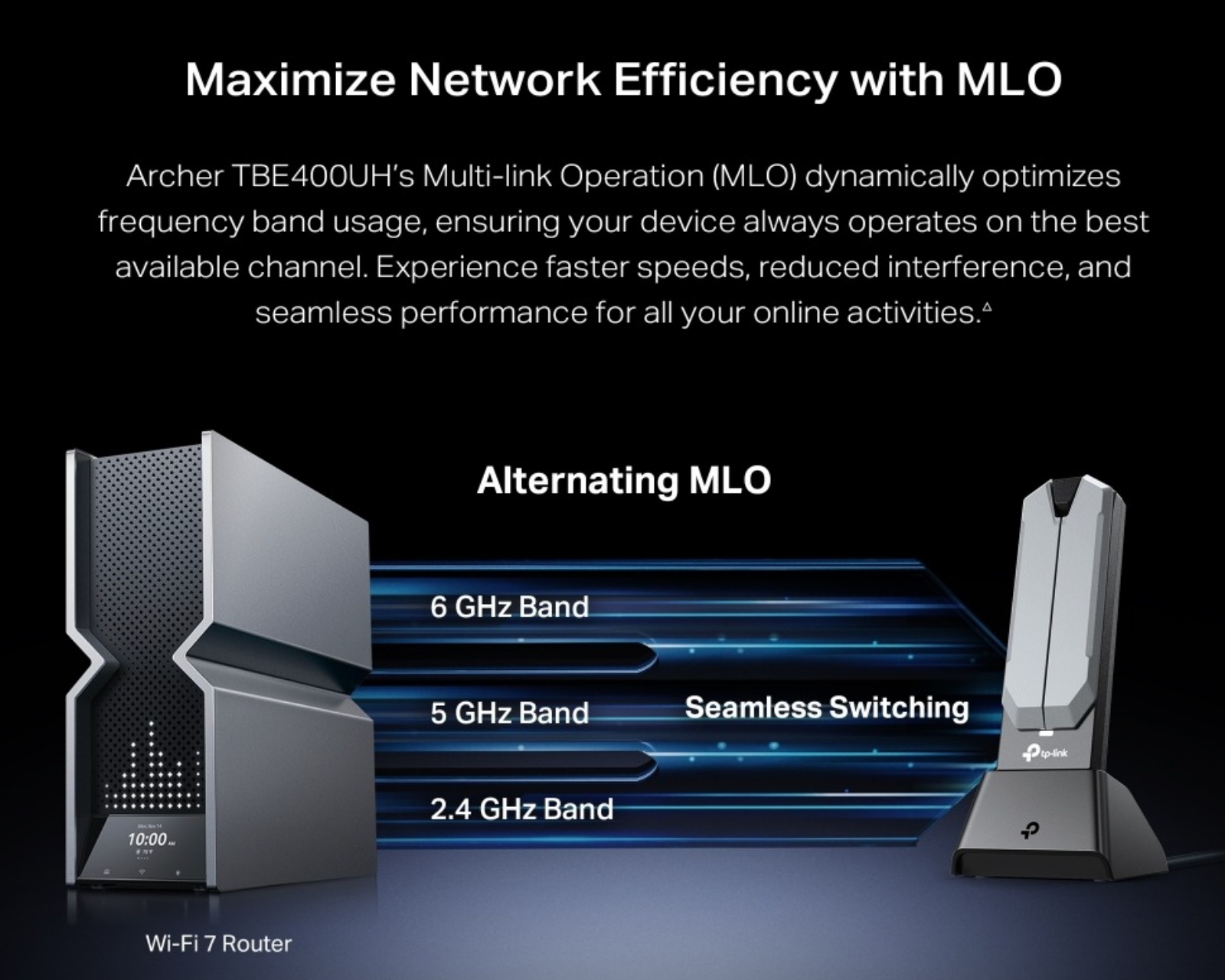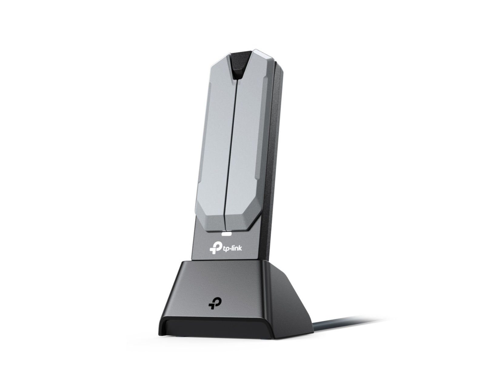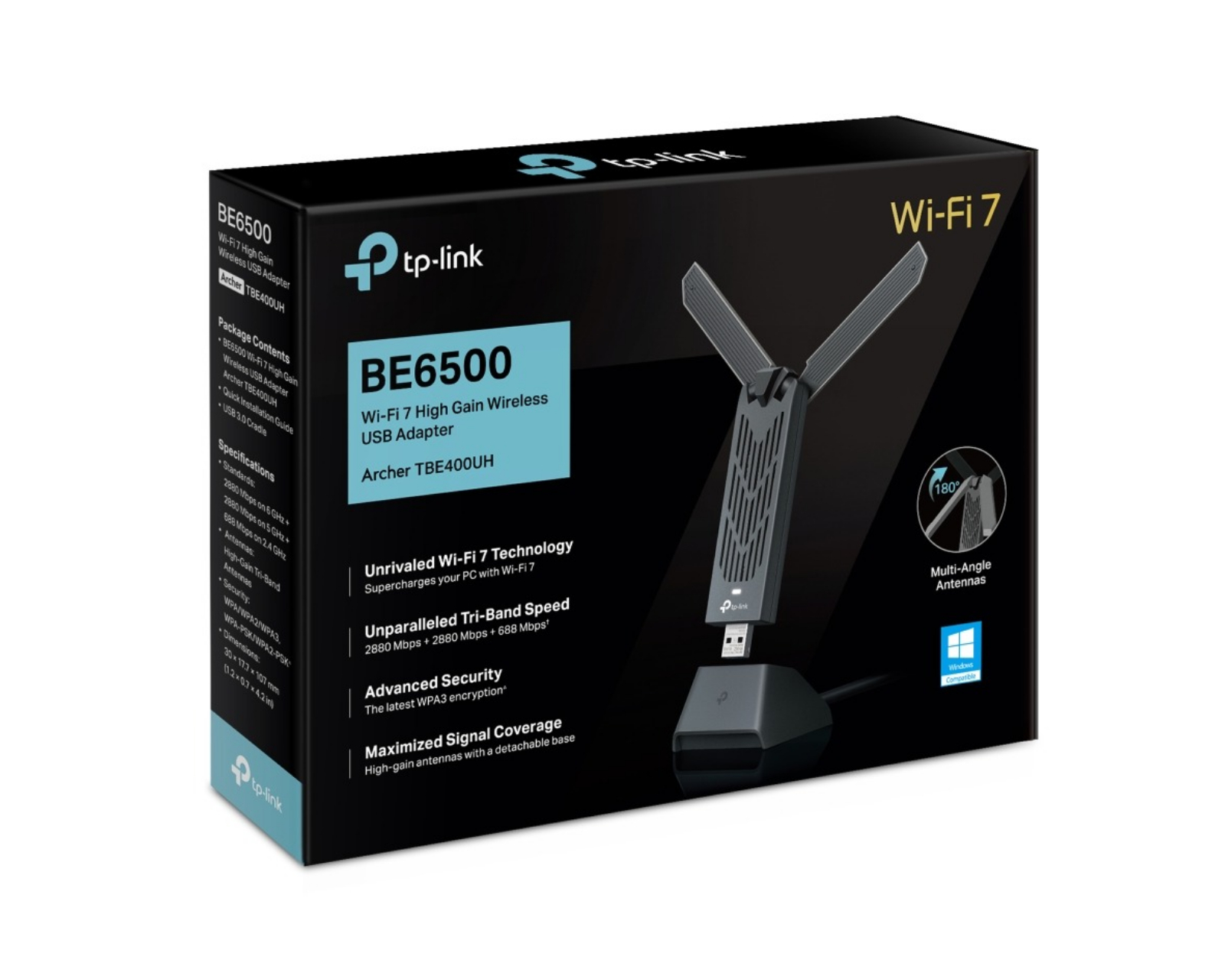 Archer TBE400UH is a high-performance wireless USB adapter from TP-Link, designed to deliver maximum speed and stability with Wi-Fi 7 technology. It offers speeds of up to 2882 Mbps on both the 6 GHz and 5 GHz bands, as well as 688 Mbps on the 2.4 GHz band. With tri-band connectivity and multifunctional operation, this adapter is tailored for high-intensity use and can easily connect multiple devices simultaneously.It is built with high-gain antennas and supports Beamforming to improve coverage throughout the home. TBE400UH leverages Multi-Link Operation to optimize the use of available frequencies, resulting in lower latency and less interference during gaming and streaming. With a USB 3.0 connection, users can enjoy data transfer speeds up to 10 times faster than with USB 2.0. The included cradle with a 1.2-meter long cable provides flexible installation and positioning.
