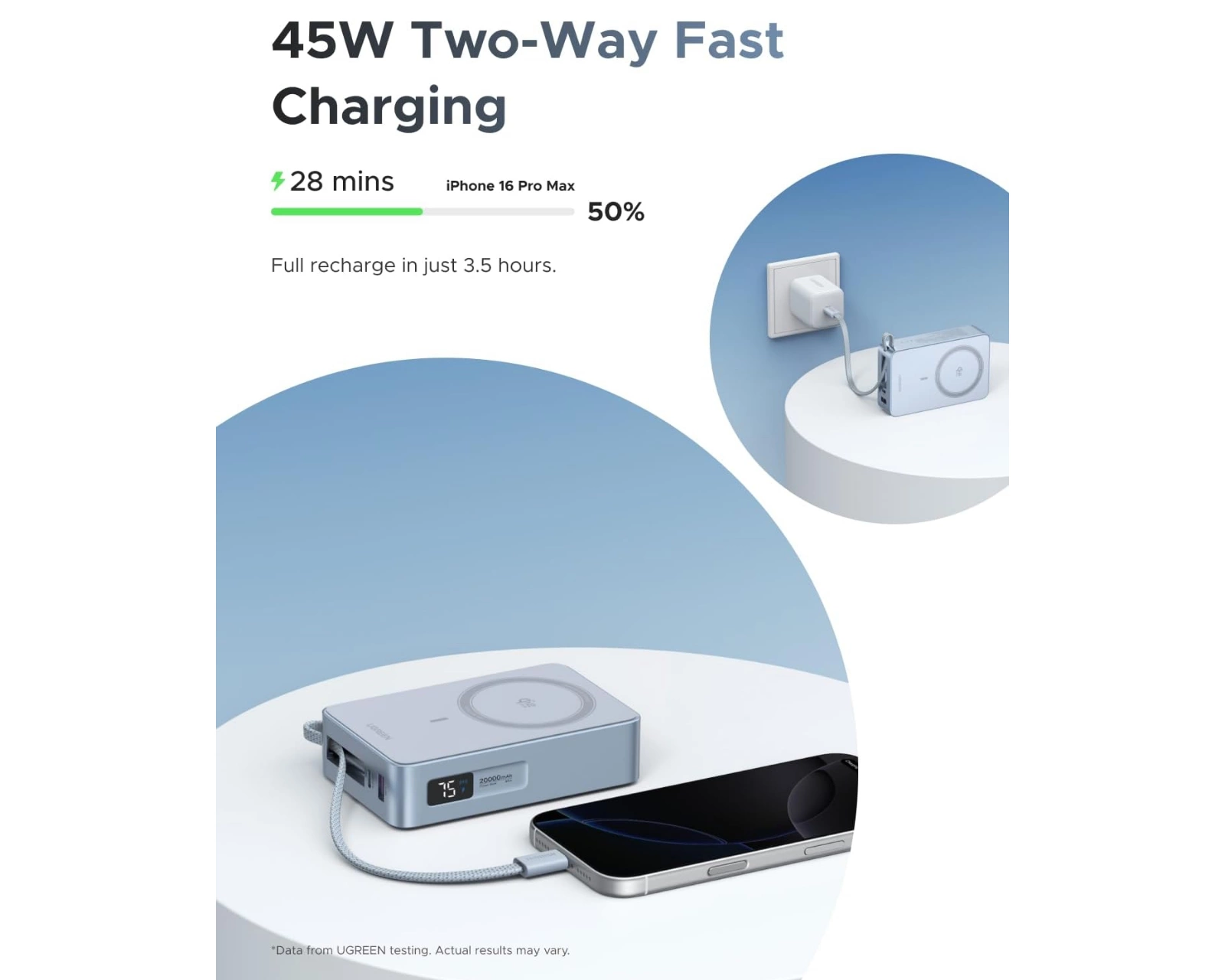 MagFlow Qi2.2 25W is a multifunctional power bank from UGREEN with a capacity of 20000mAh. It offers wireless charging with a maximum power of 25W, making it compatible with MagSafe and Qi2 standards. An integrated USB-C cable allows for both charging and power supply, with a maximum output of 100W. The power bank is equipped with N52 magnets that provide a strong and precise magnetic attachment, ensuring that the device stays in place during charging.It has multiple charging modes, including both wireless and wired charging, and is designed to be versatile, making it suitable for both smartphone users and computer users. With support for fast charging via USB-C ports, it can effectively charge devices such as MacBook, iPad, and iPhone. Safety features such as protection against overcurrent, overvoltage, and short circuit make it a safe choice for travel.